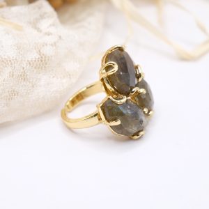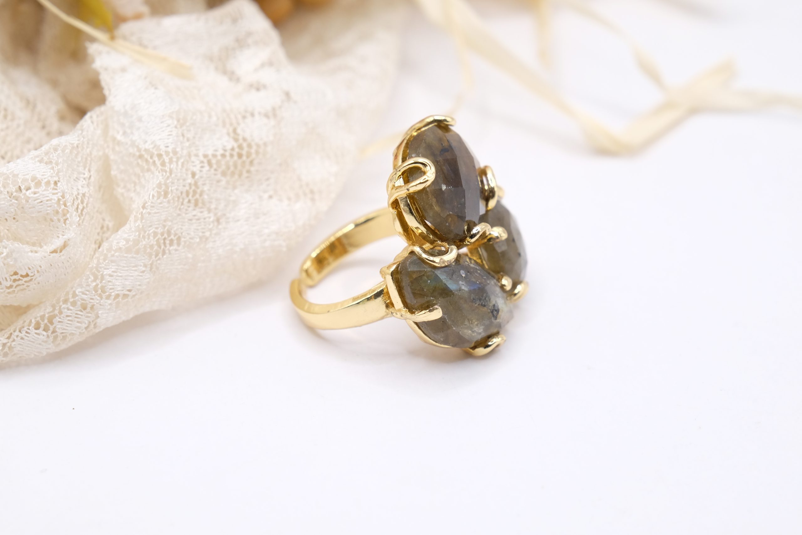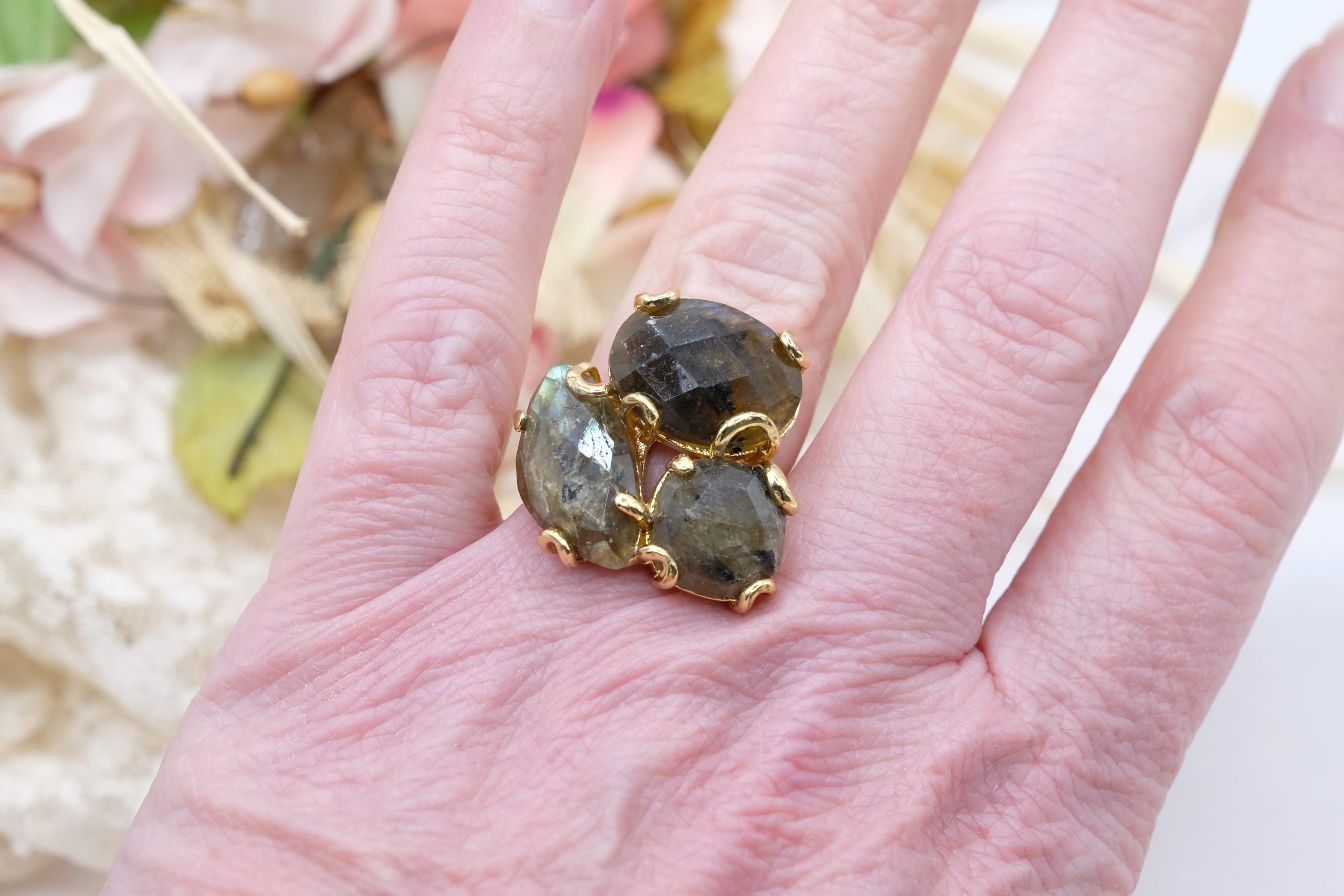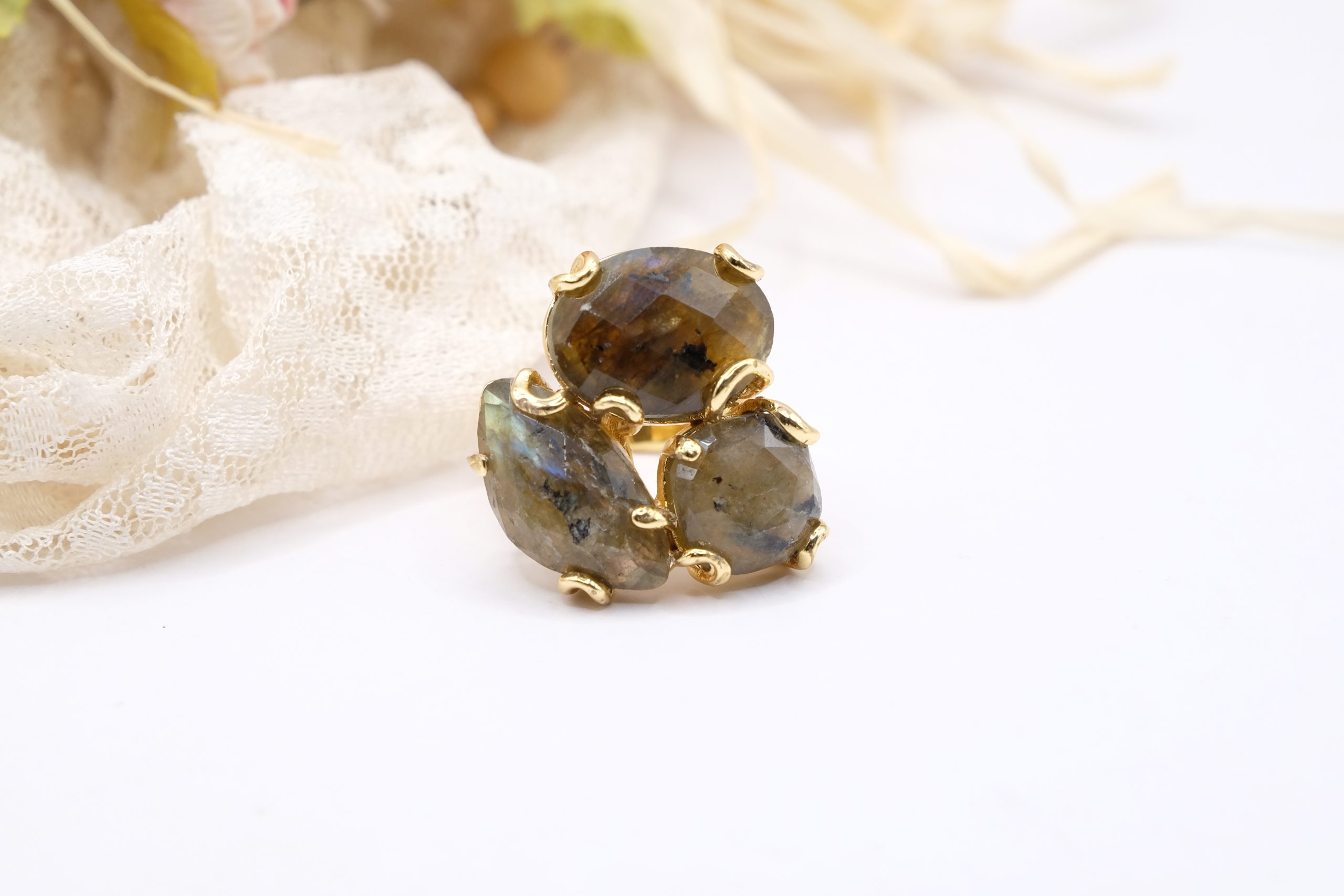 Elegant ring with 3 faceted labradorite stones on a brass setting