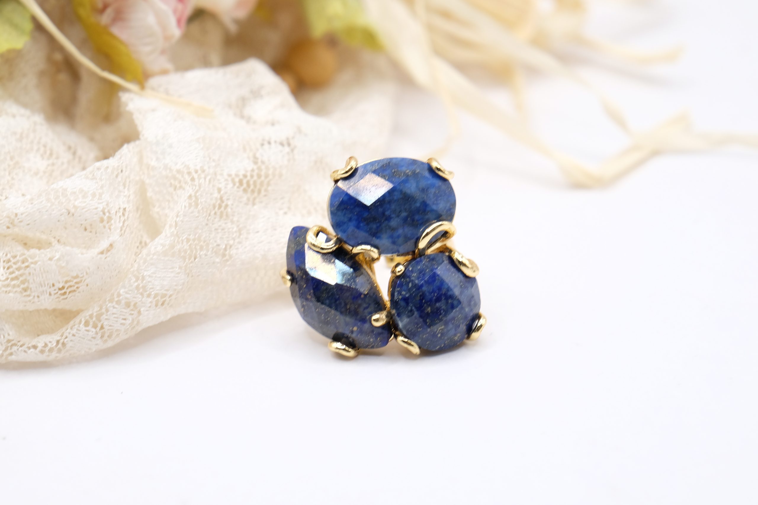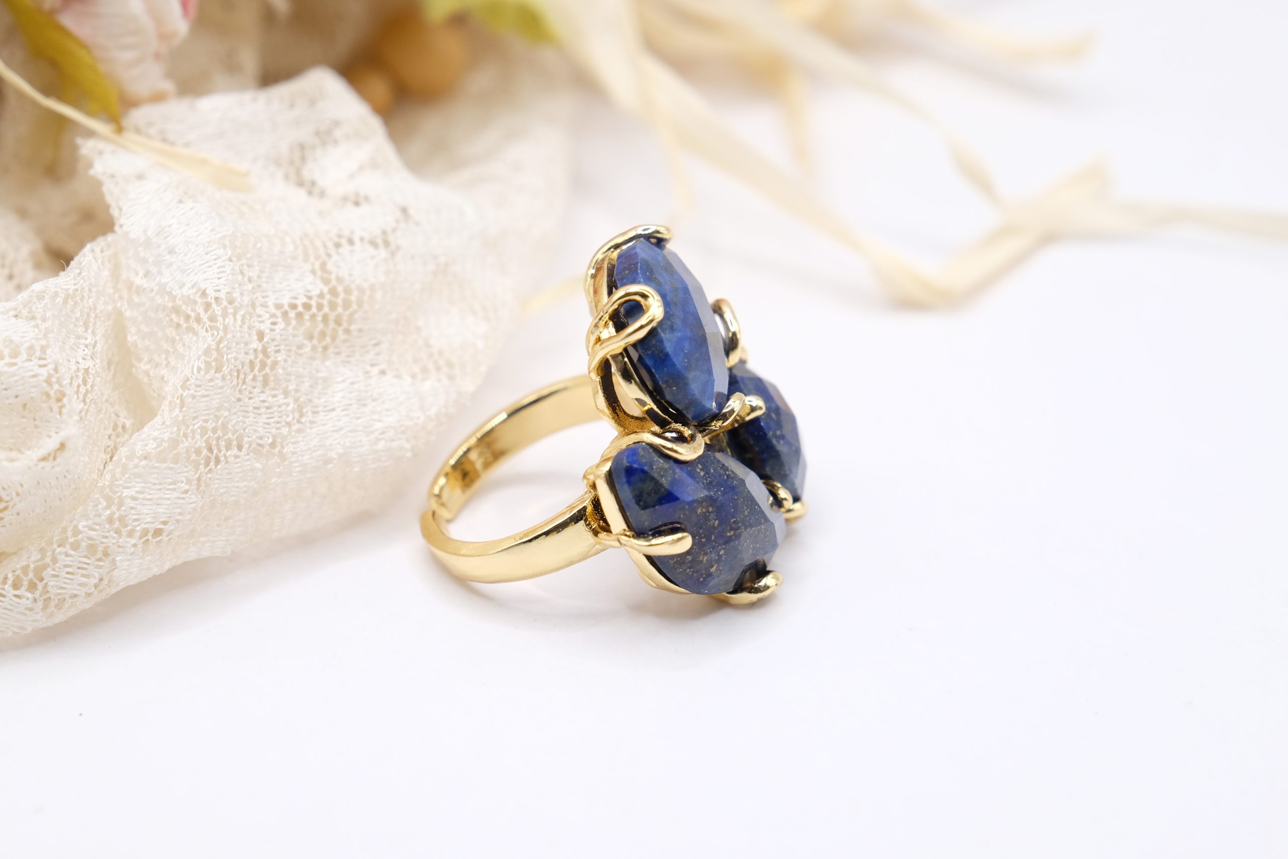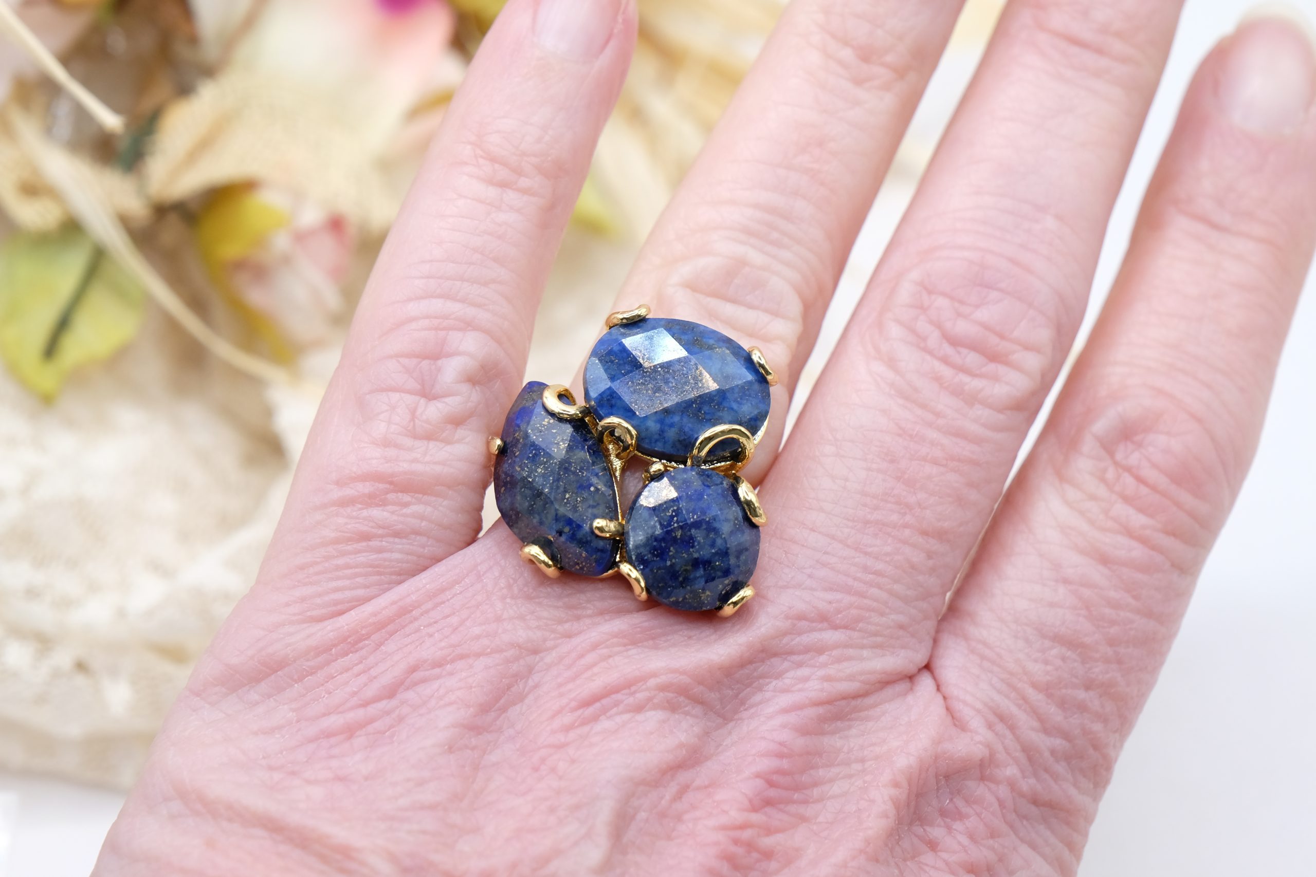 Elegant ring with 3 faceted lapis lazuli stones on a brass setting