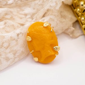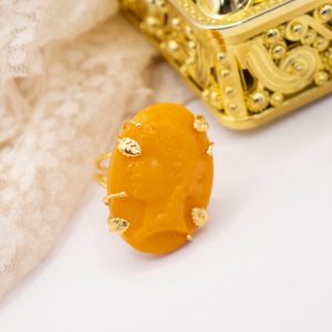 Ring with ancient Baltic amber, hand-engraved with the head of a Greek deity and set in 925 silver plated with 18 kt gold.