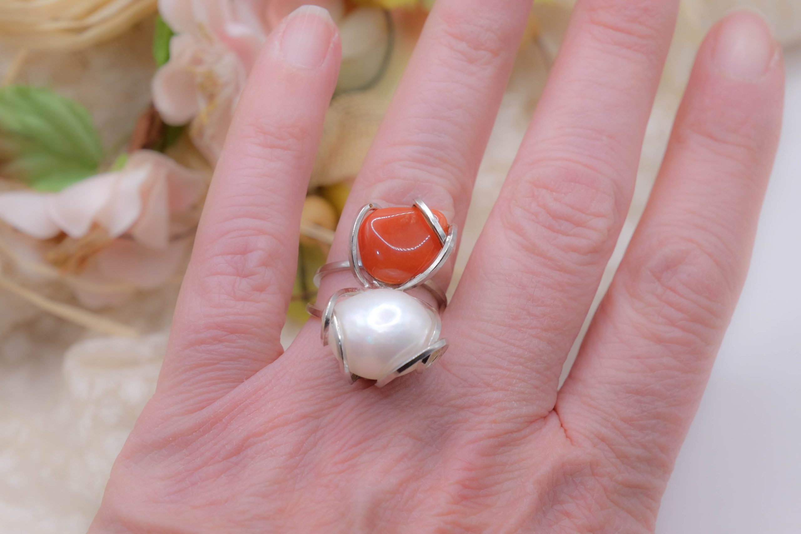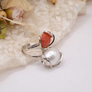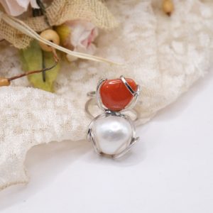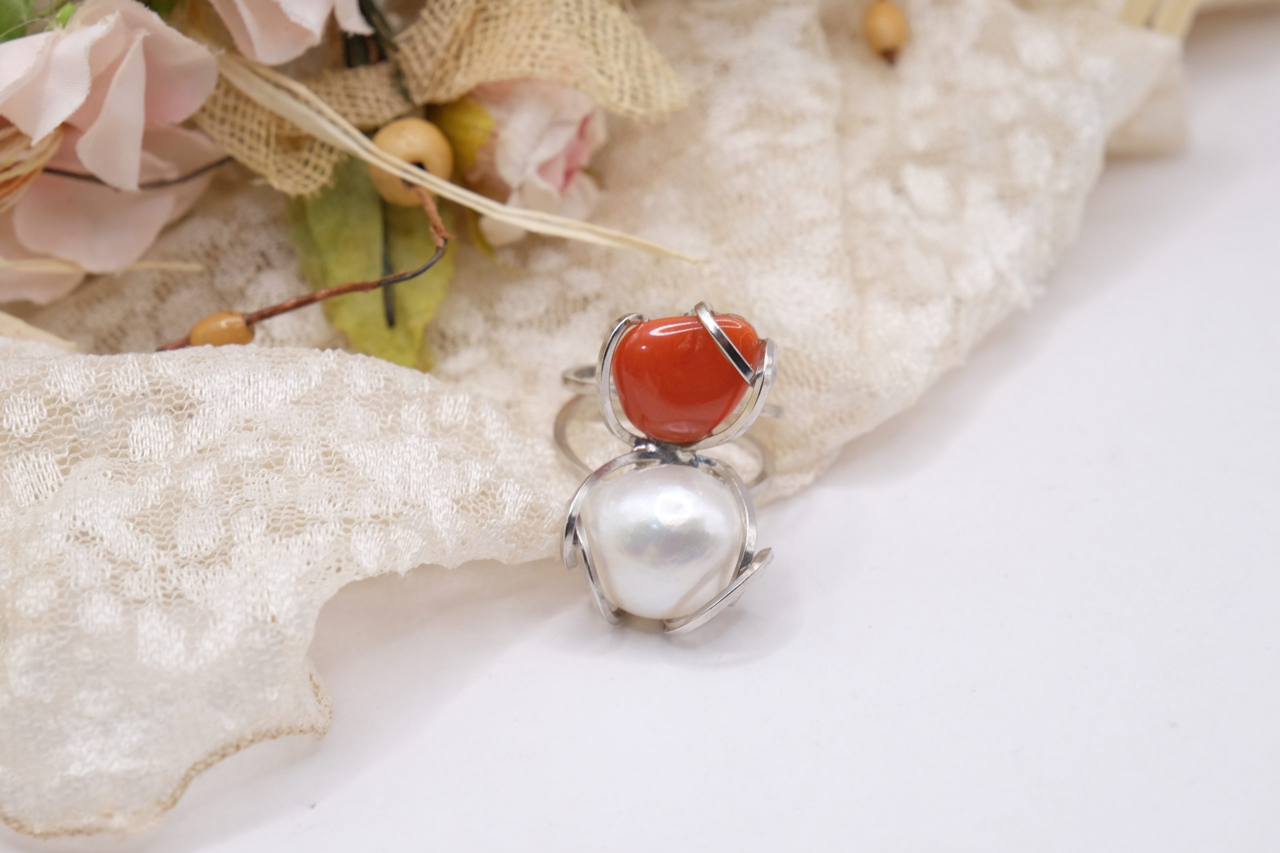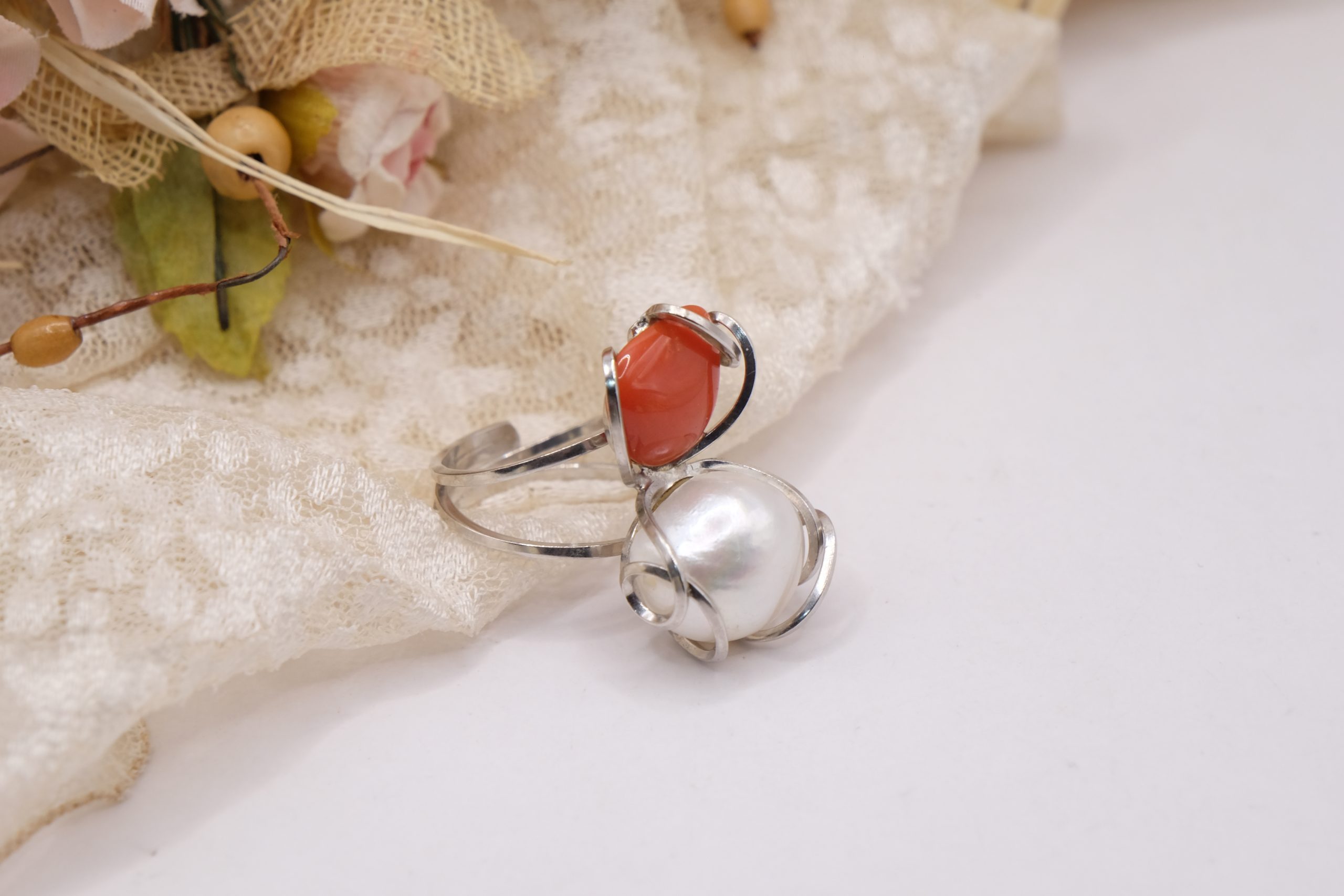Ring with coral and natural pearl in rhodium-plated 925 silver