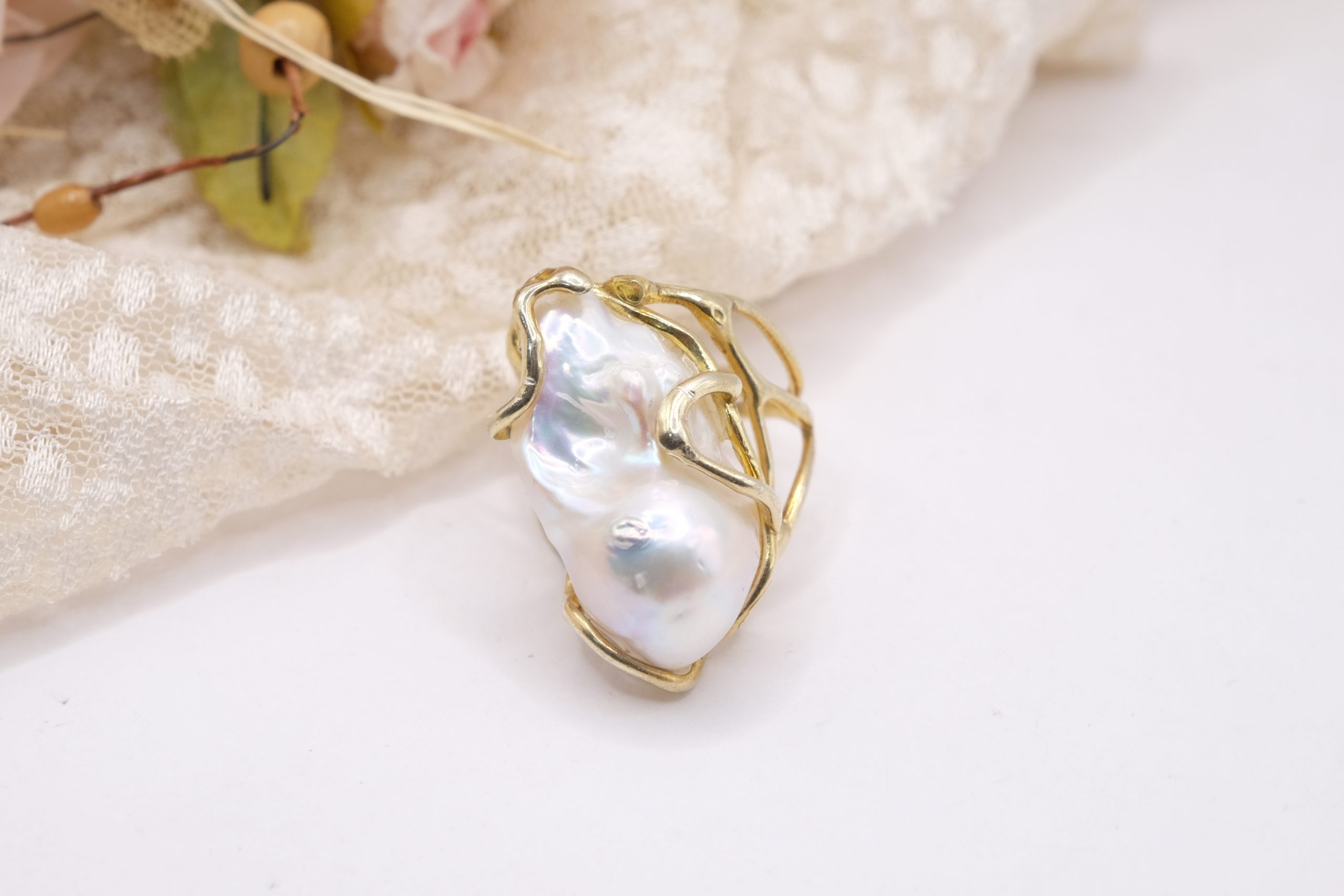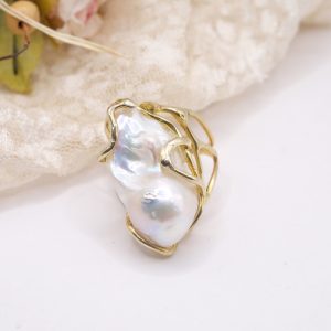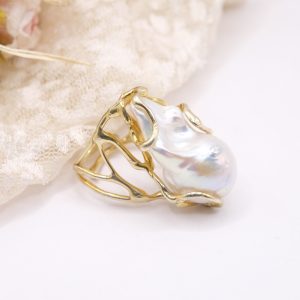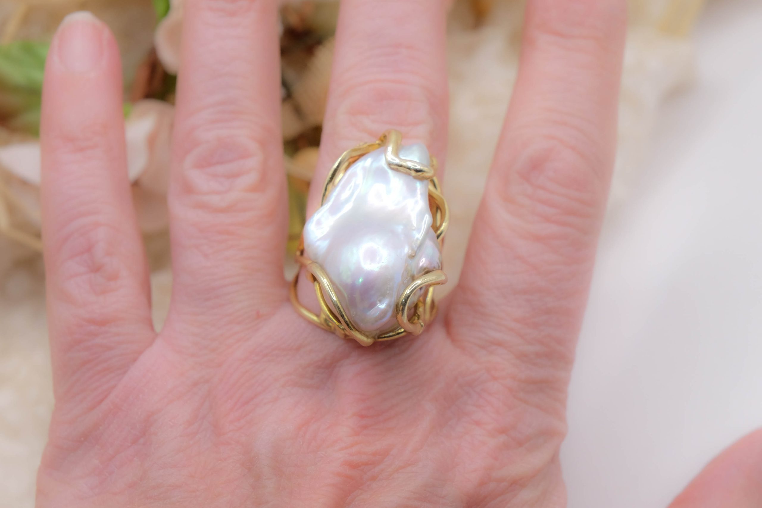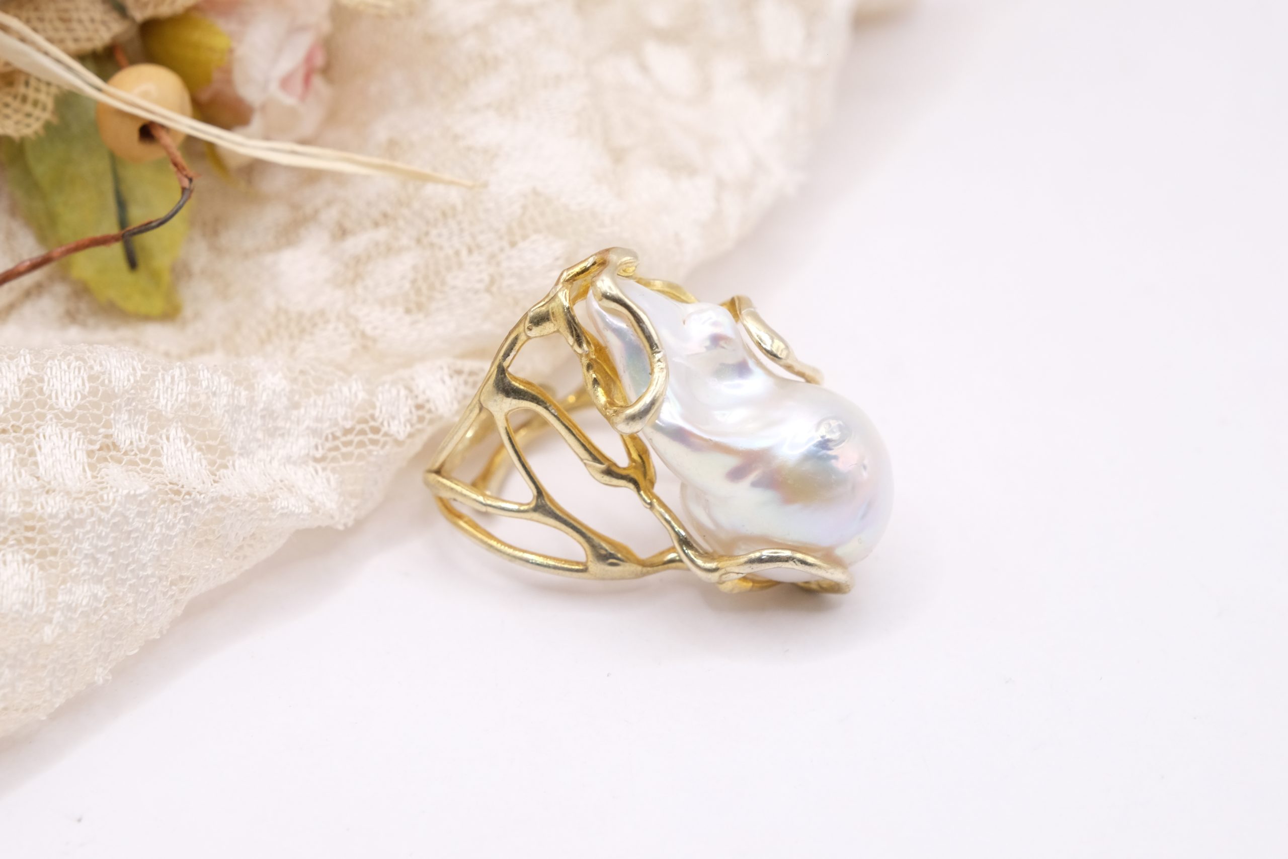 This ring features a beautiful natural baroque pearl, unique in shape and brightness, set in a 925 silver gold-plated setting, with attention to detail and designed to maximize its precious character.