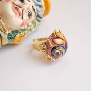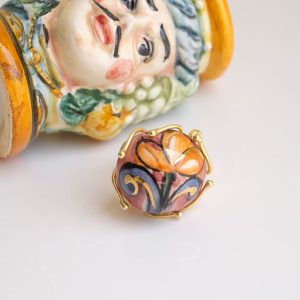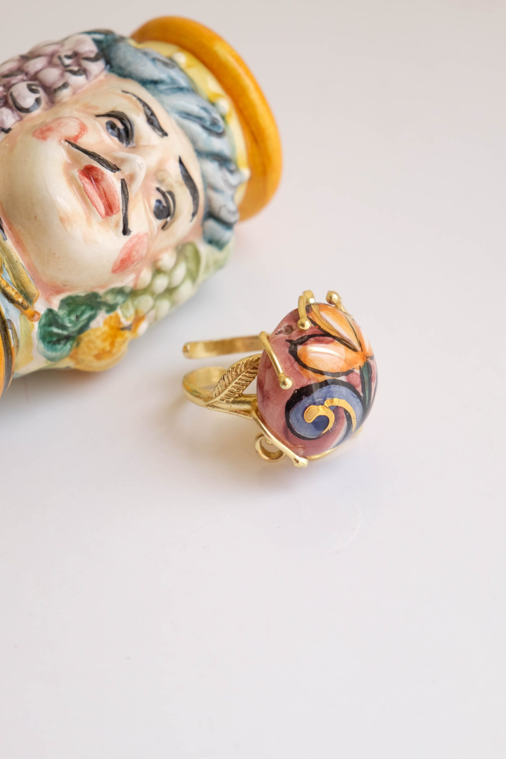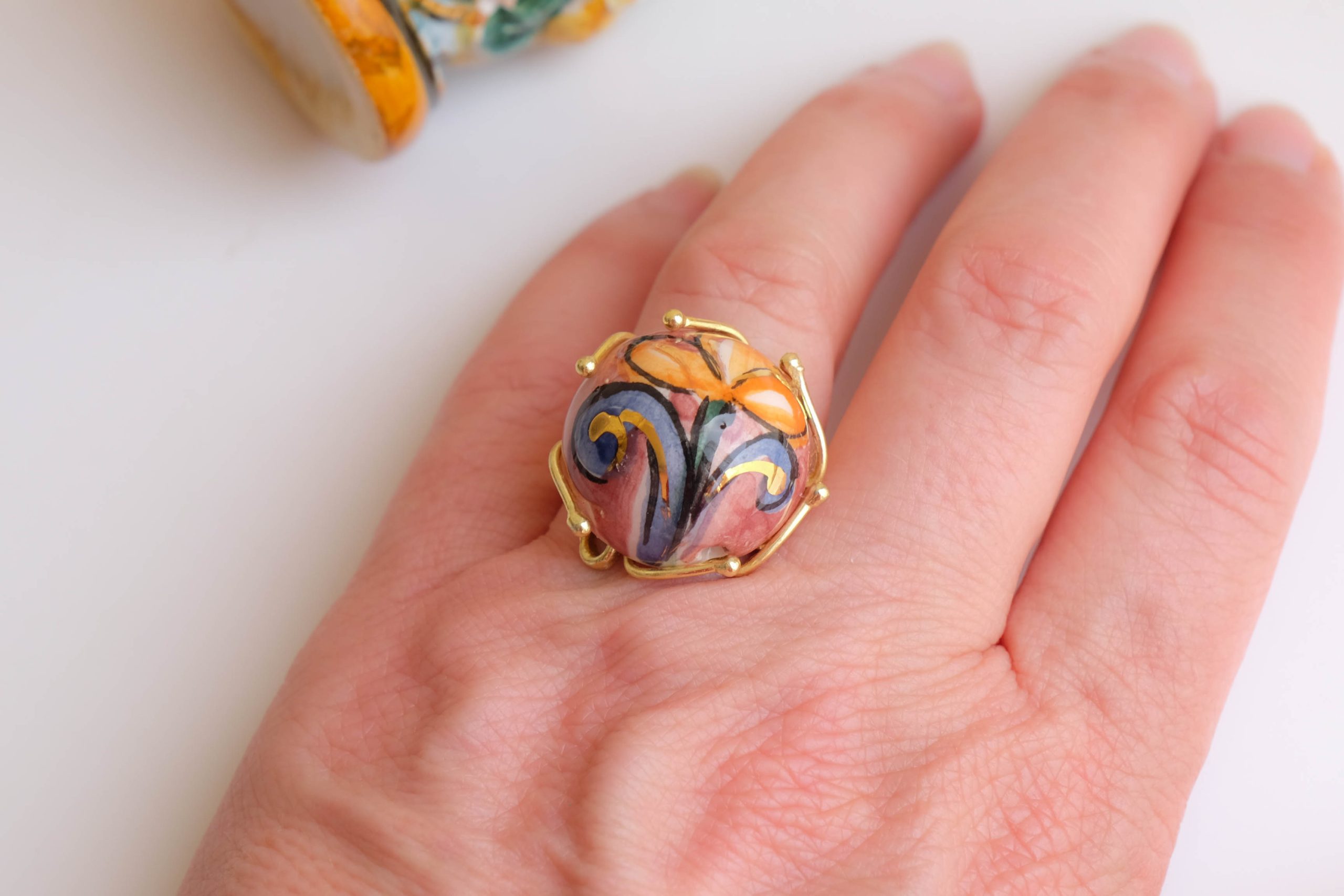 Ring made and decorated by hand in Caltagirone ceramic on a brass setting, manually adjustable, therefore perfect for all sizes.