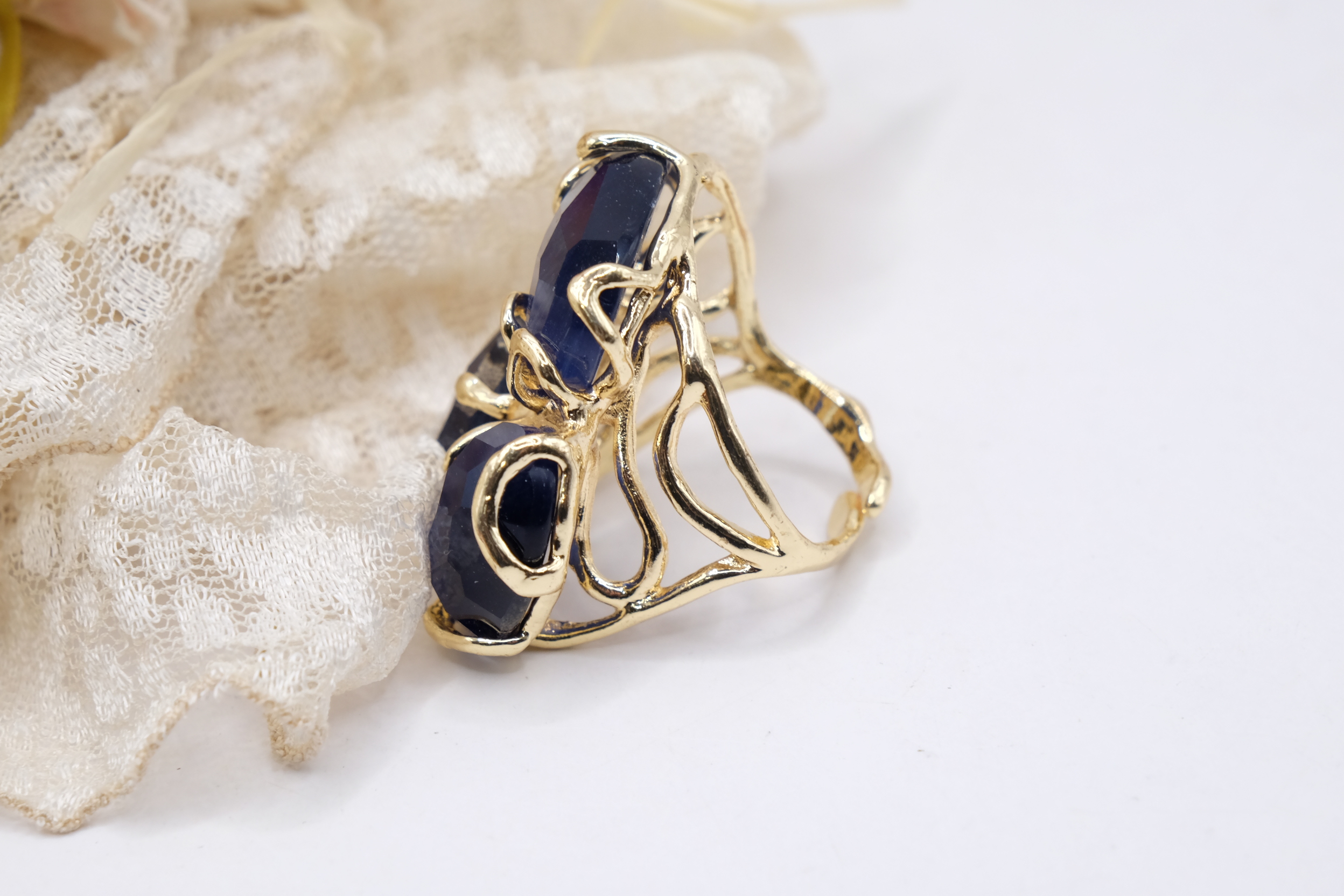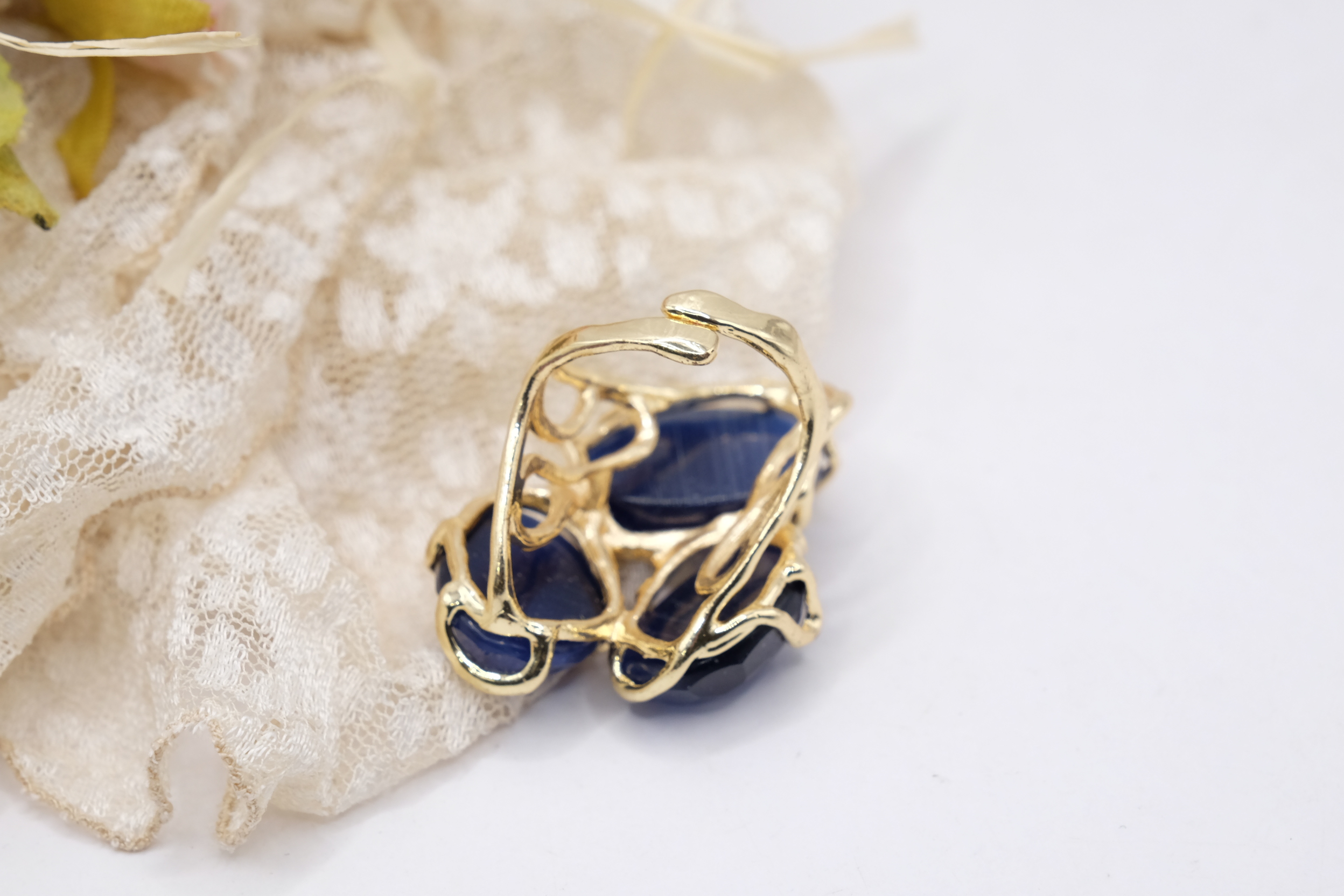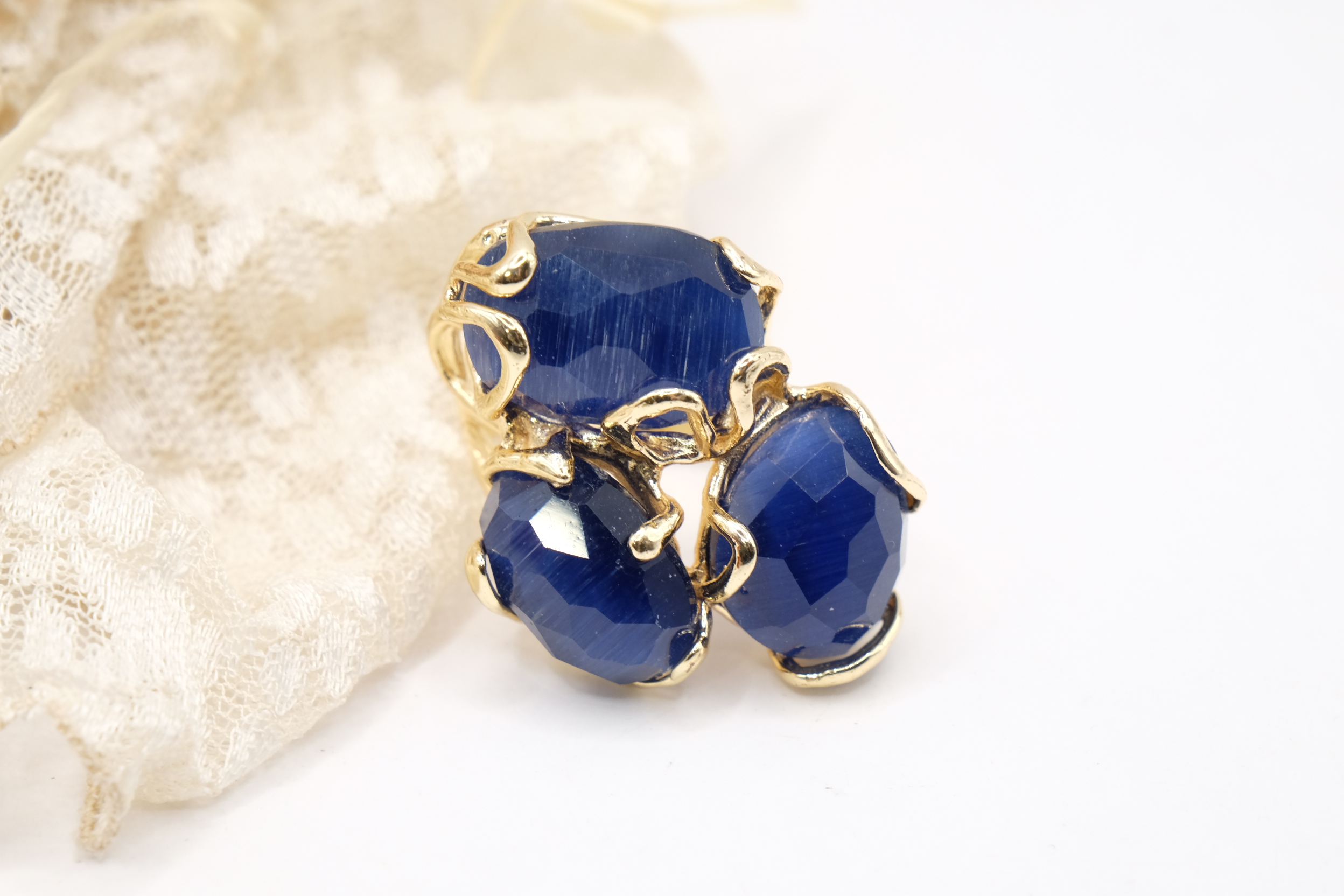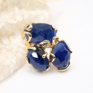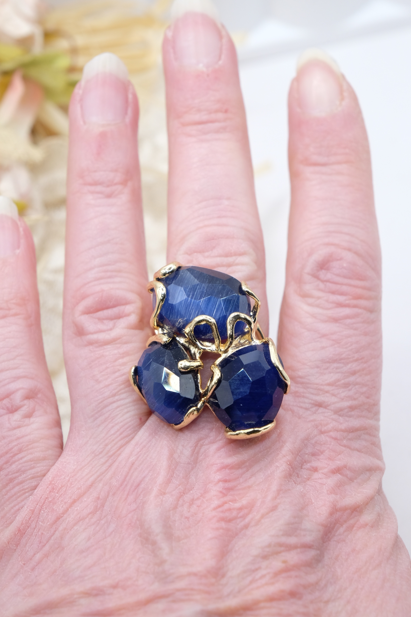 Elegante anello con 3 pietre occhio di gatto blu su montatura in ottone