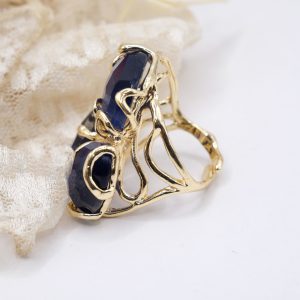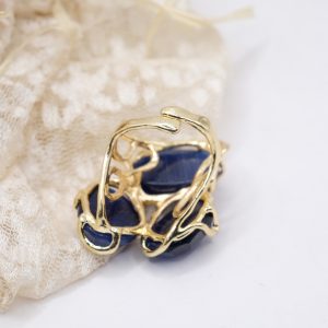 Anello con montatura realizzata in ottone, dai dettagli lavorati e incisioni che aggiungono un tocco di carattere al design. Al centro dell’anello sono posizionate 3 pietre di occhio di gatto blu naturale Questo anello può essere indossato da solo per attirare l’attenzione sulla bellezza delle pietre o abbinato ad altri gioielli per creare un look unico e sofisticato.