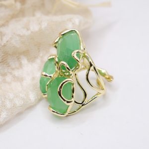 Anello con montatura realizzata in ottone, dai dettagli lavorati e incisioni che aggiungono un tocco di carattere al design. Al centro dell’anello sono posizionate 3 pietre di occhio di gatto verde naturale Questo anello può essere indossato da solo per attirare l’attenzione sulla bellezza delle pietre o abbinato ad altri gioielli per creare un look unico e sofisticato.