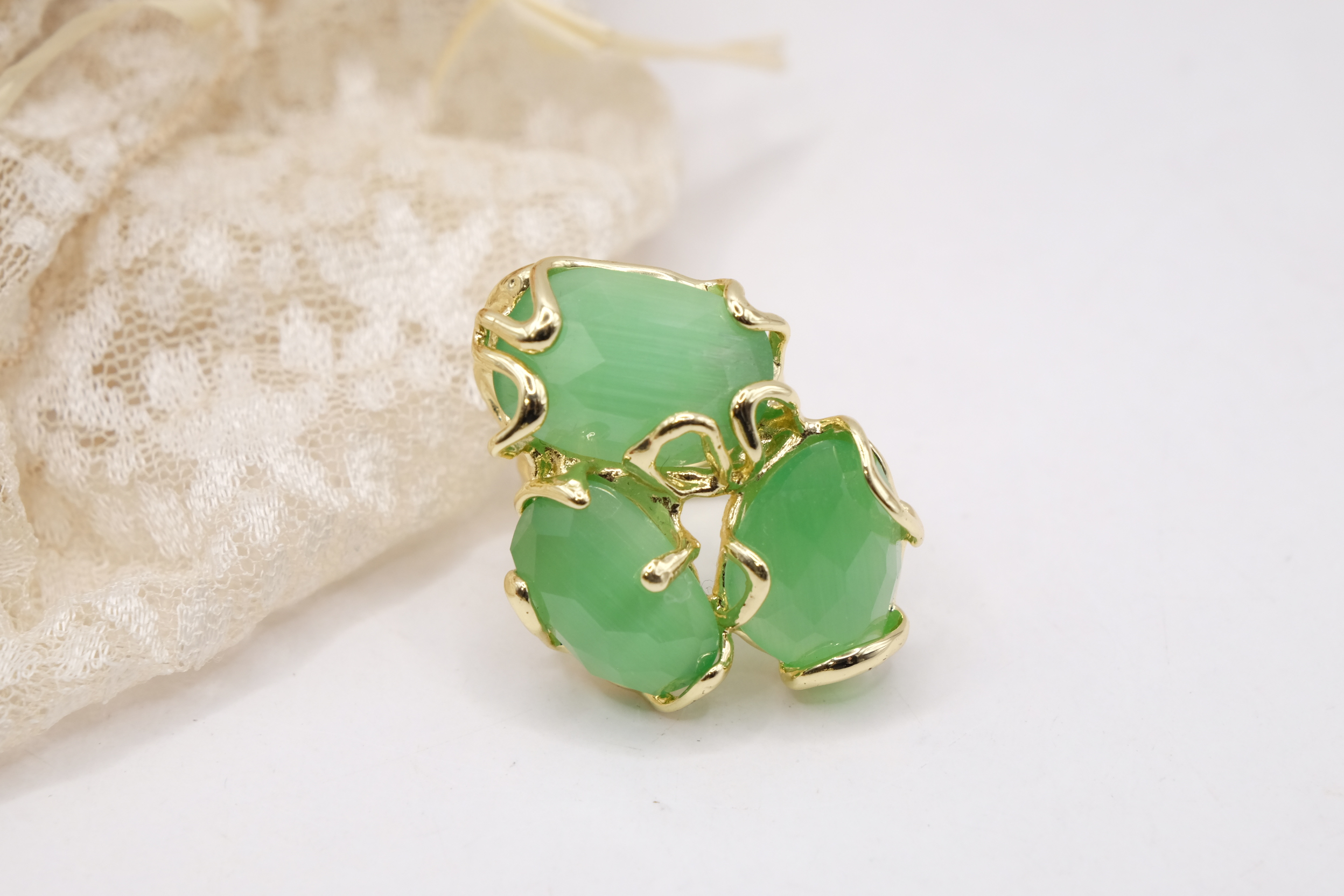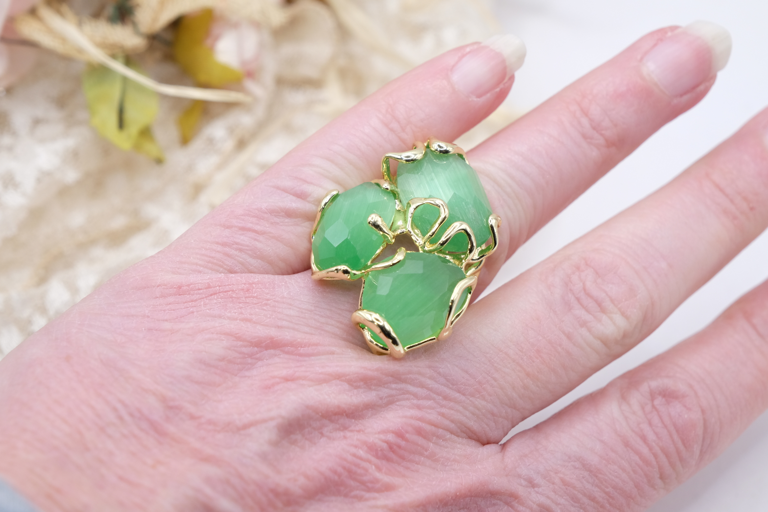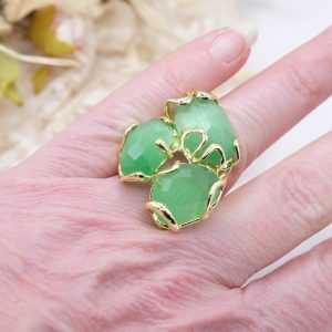 Maxi Ring 3 Stones Green Cat's Eye Brass