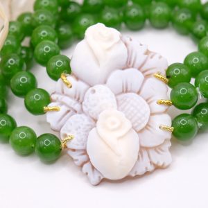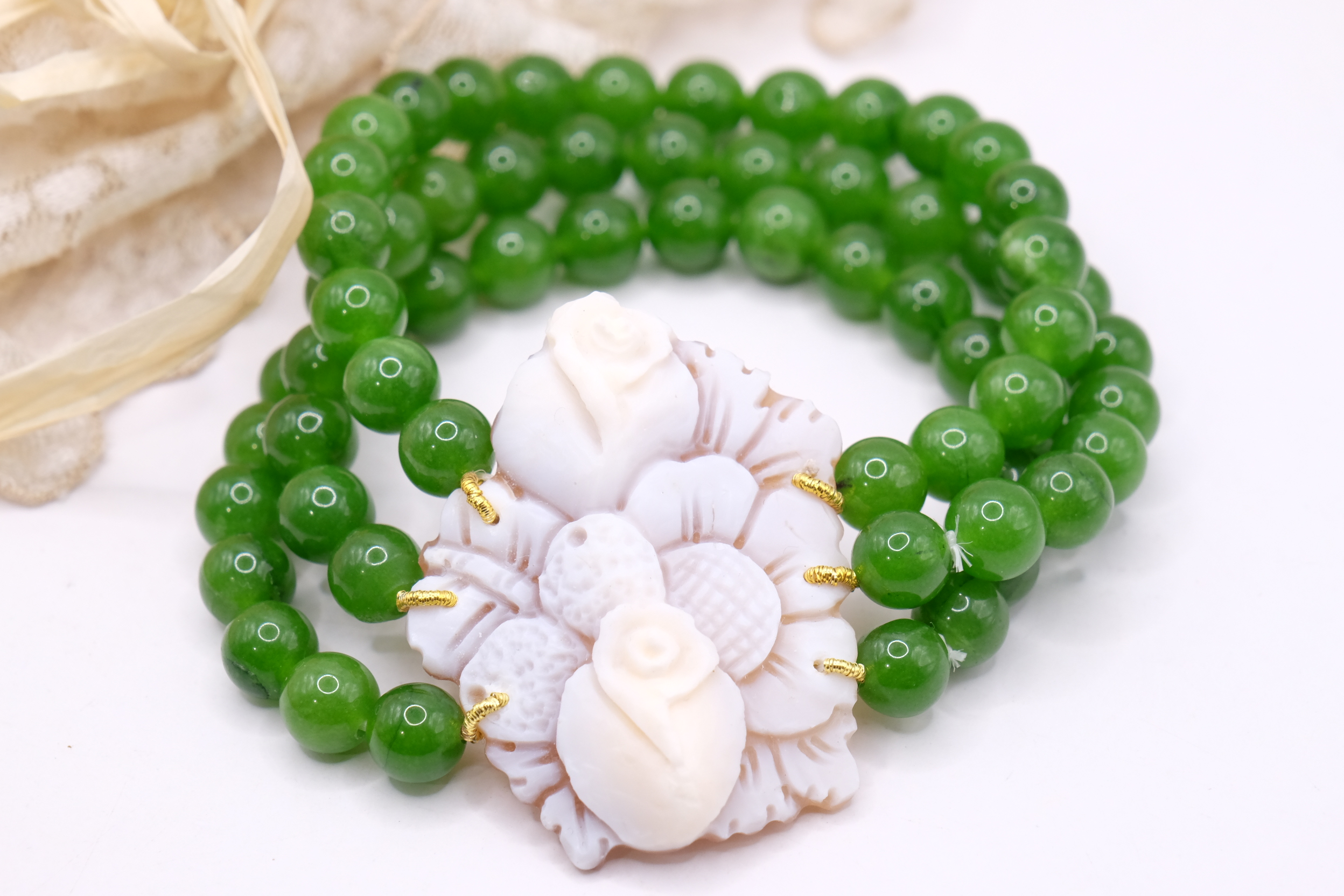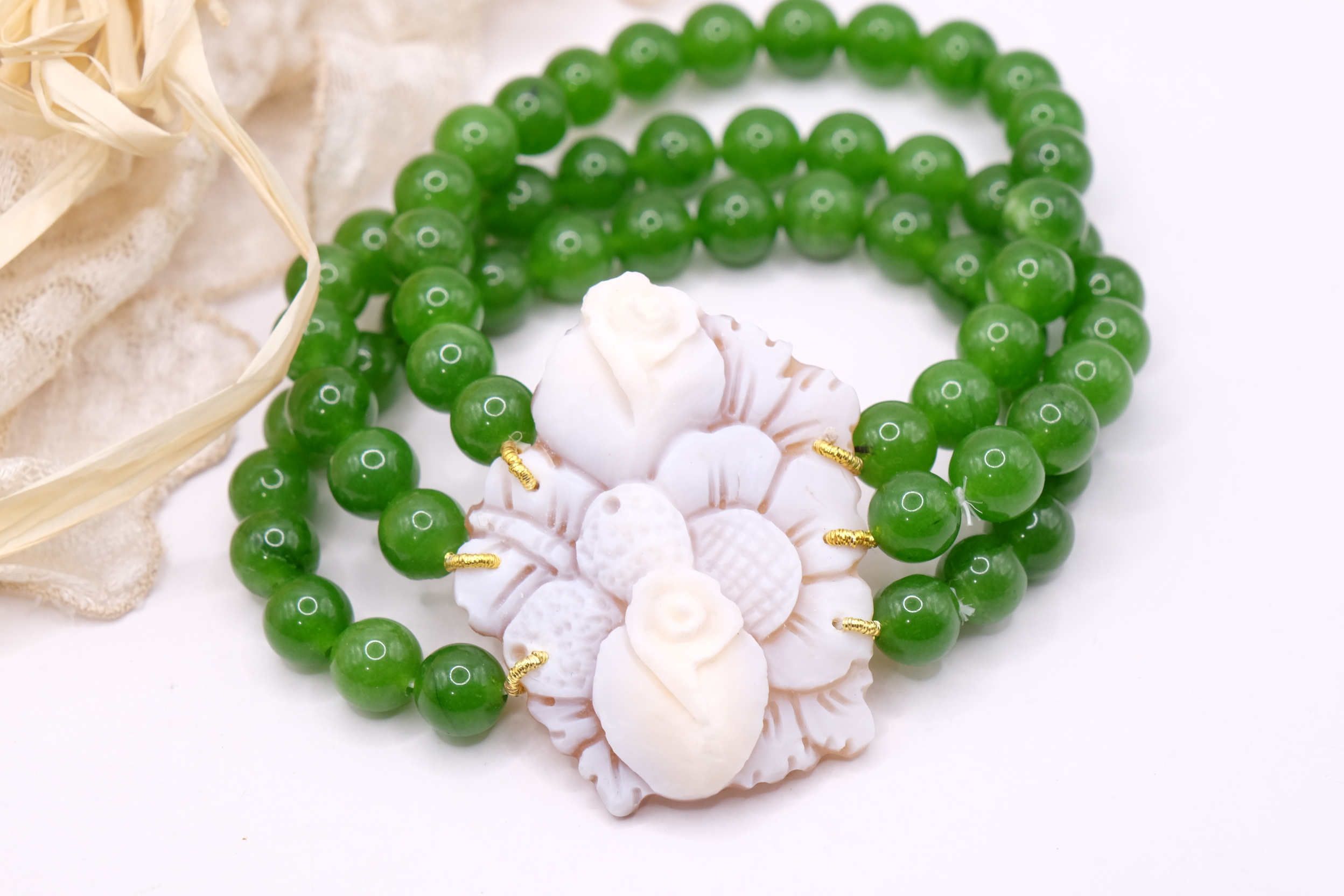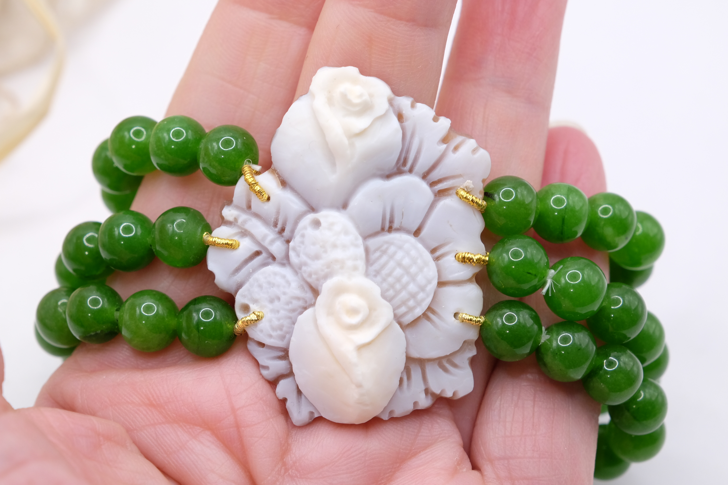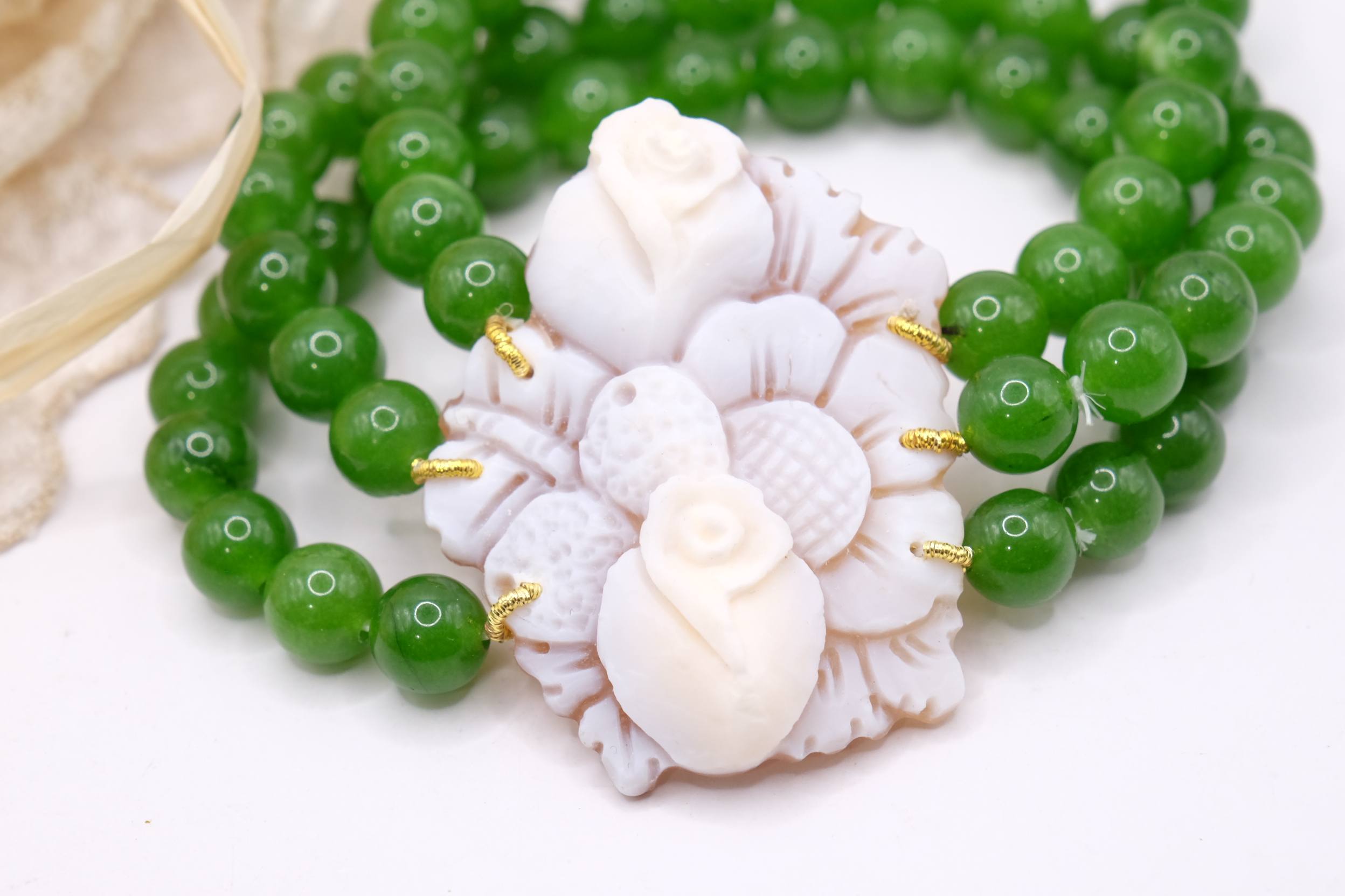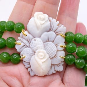 A 3 fili di perle in giada verde da 8 mm e grande cammeo vero e genuino in conchiglia sardonica, inciso a Torre del Greco, da 4,6 x 3,7 cm.