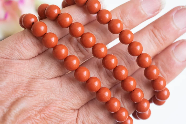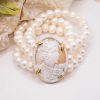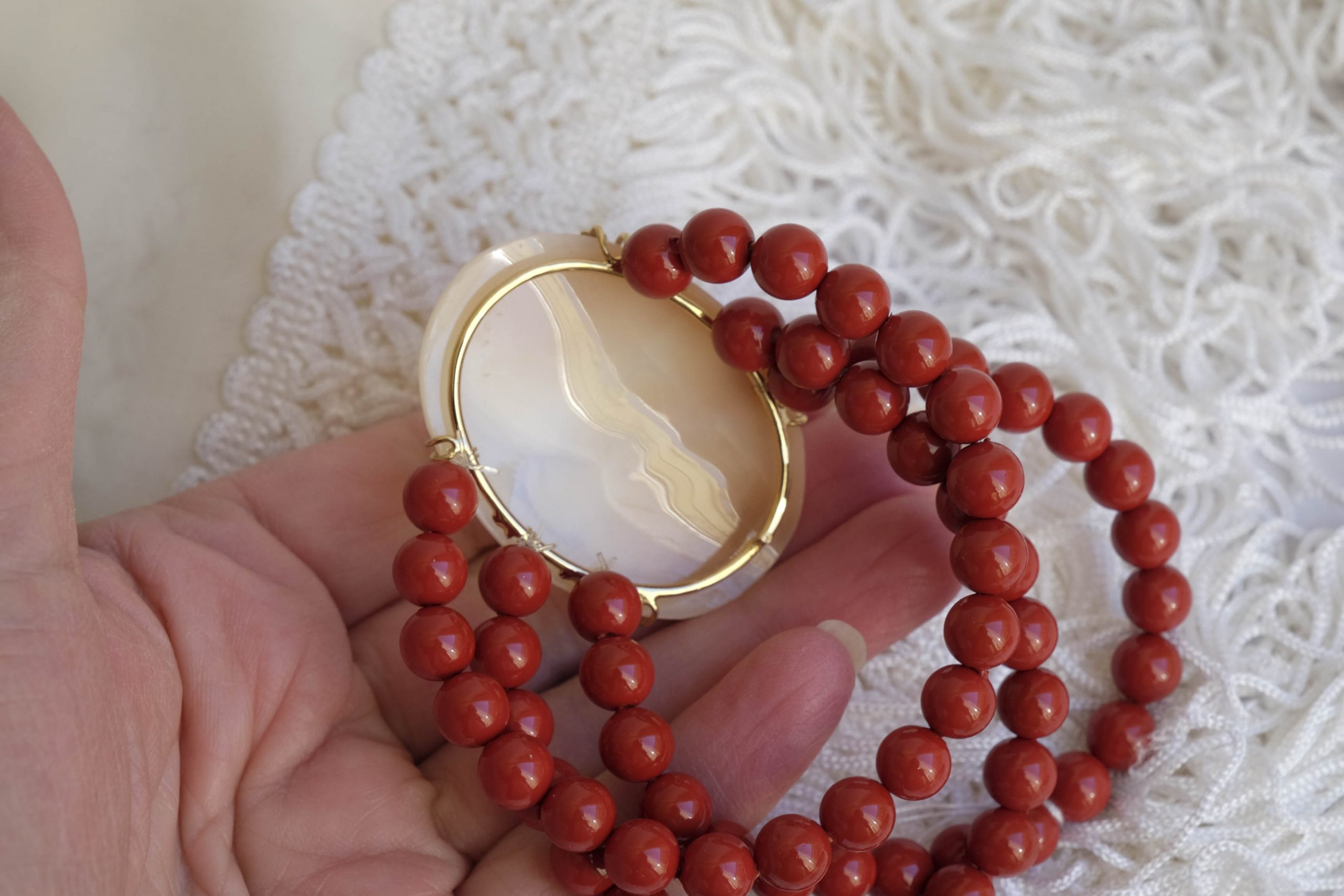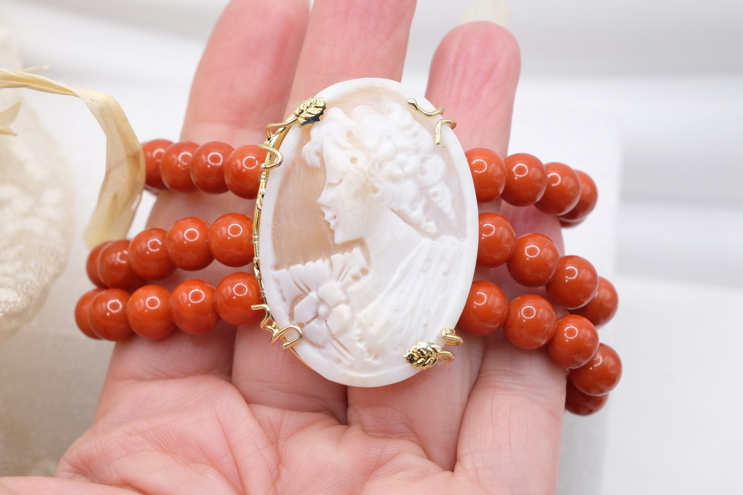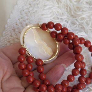3-strand bracelet with 8mm red coral paste pearls and large real and genuine sardonyx shell cameo, engraved in Torre del Greco, 4.6 x 3.5 cm with gold-plated 925 silver bezel.