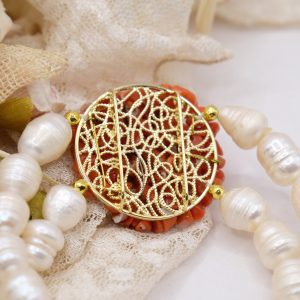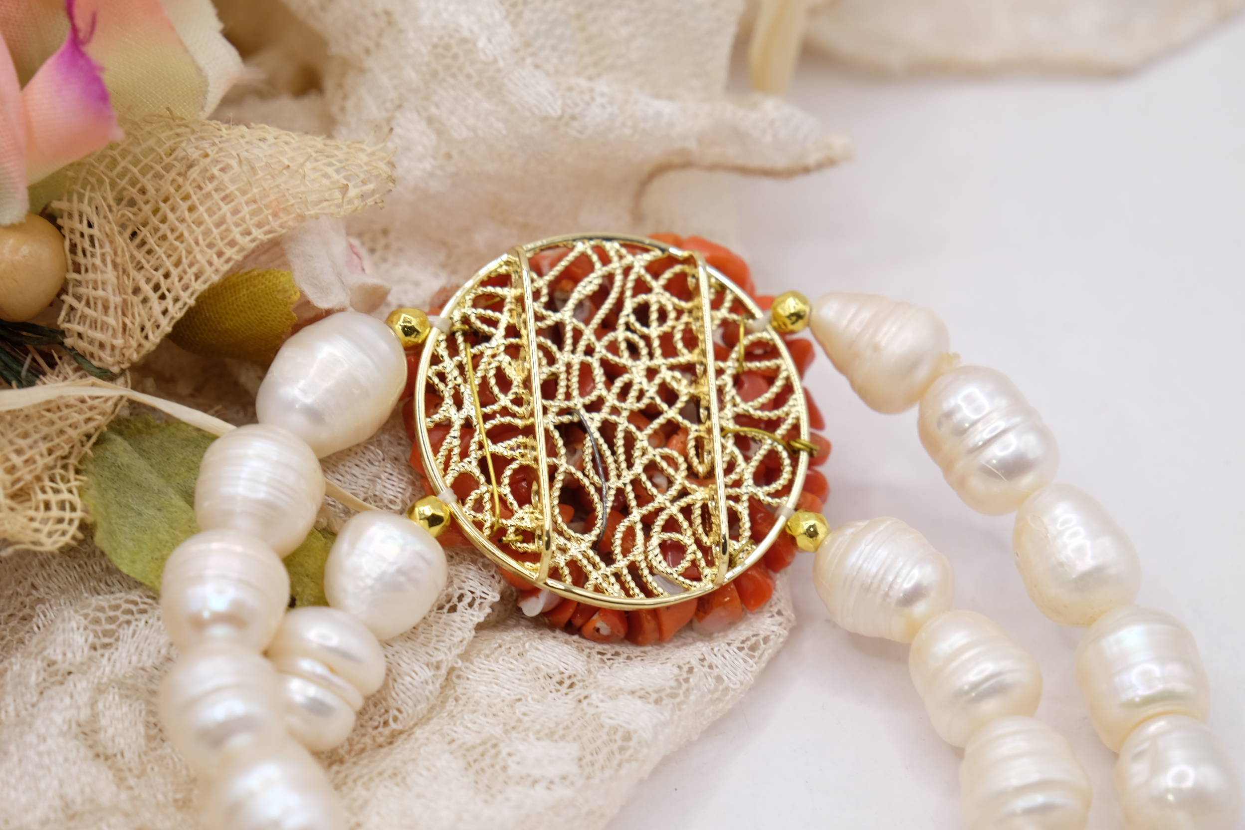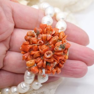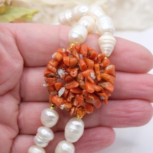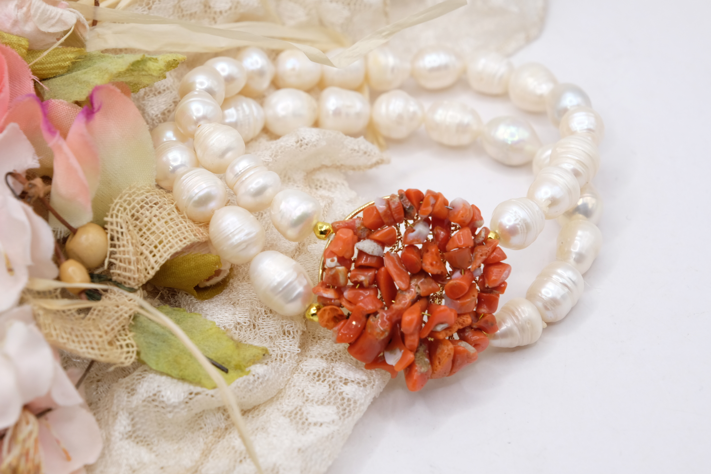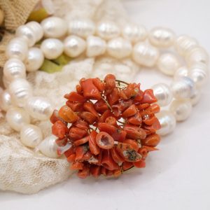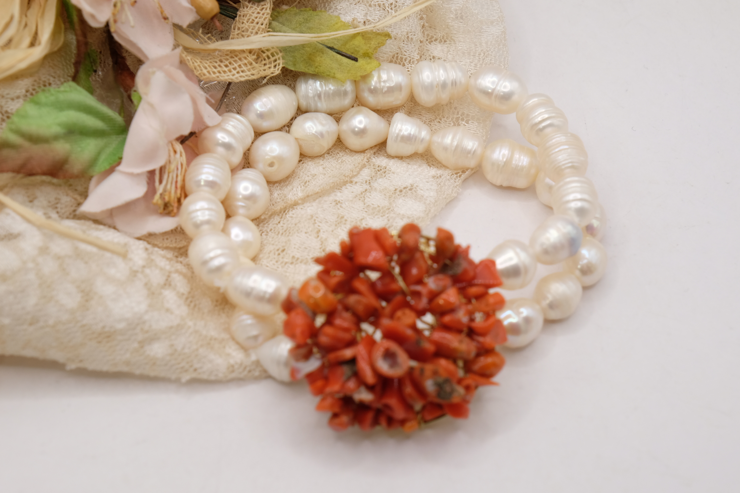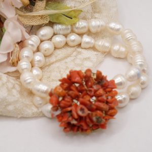 Bracciale artigianale in perle naturali barocche da 10/12 mm a 2 fili , elasticizzato con centrale tessito a mano in corallo naturale