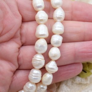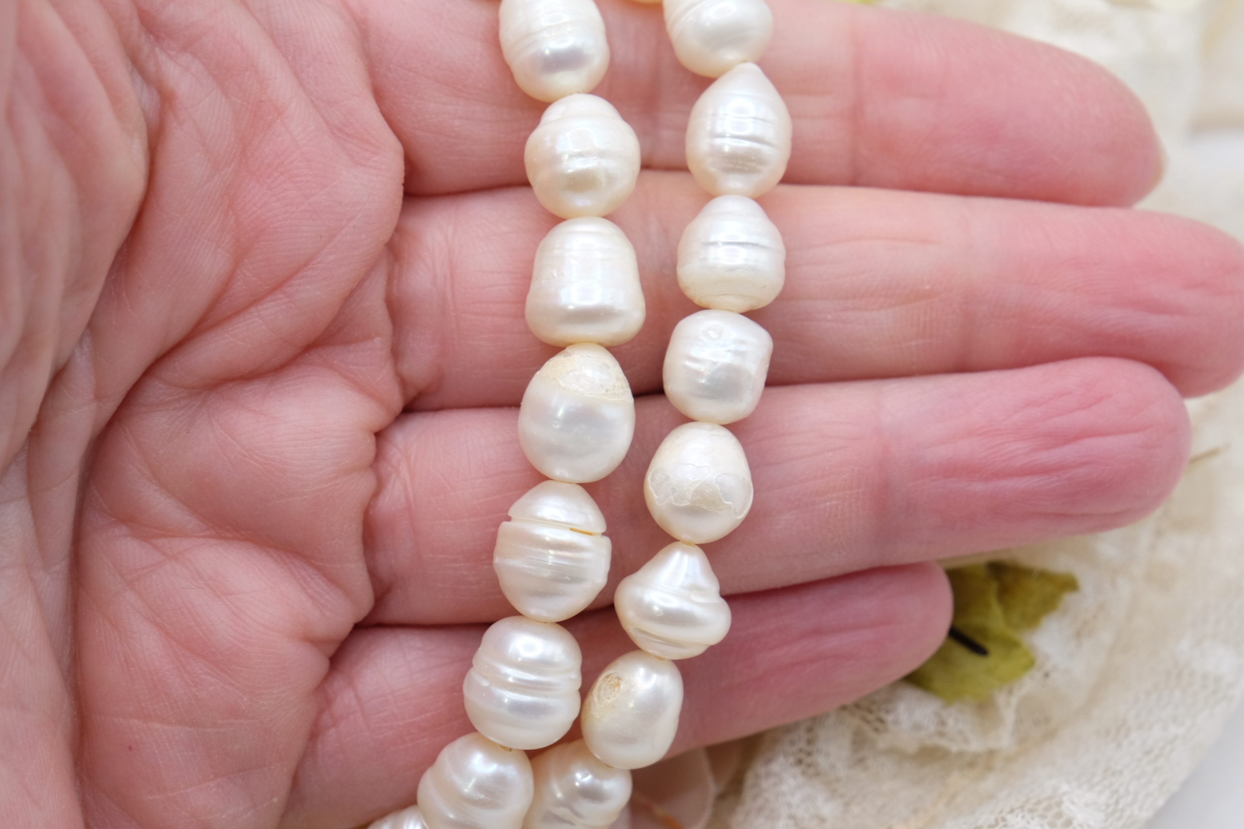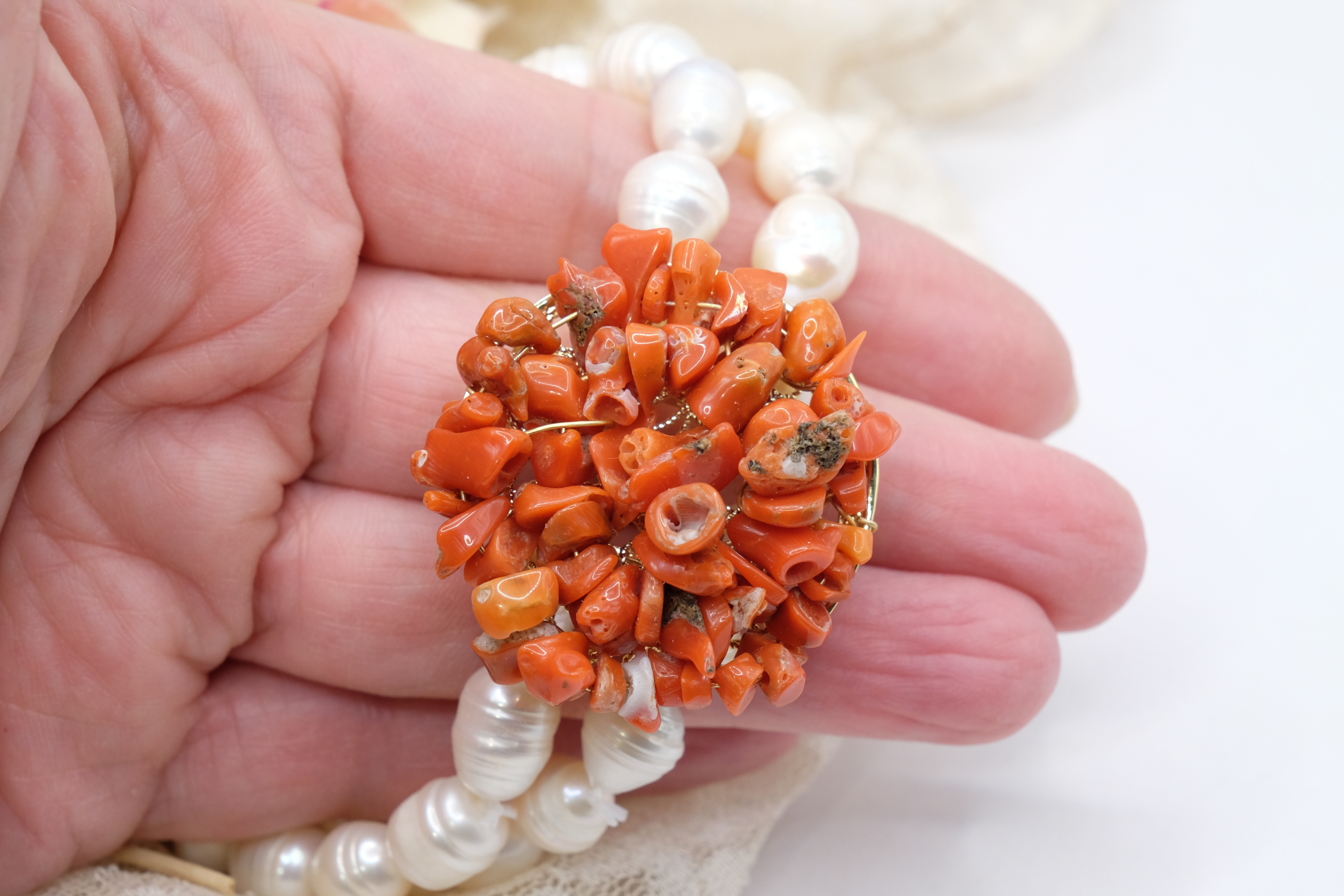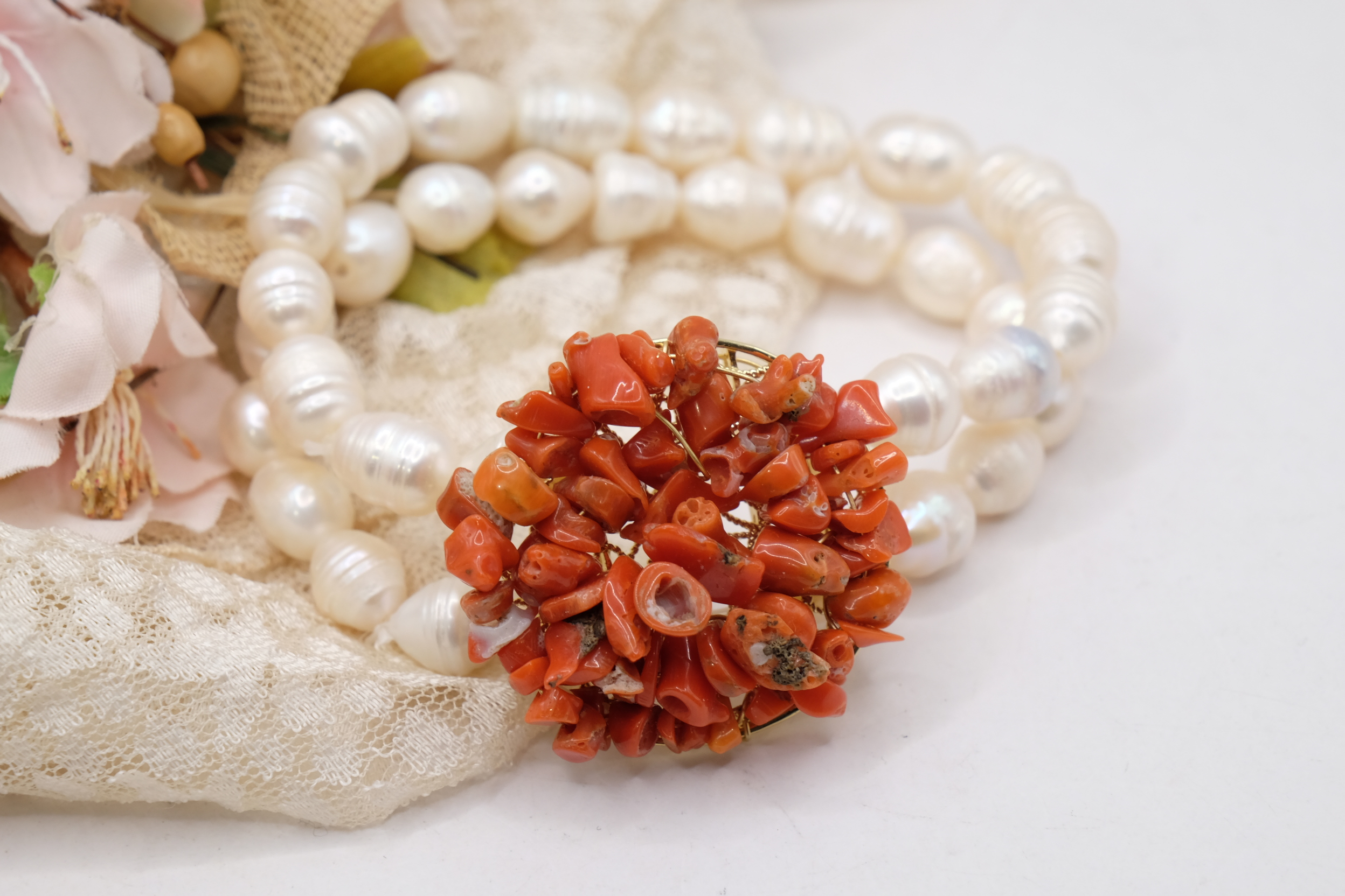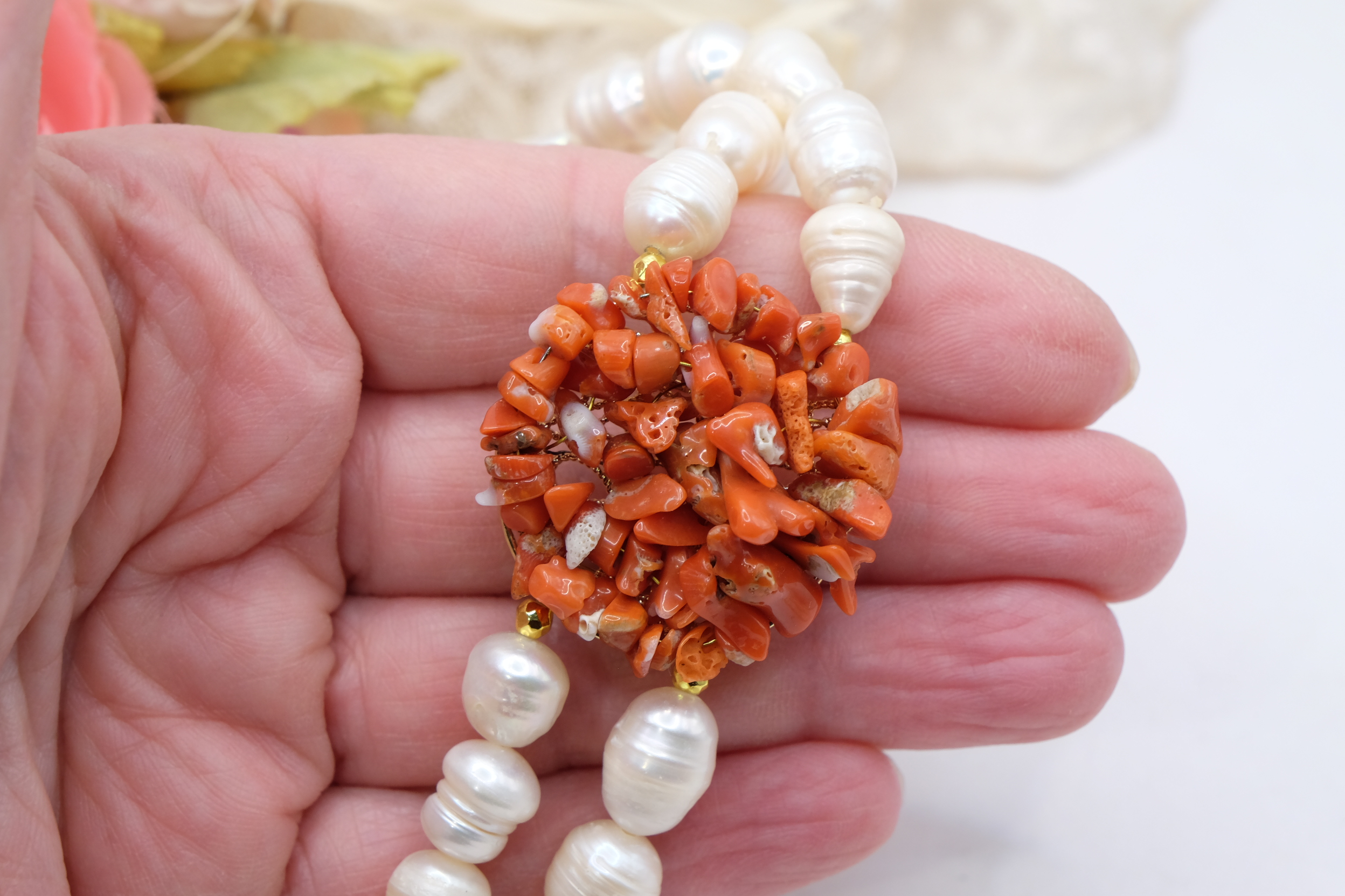 Bracciale artigianale in perle naturali barocche da 10/12 mm a 2 fili , elasticizzato con centrale tessito a mano in corallo naturale