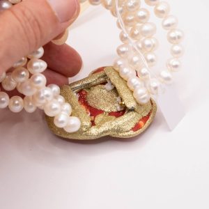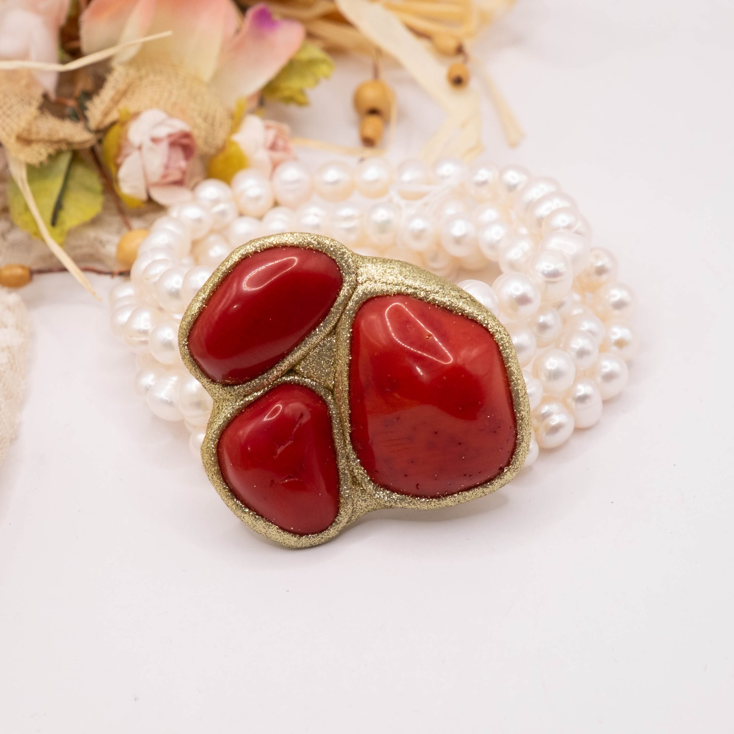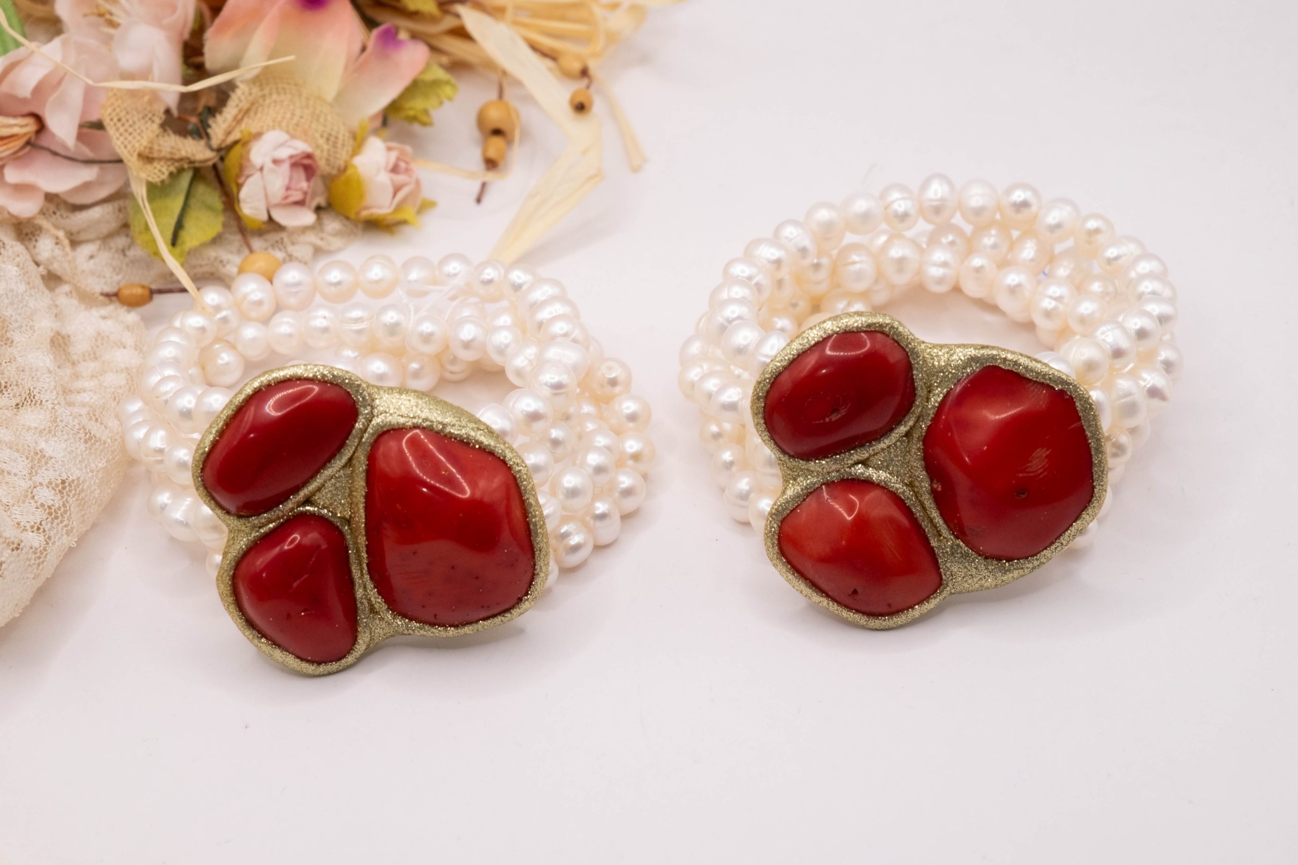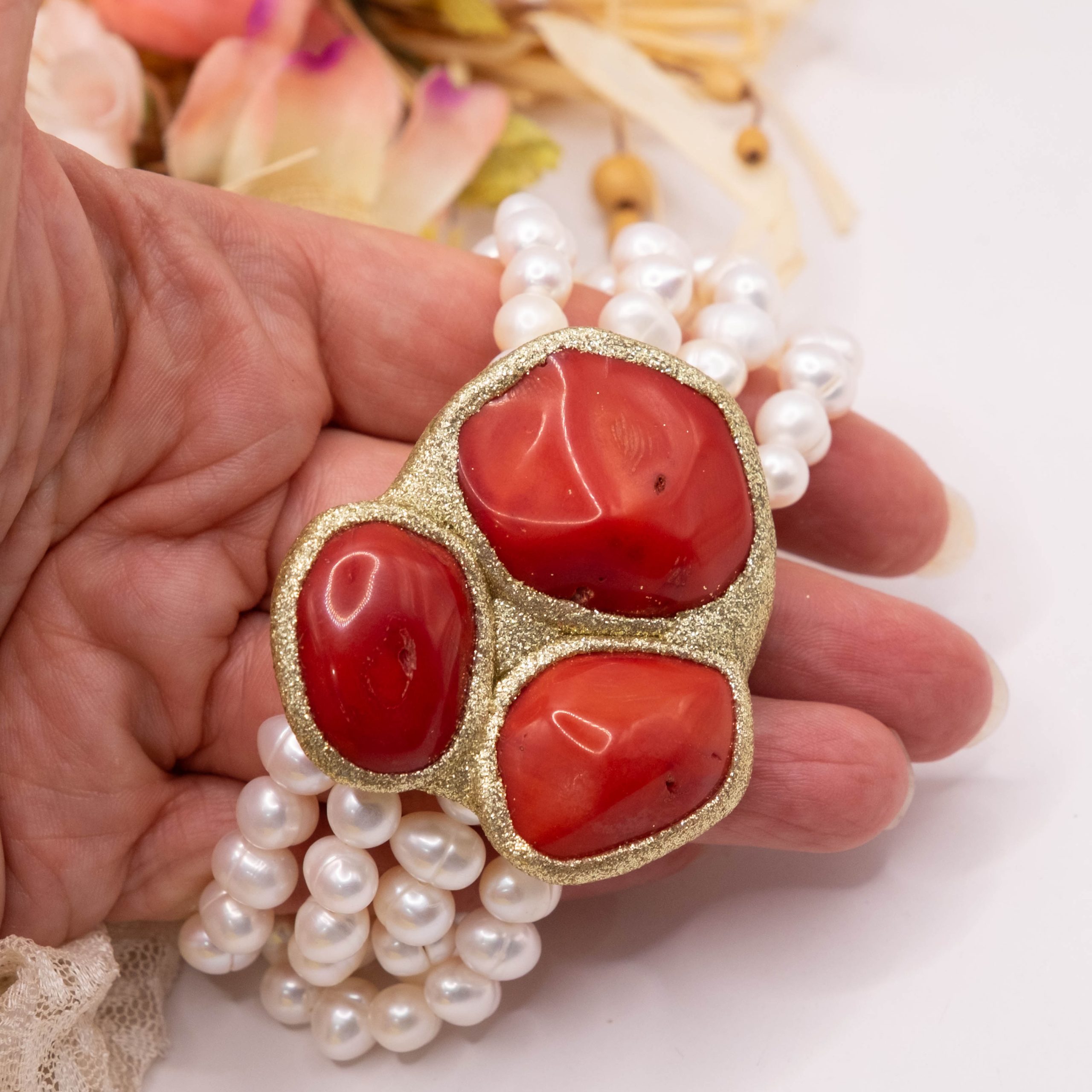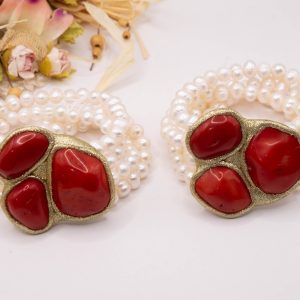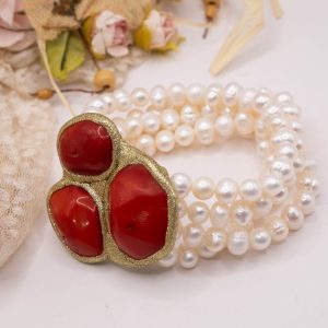 An elegance that speaks to your femininity: this 4-strand bracelet combines the purity of natural pearls with the vibrant warmth of red bamboo coral.