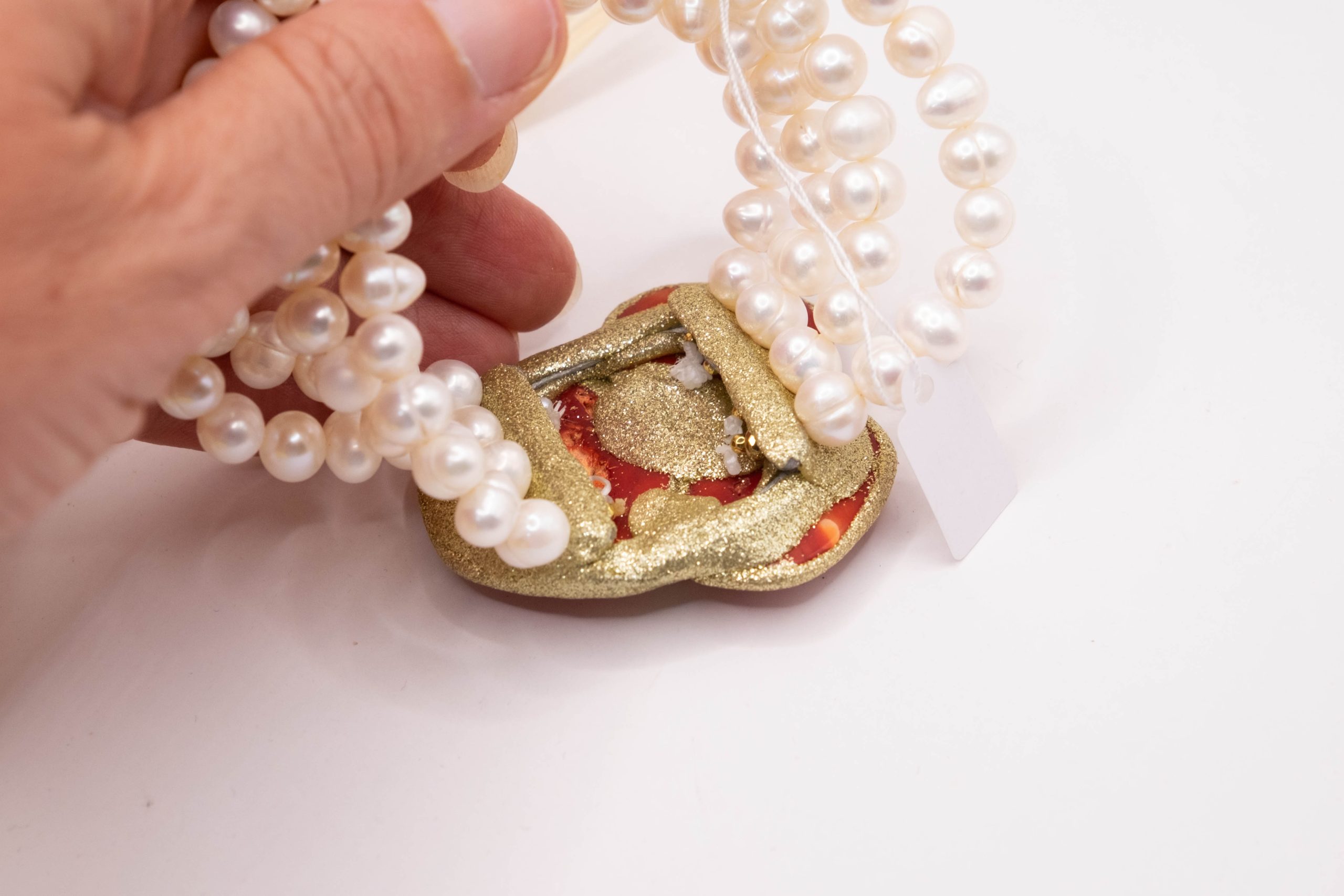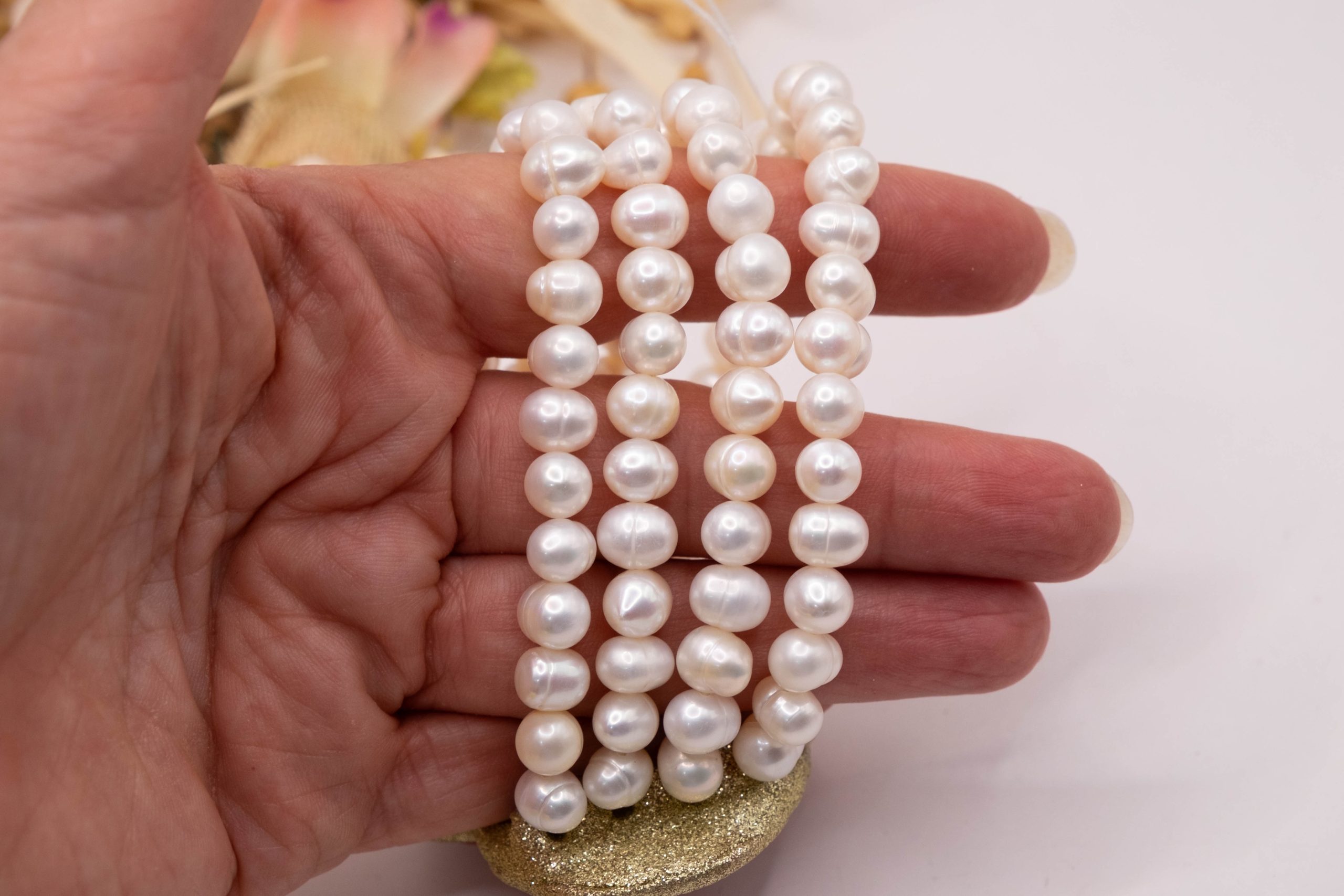 4-strand natural pearl bracelet, elasticated with a red bamboo coral centre and glittery base