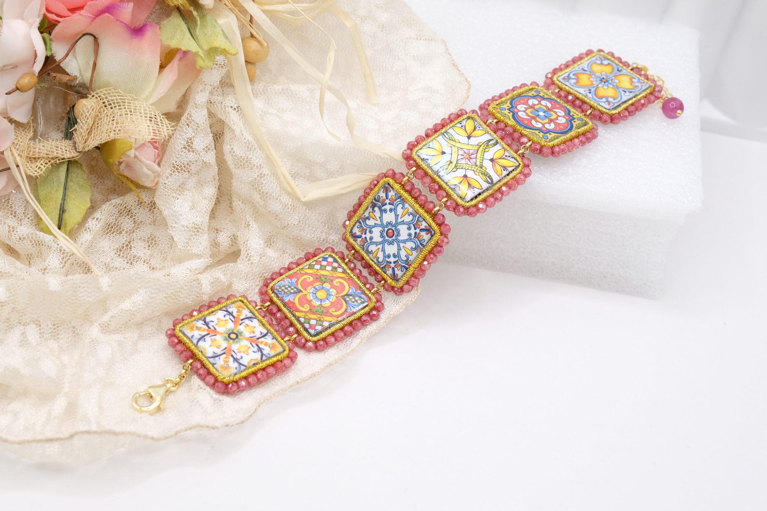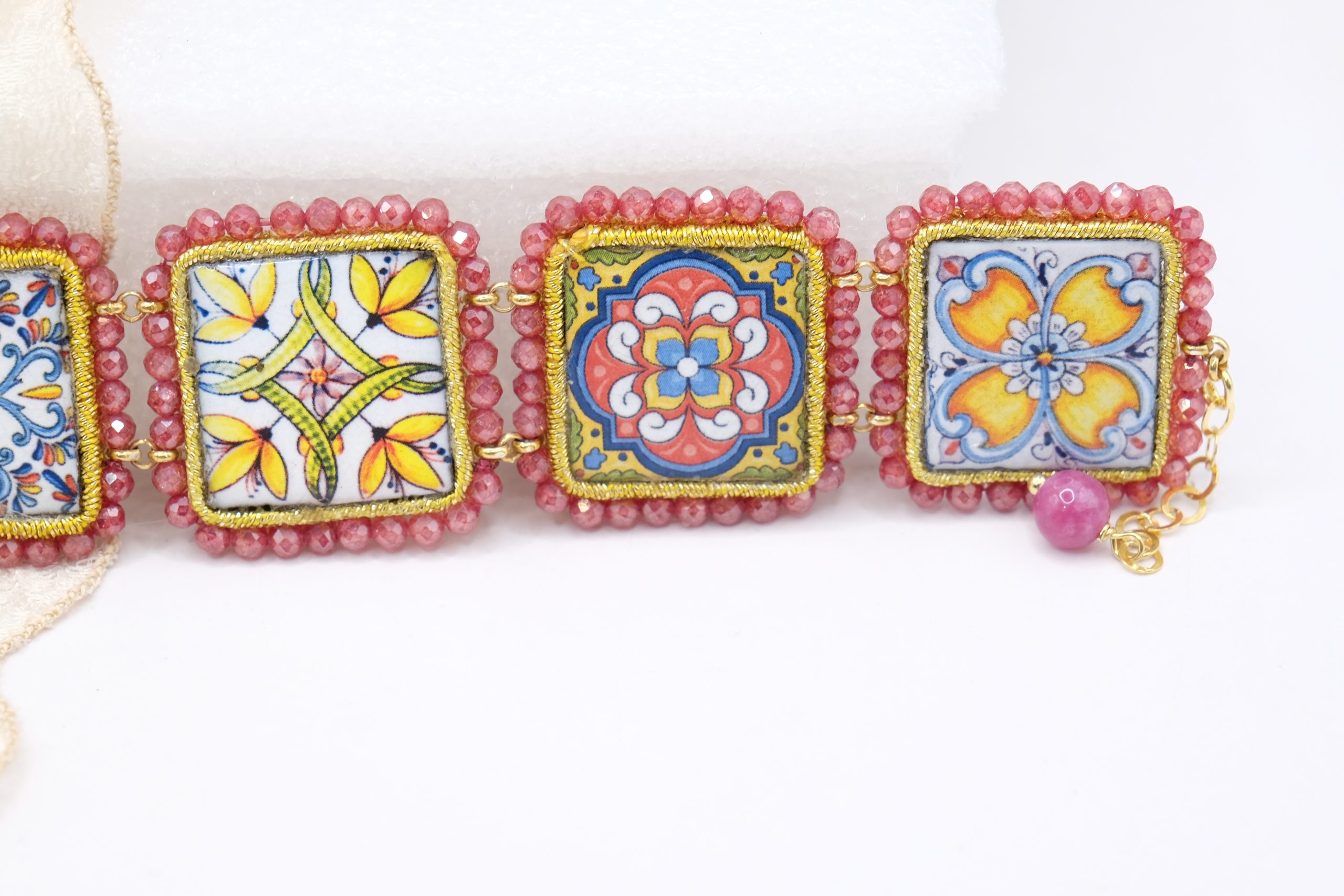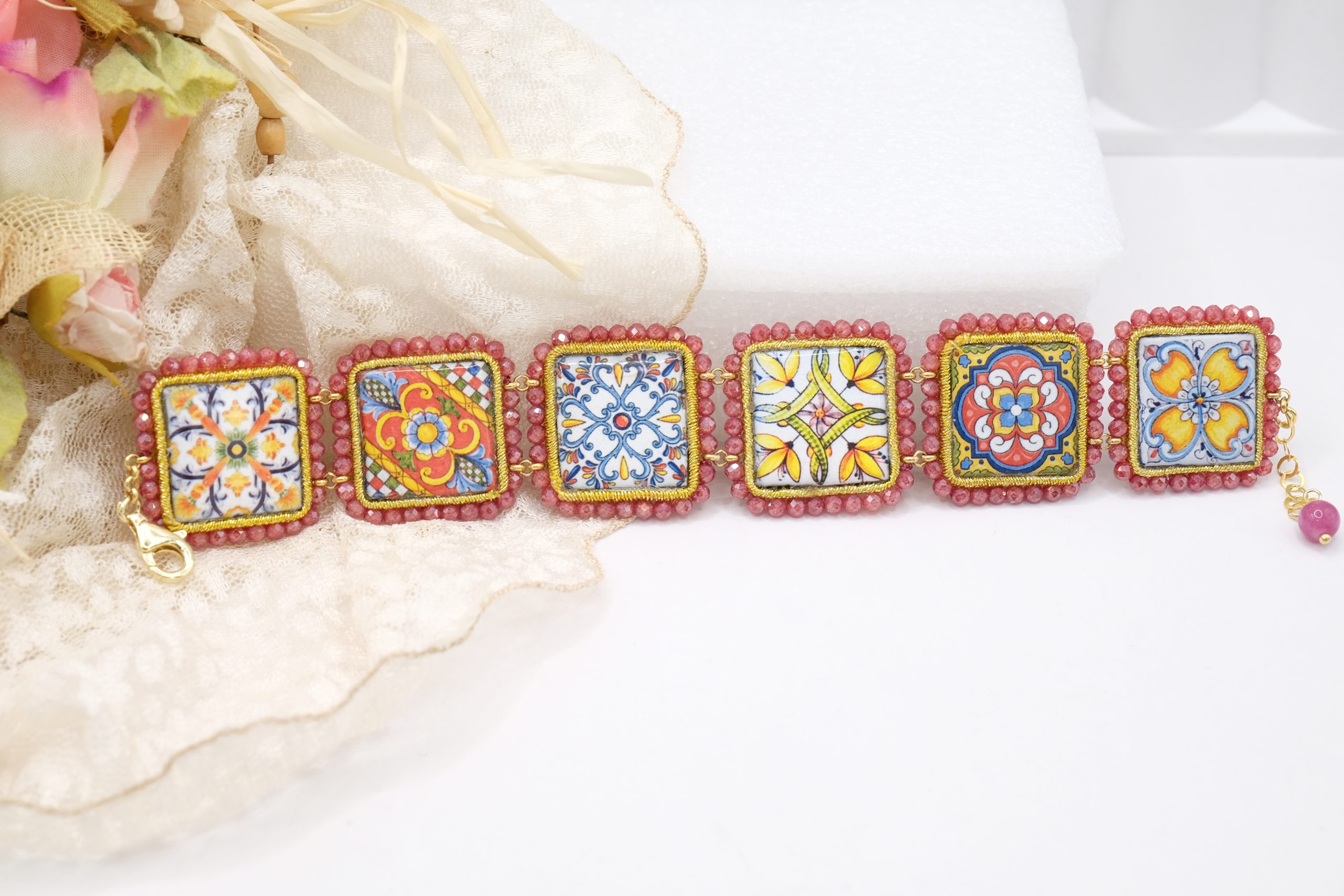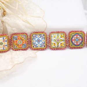 A bracelet featuring six 2.8 x 2.8 cm ceramic lava stone tiles from Caltagirone, glazed with traditional Sicilian motifs. The tiles are framed with pink zirconia.