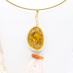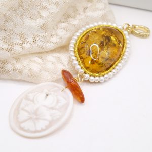 La calda ambra del Baltico incontra un prezioso cammeo inciso a mano dai maestri di Torre del Greco, con delicati motivi floreali 🌸