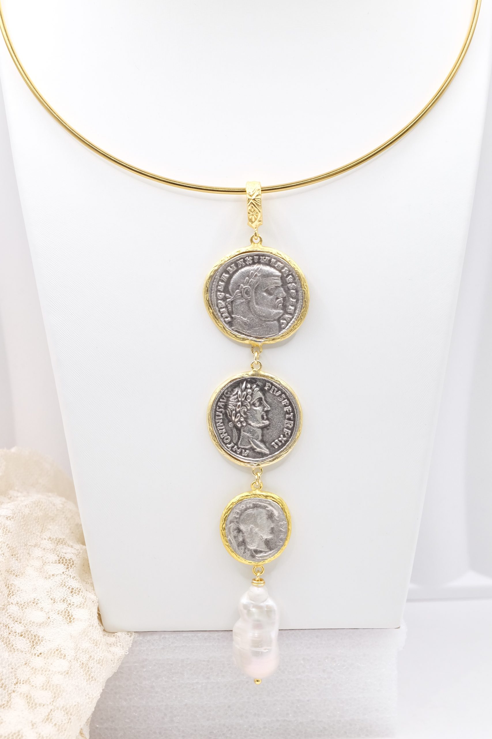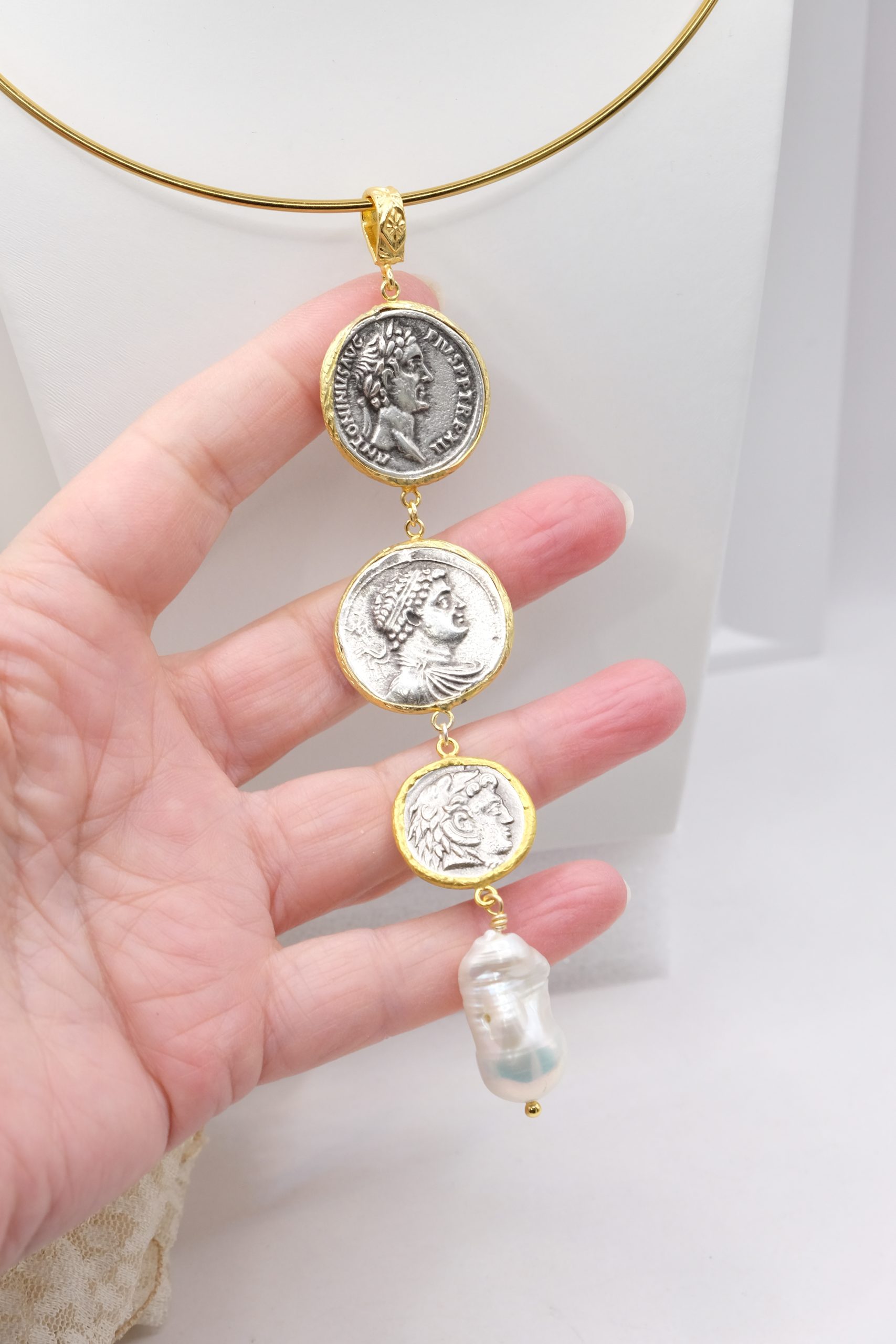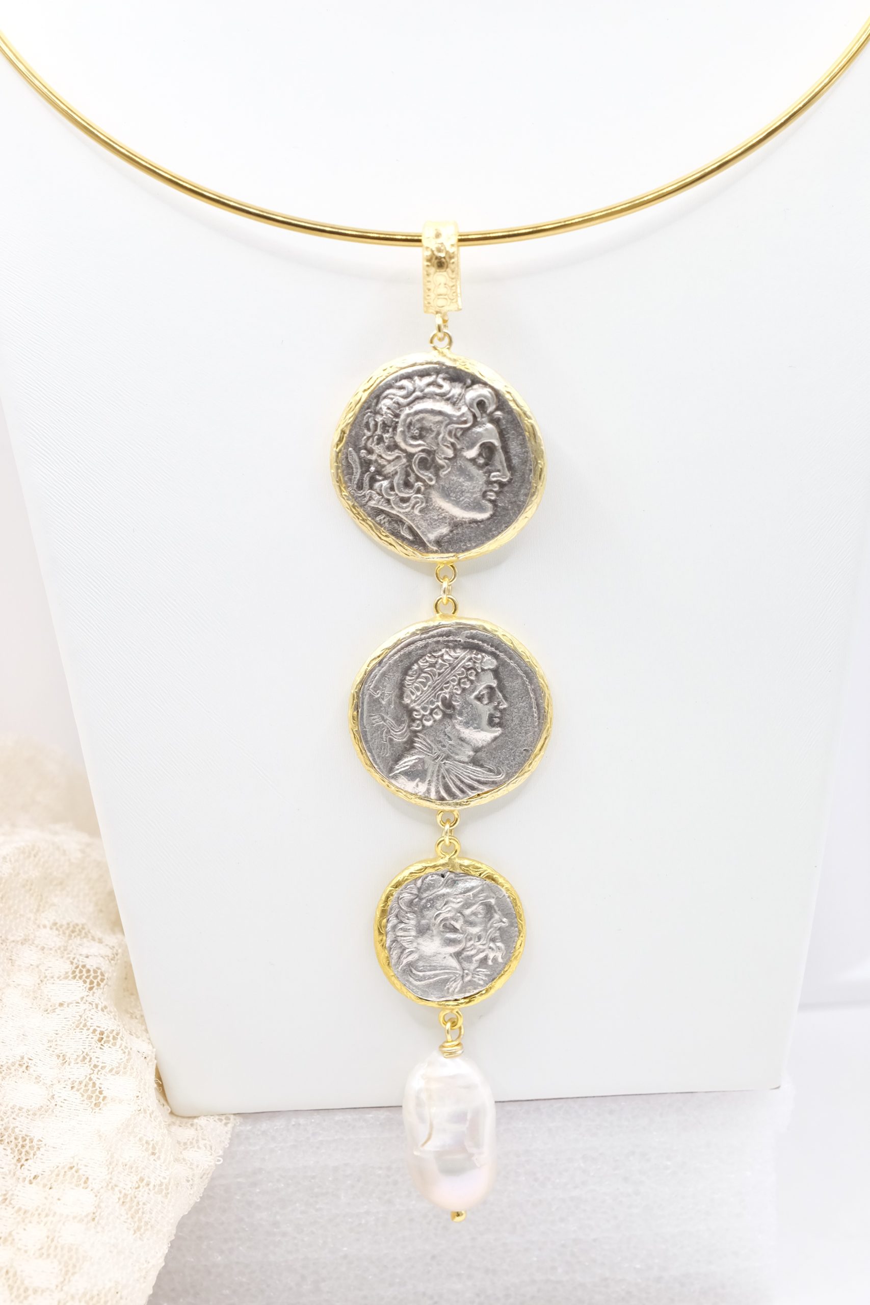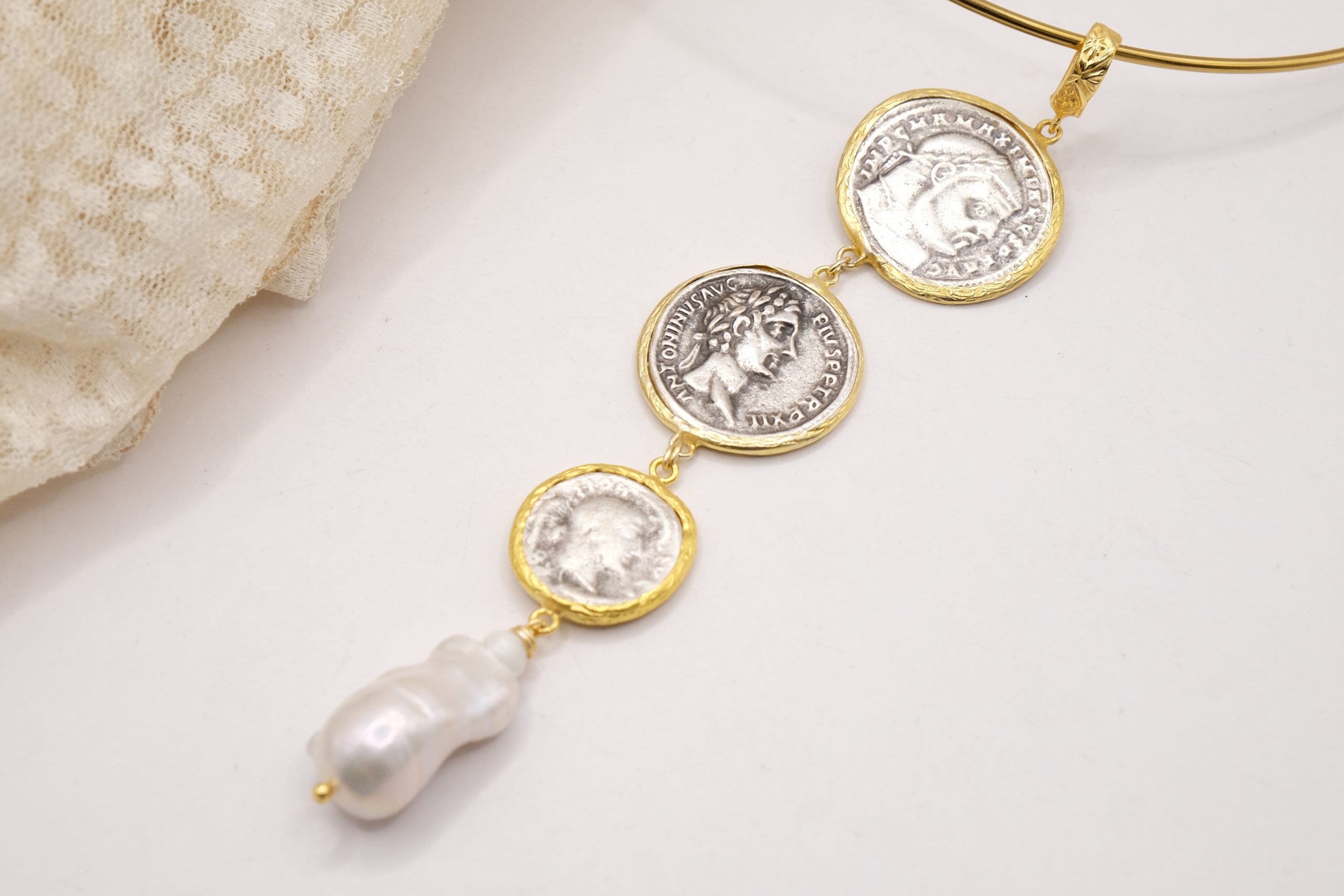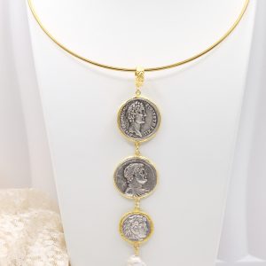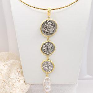 Pendant with 3 top quality antiqued double-sided coins and a natural baroque drop-shaped pearl at the end