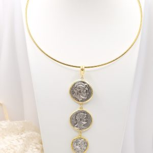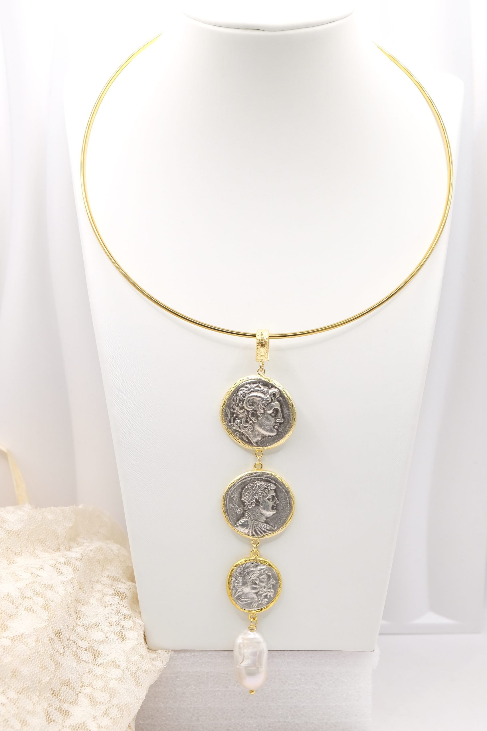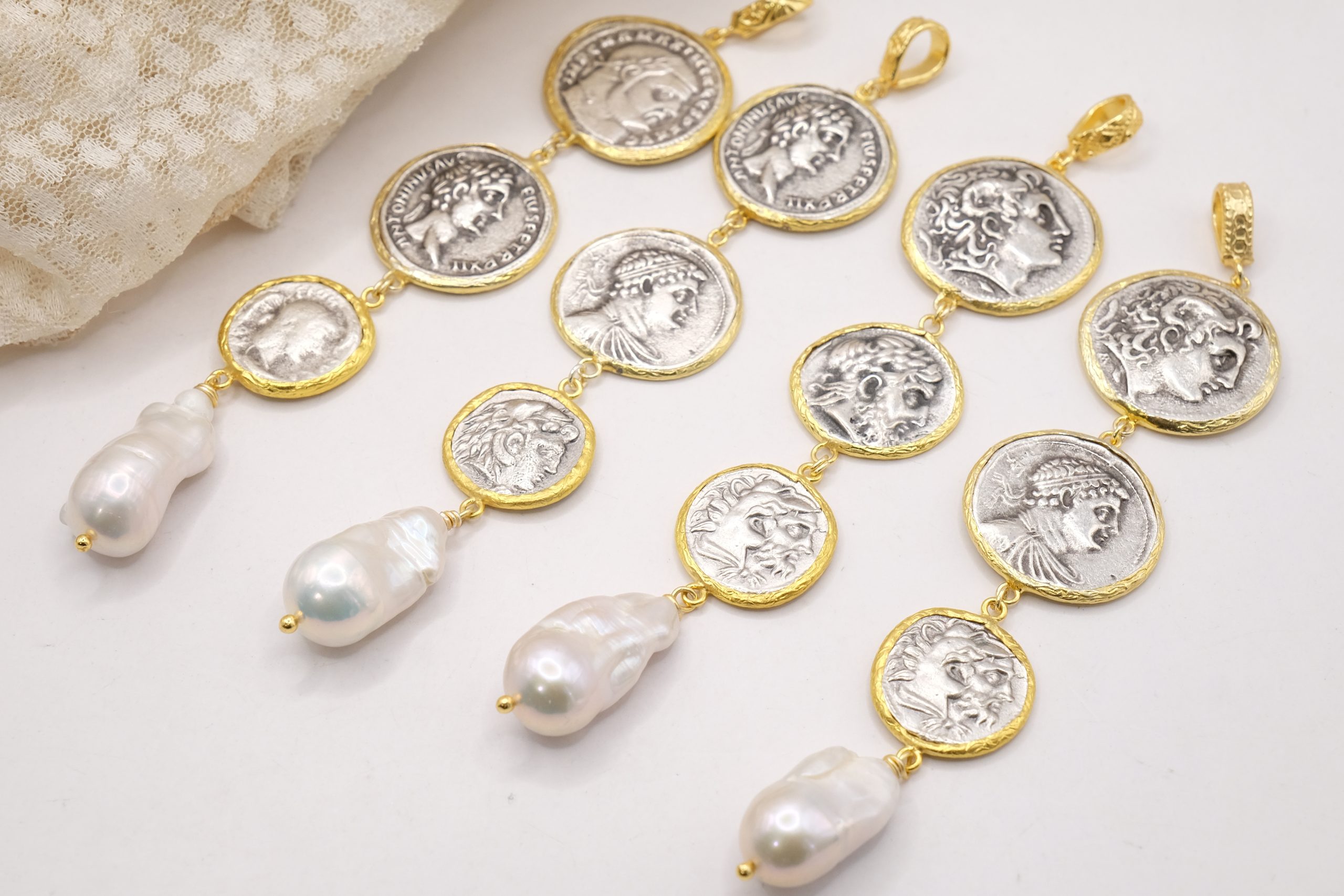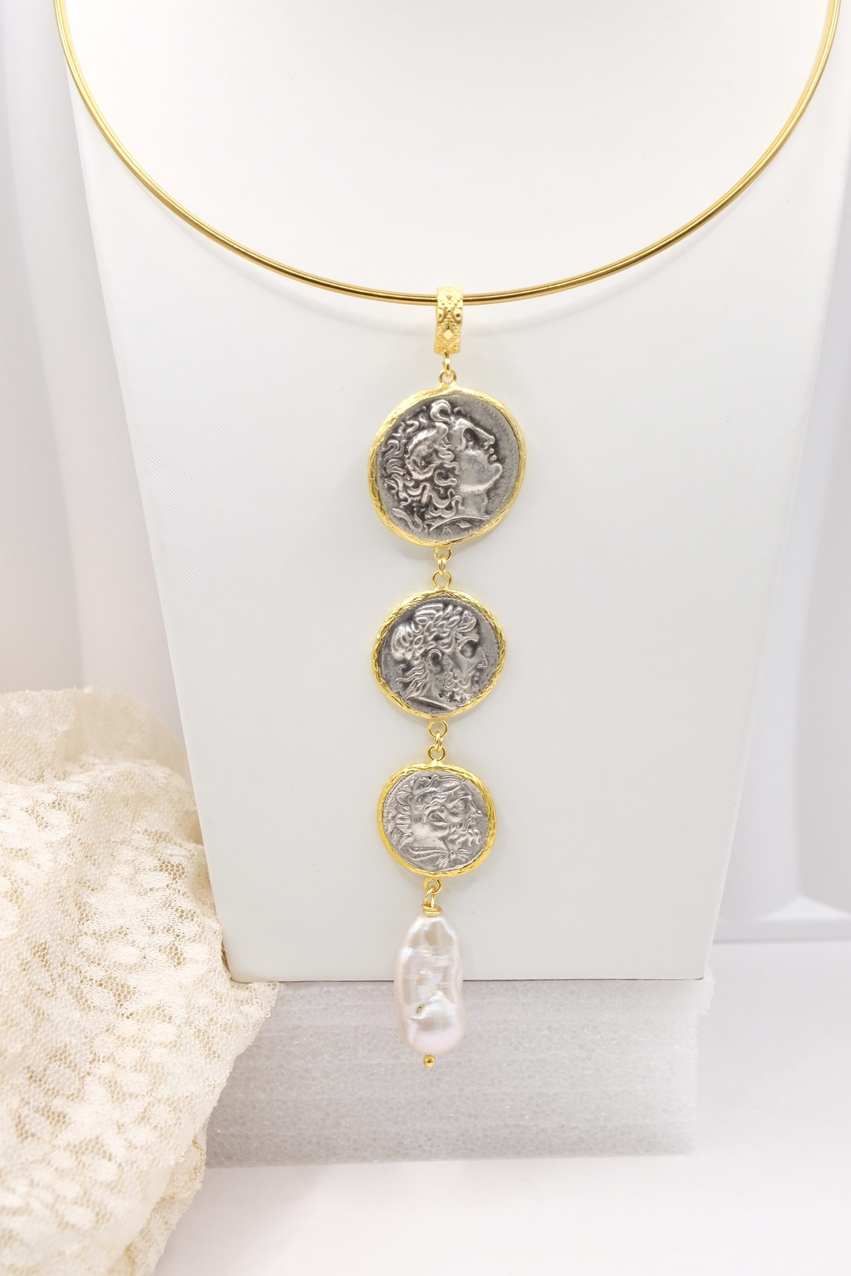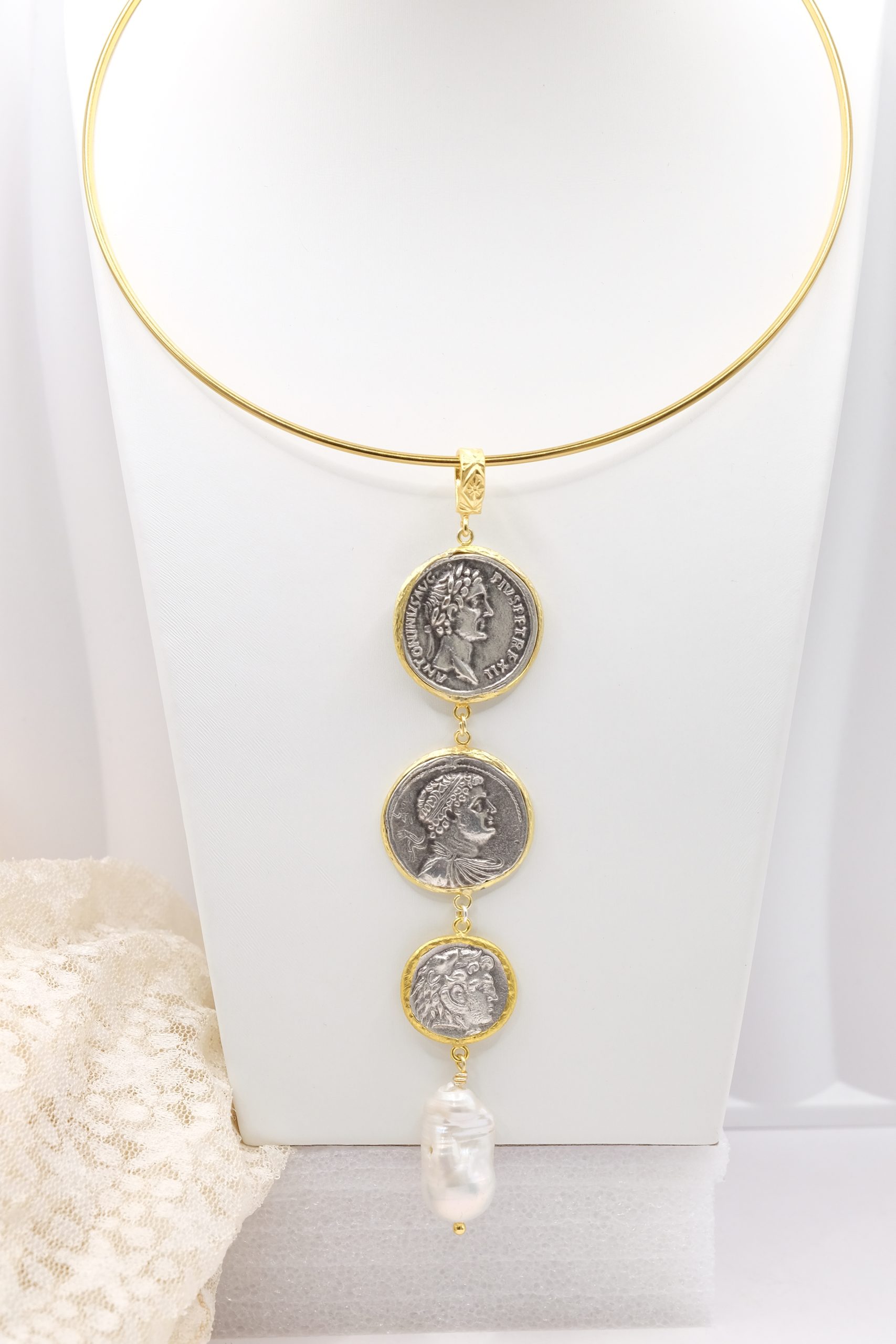 Pendant with 3 top quality antiqued double-sided coins and a natural baroque drop-shaped pearl at the end