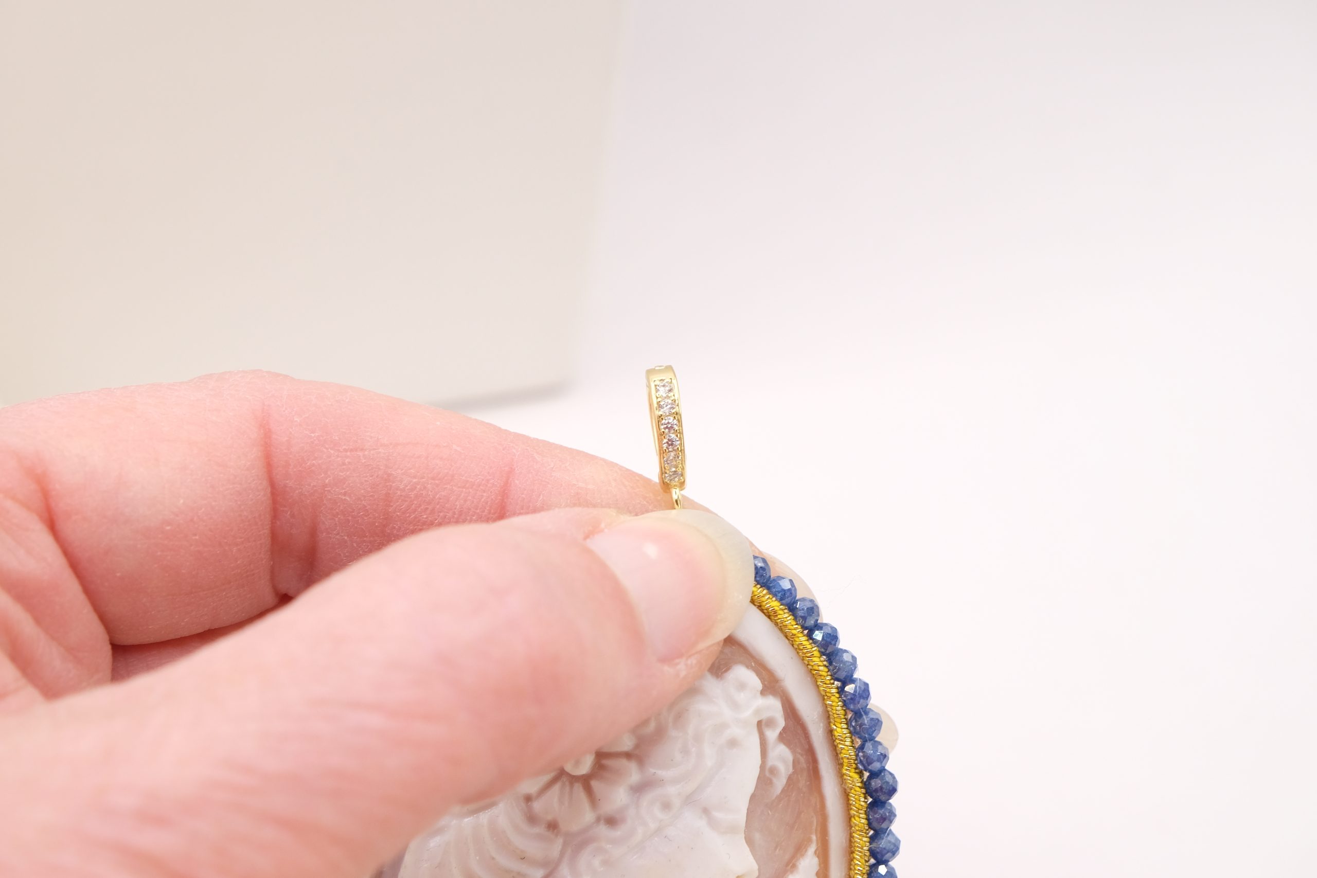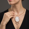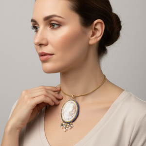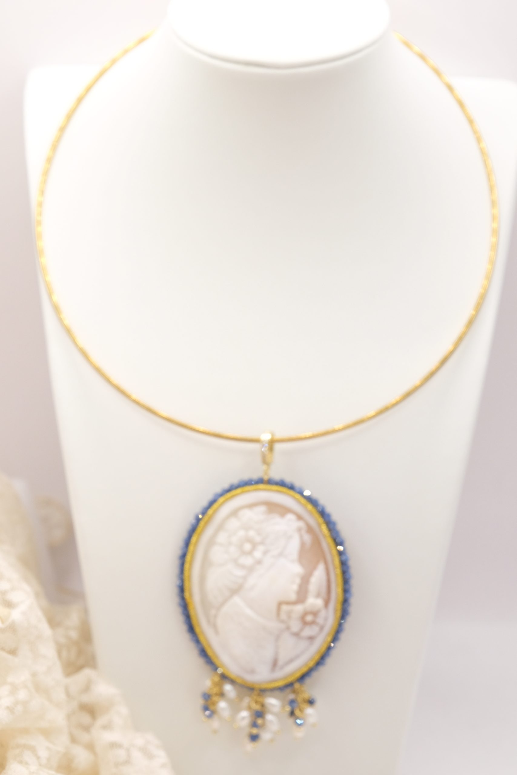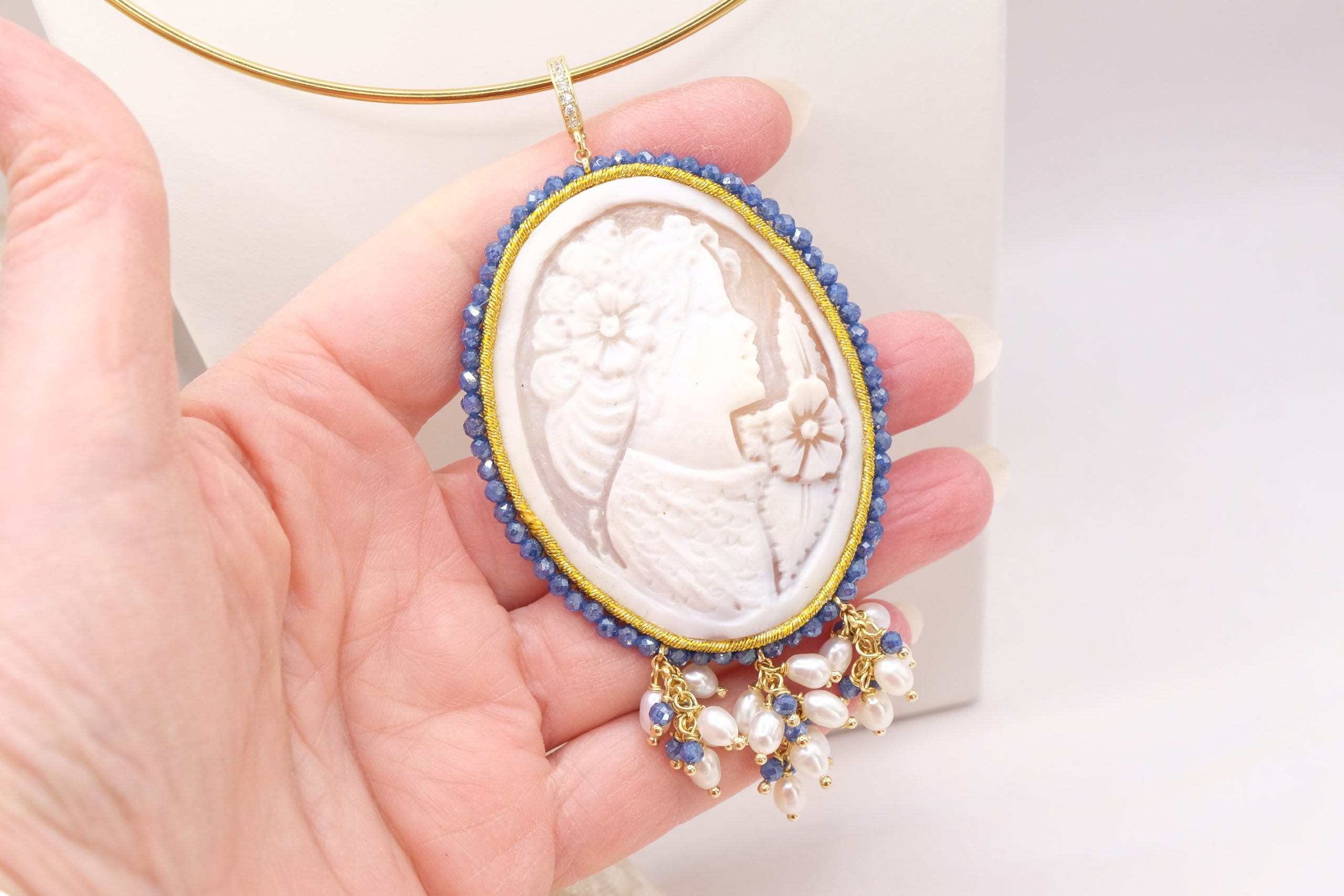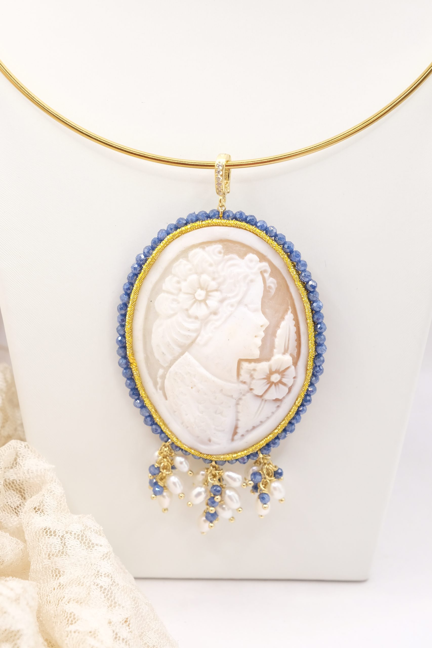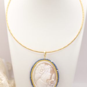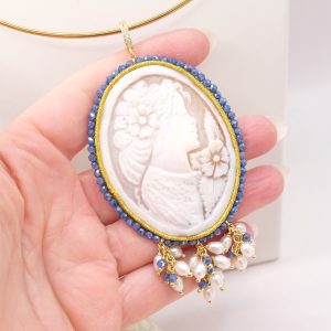 Pendant with large cameo hand-engraved by the master engravers of Torre del Greco, with sautache workmanship and natural blue zircons and trimmings, with a lady's face, 7 x 5.5 cm