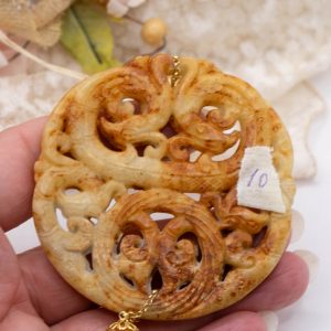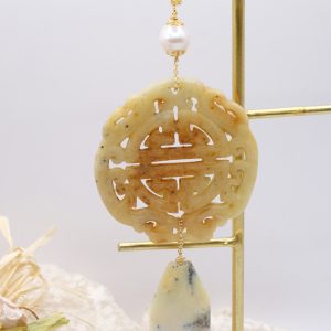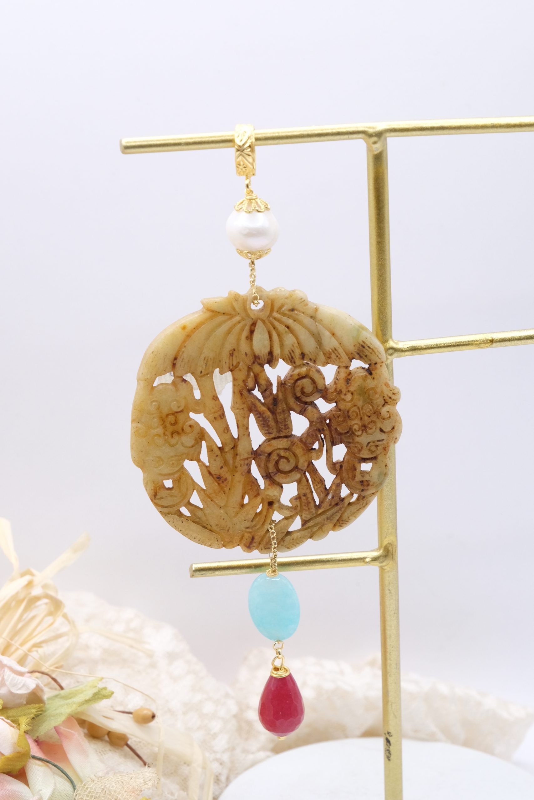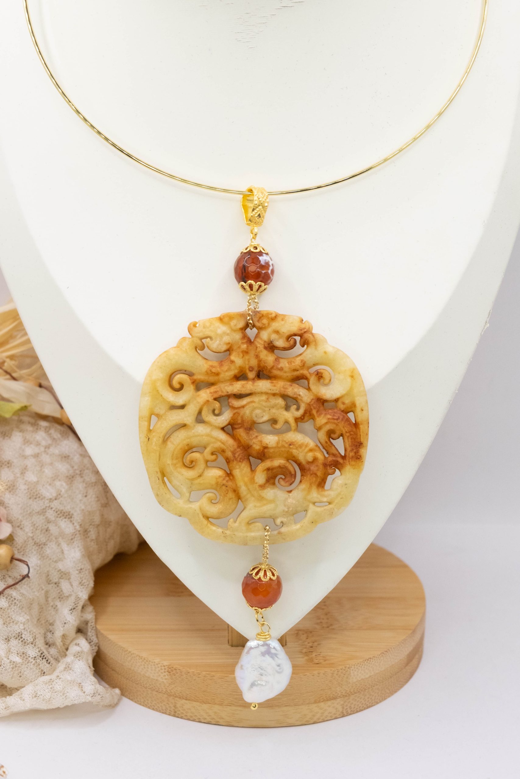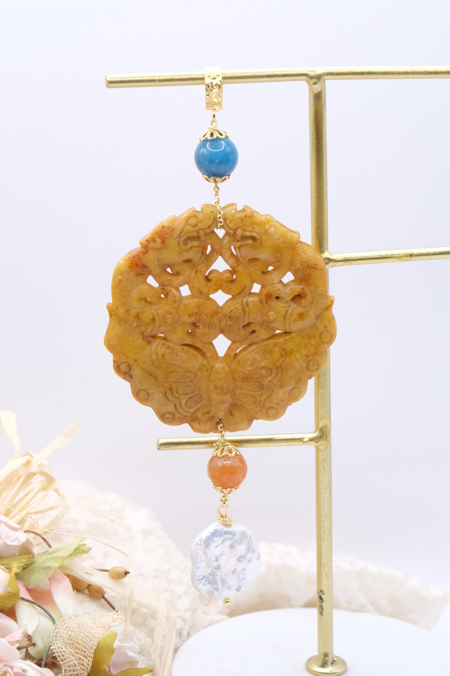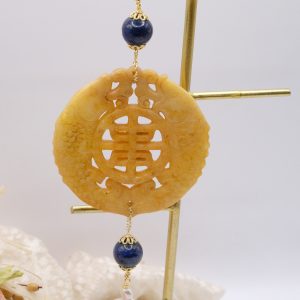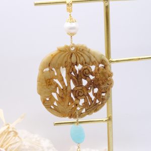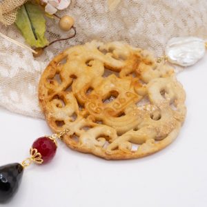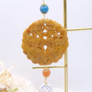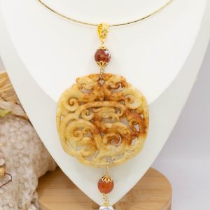 Pendant with genuine hand-inlaid jade and natural hard stones in amber tones