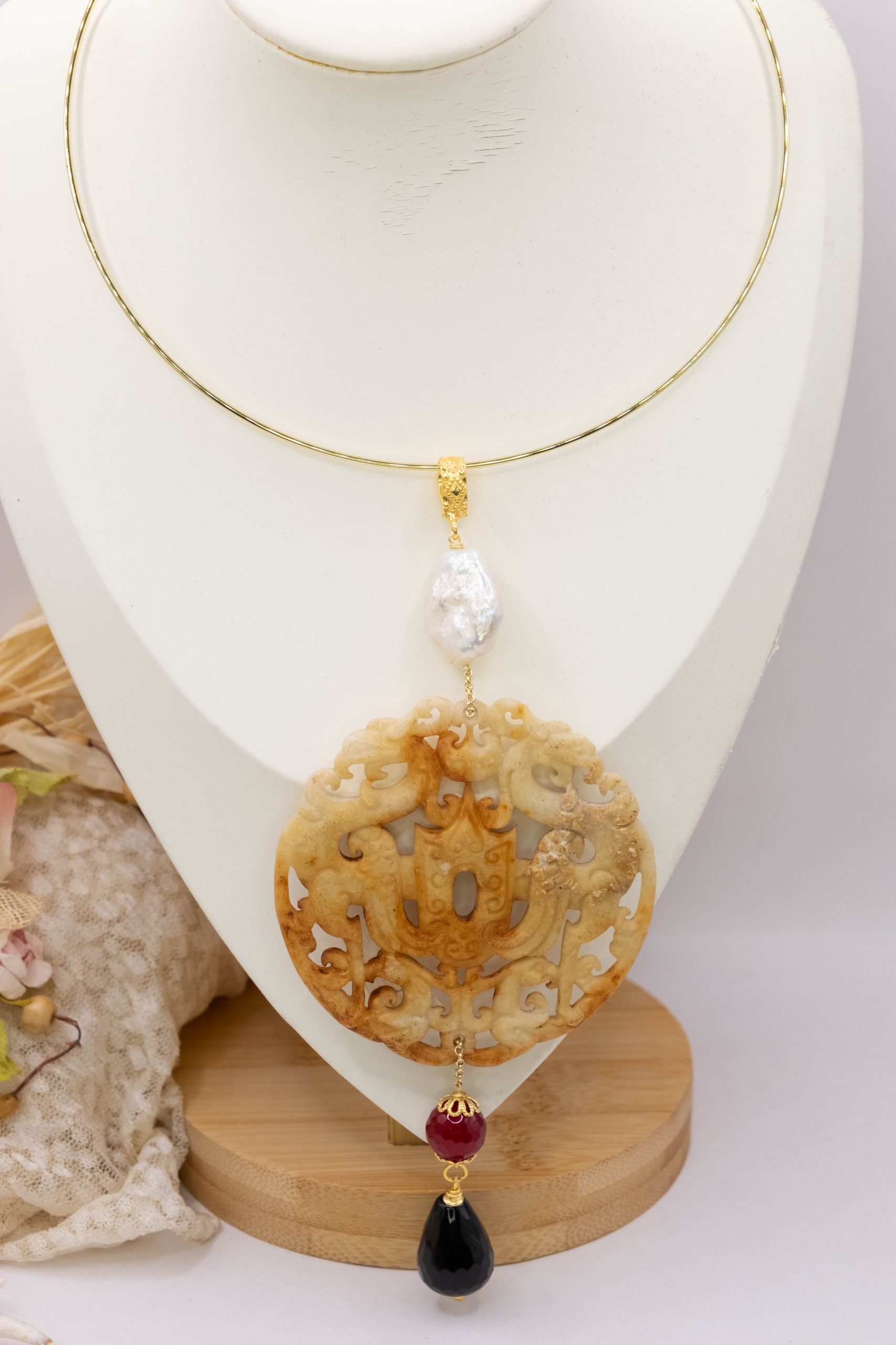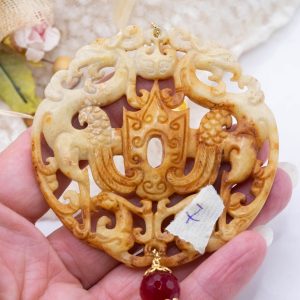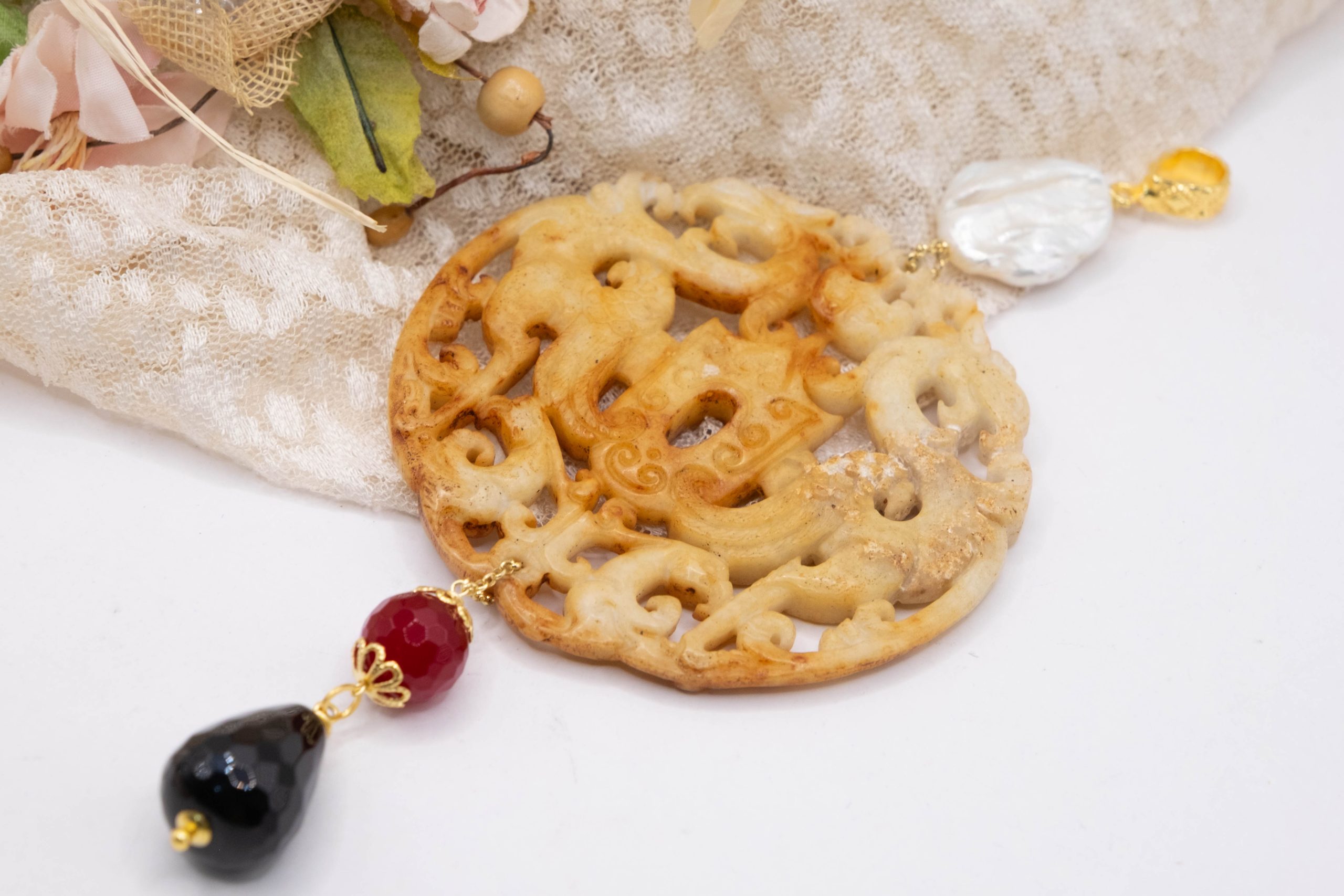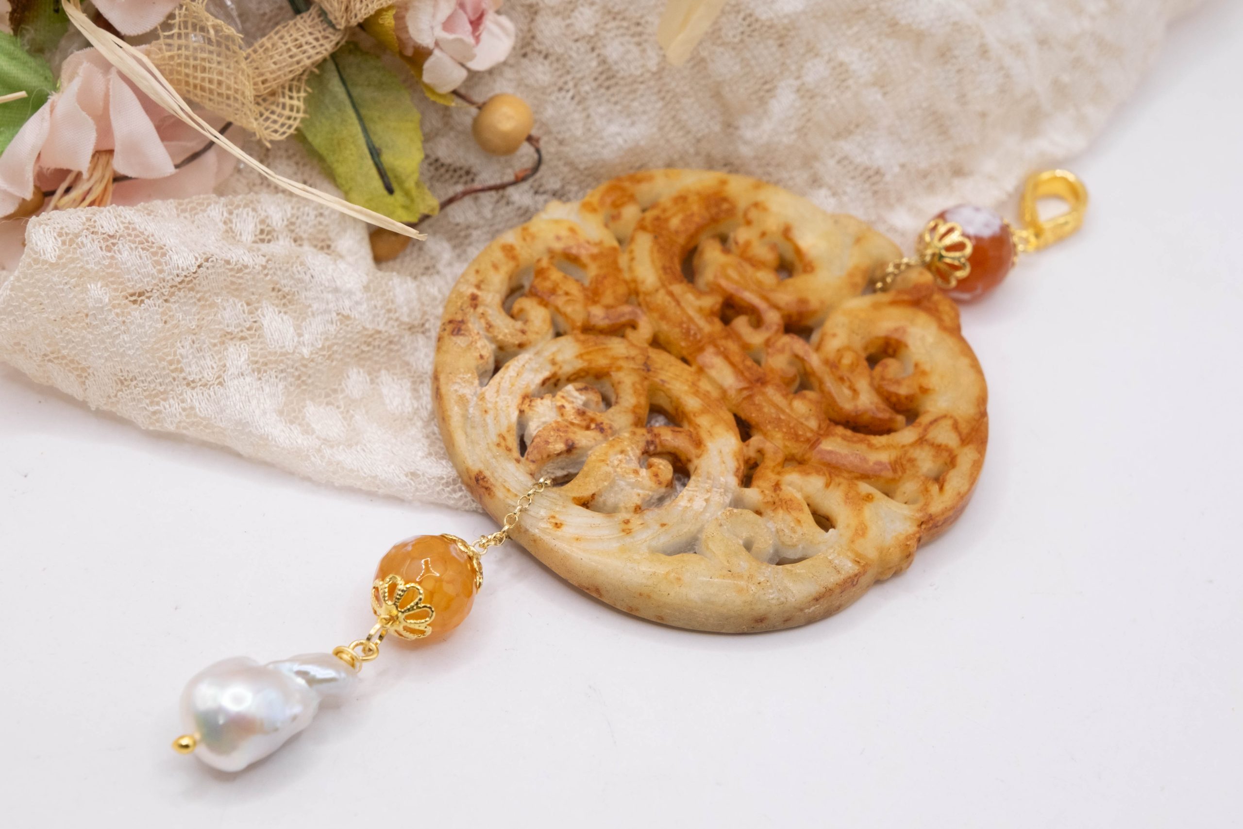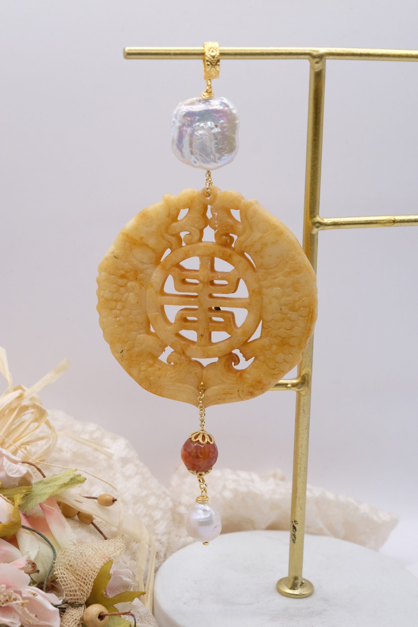 Pendant with genuine hand-inlaid jade and natural hard stones in amber tones