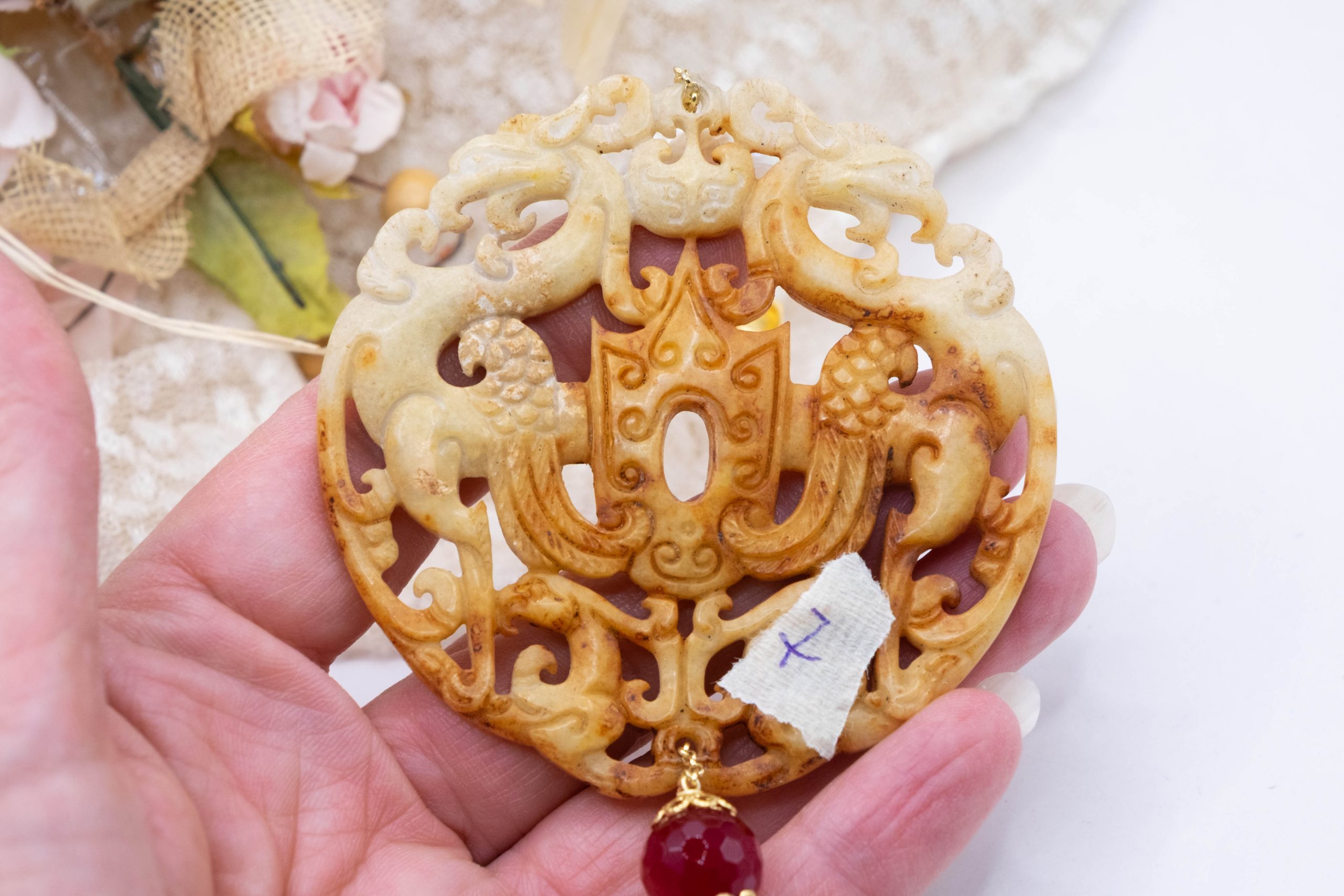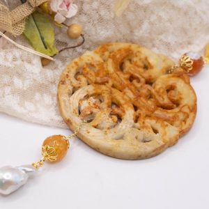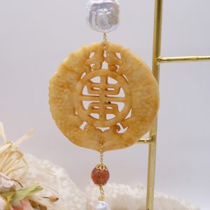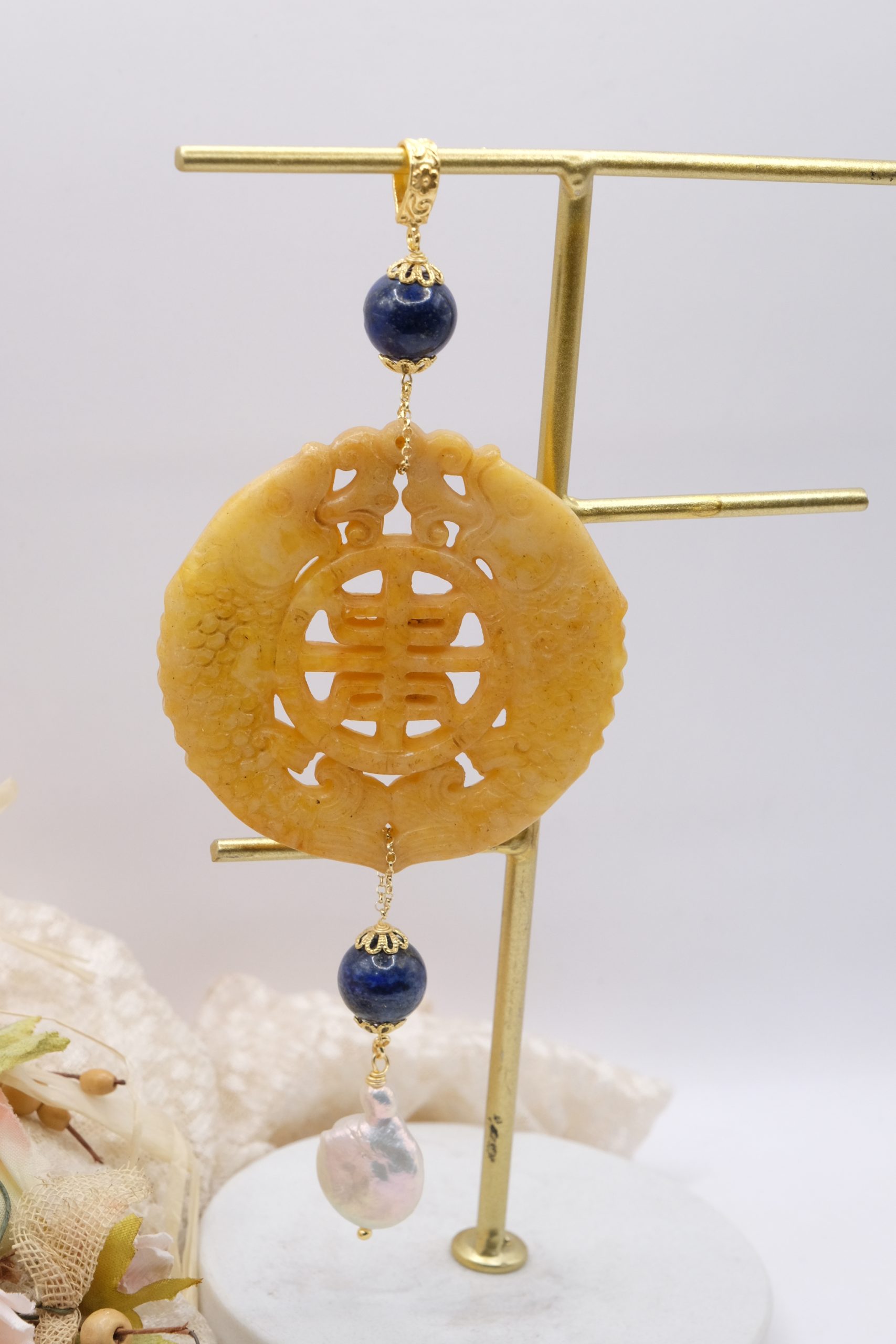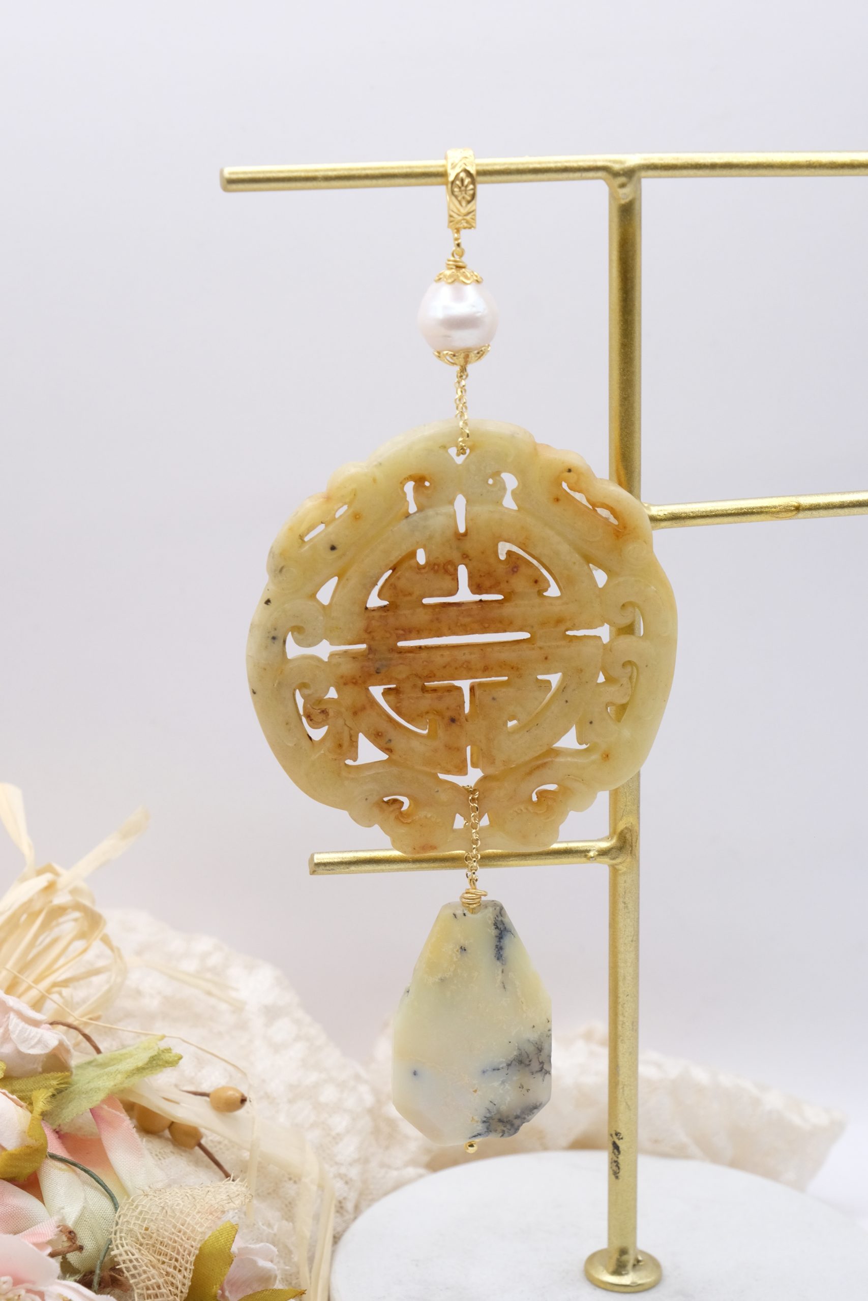 Pendant with genuine hand-inlaid jade and natural hard stones in amber tones