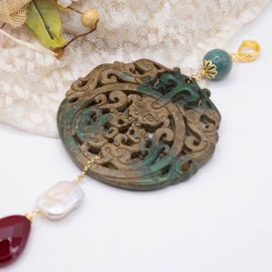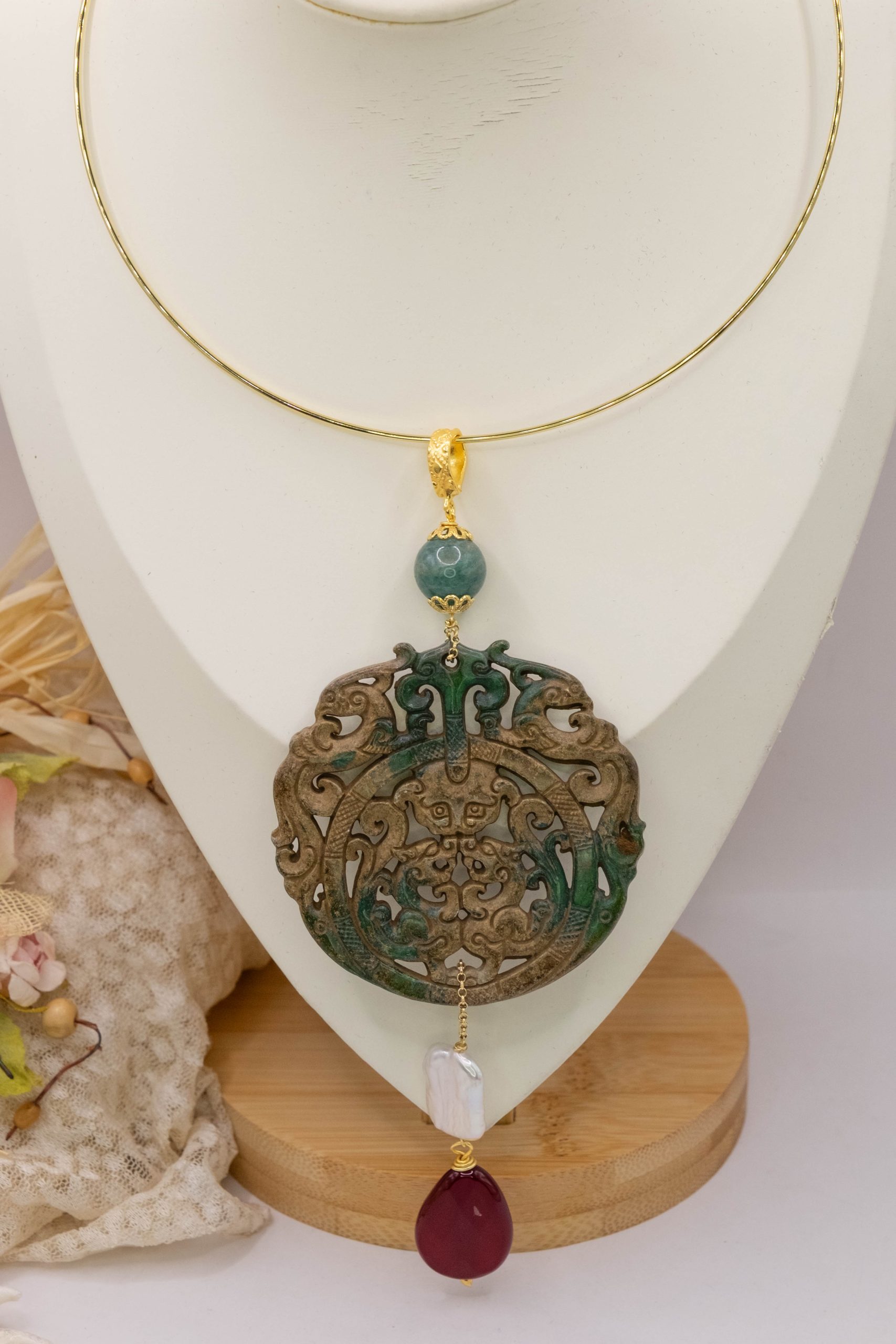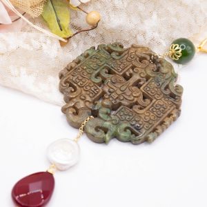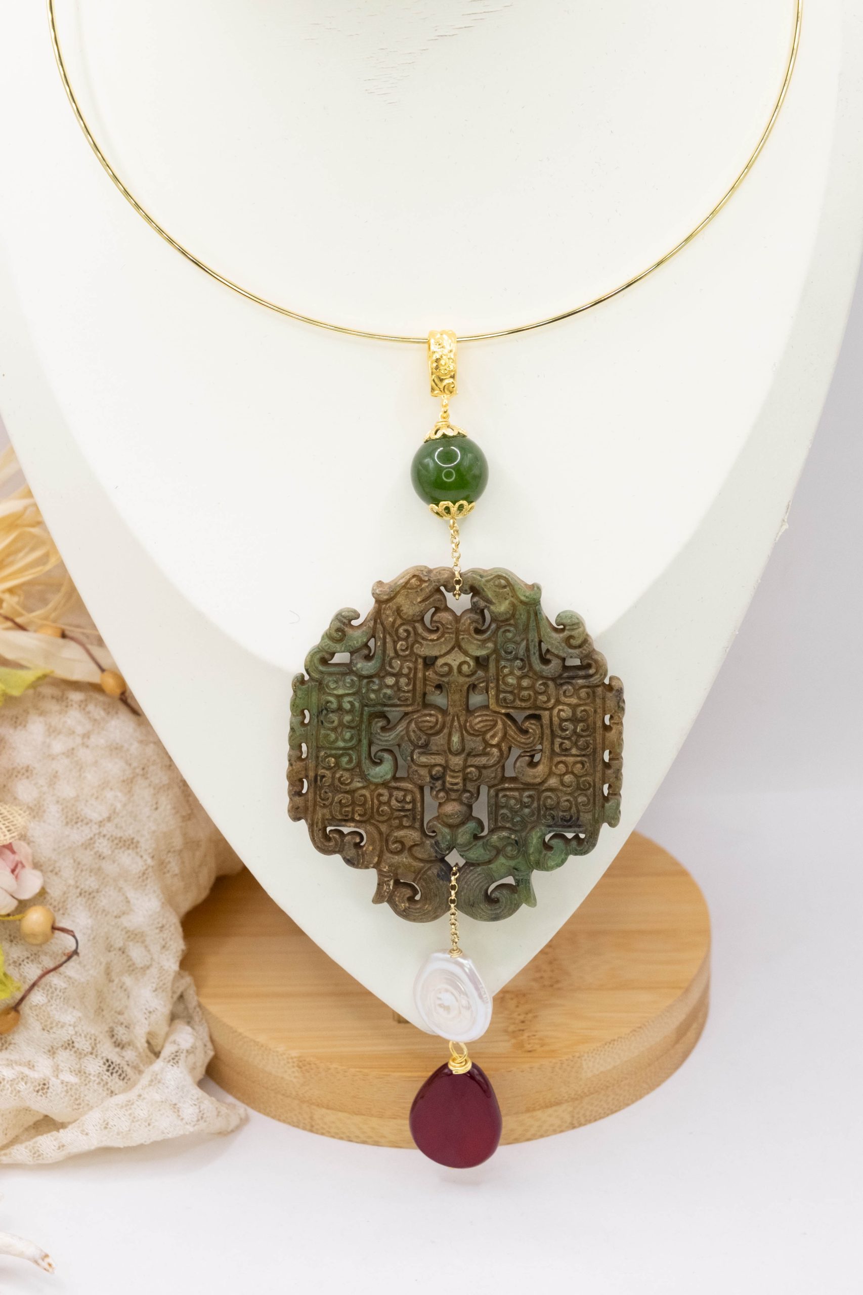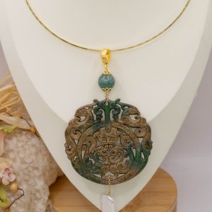 Pendant with genuine hand-inlaid jade and natural hard stones in shades of brown and green in 2 variations