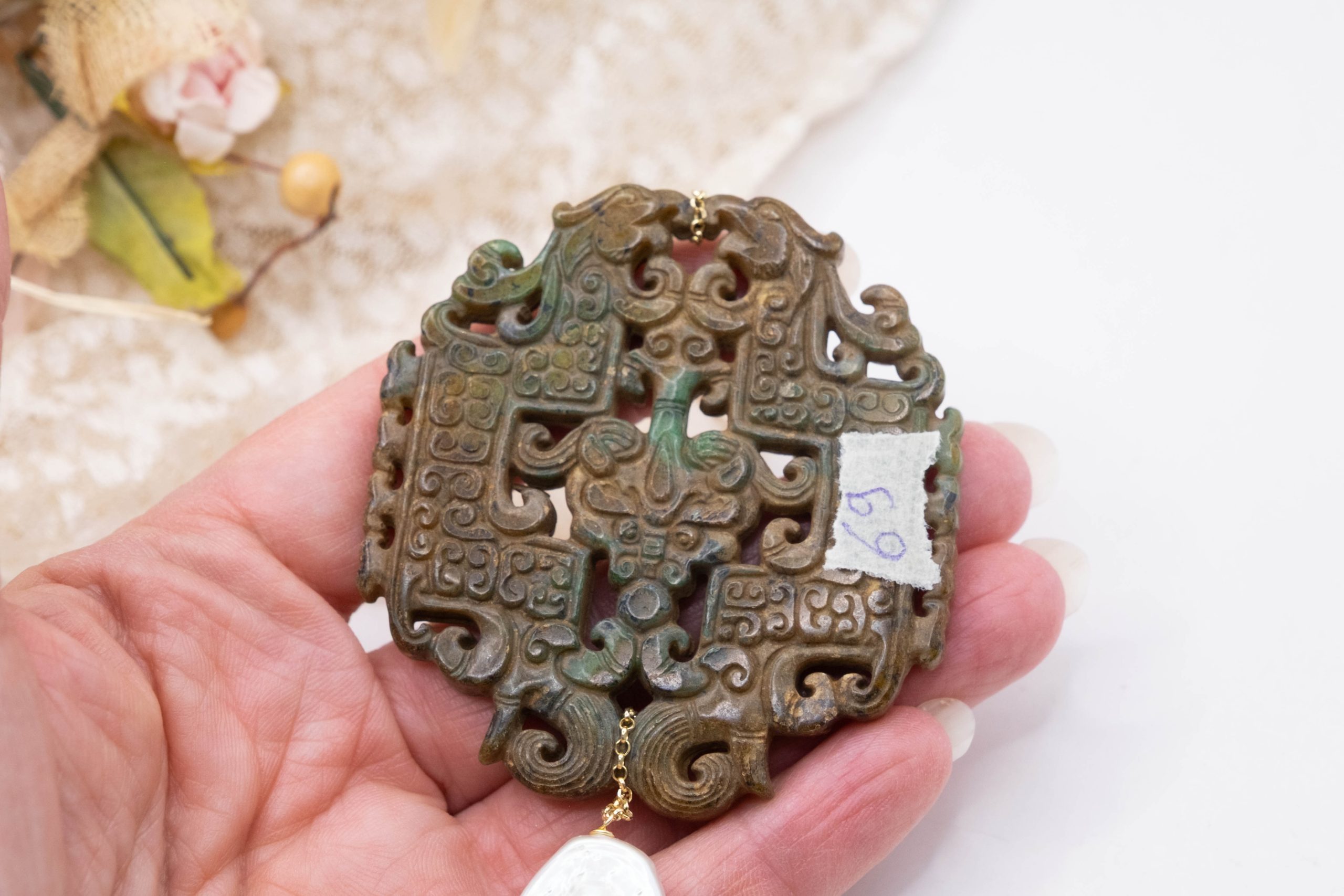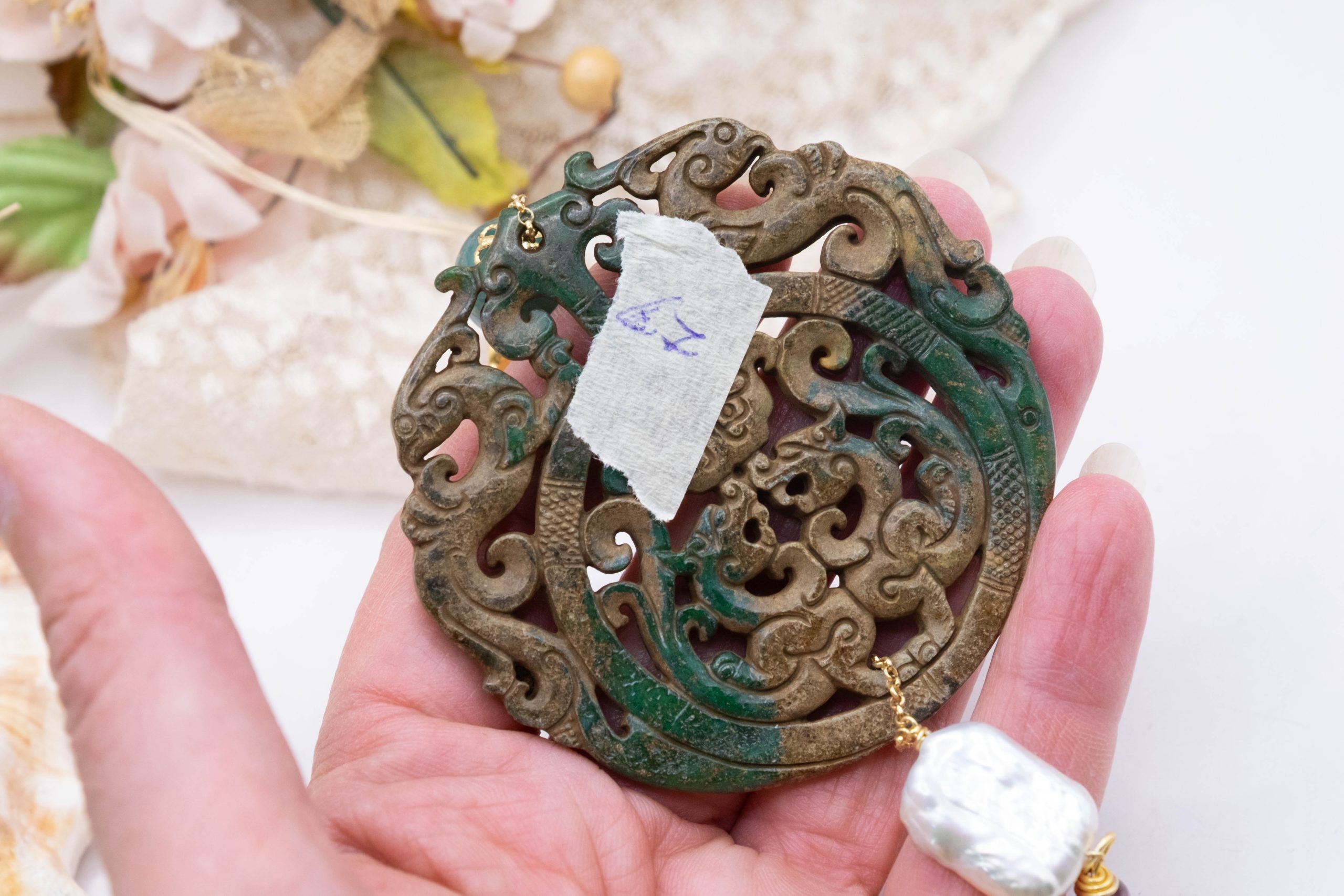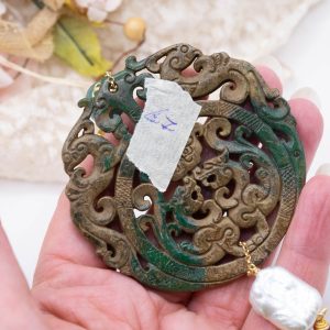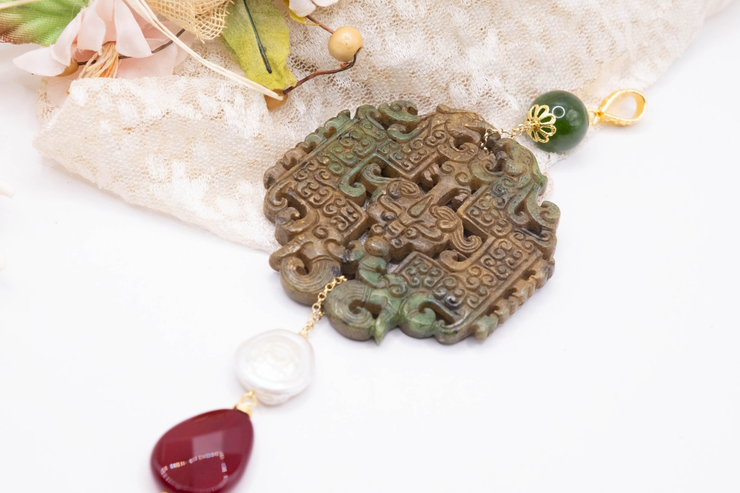 Pendant with genuine hand-inlaid jade and natural hard stones in shades of brown and green in 2 variations
