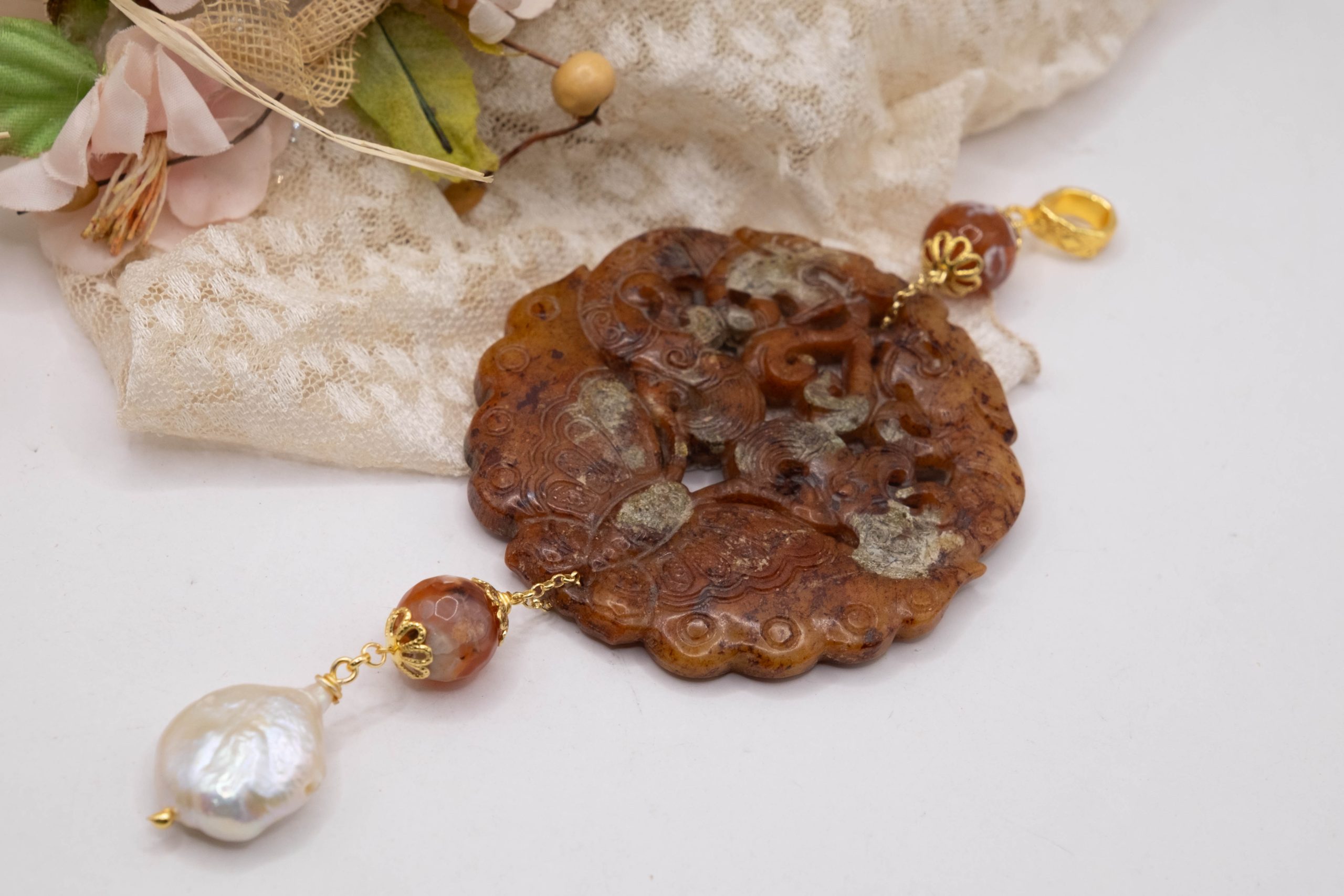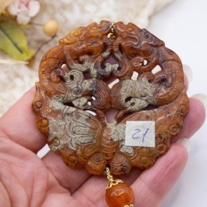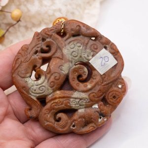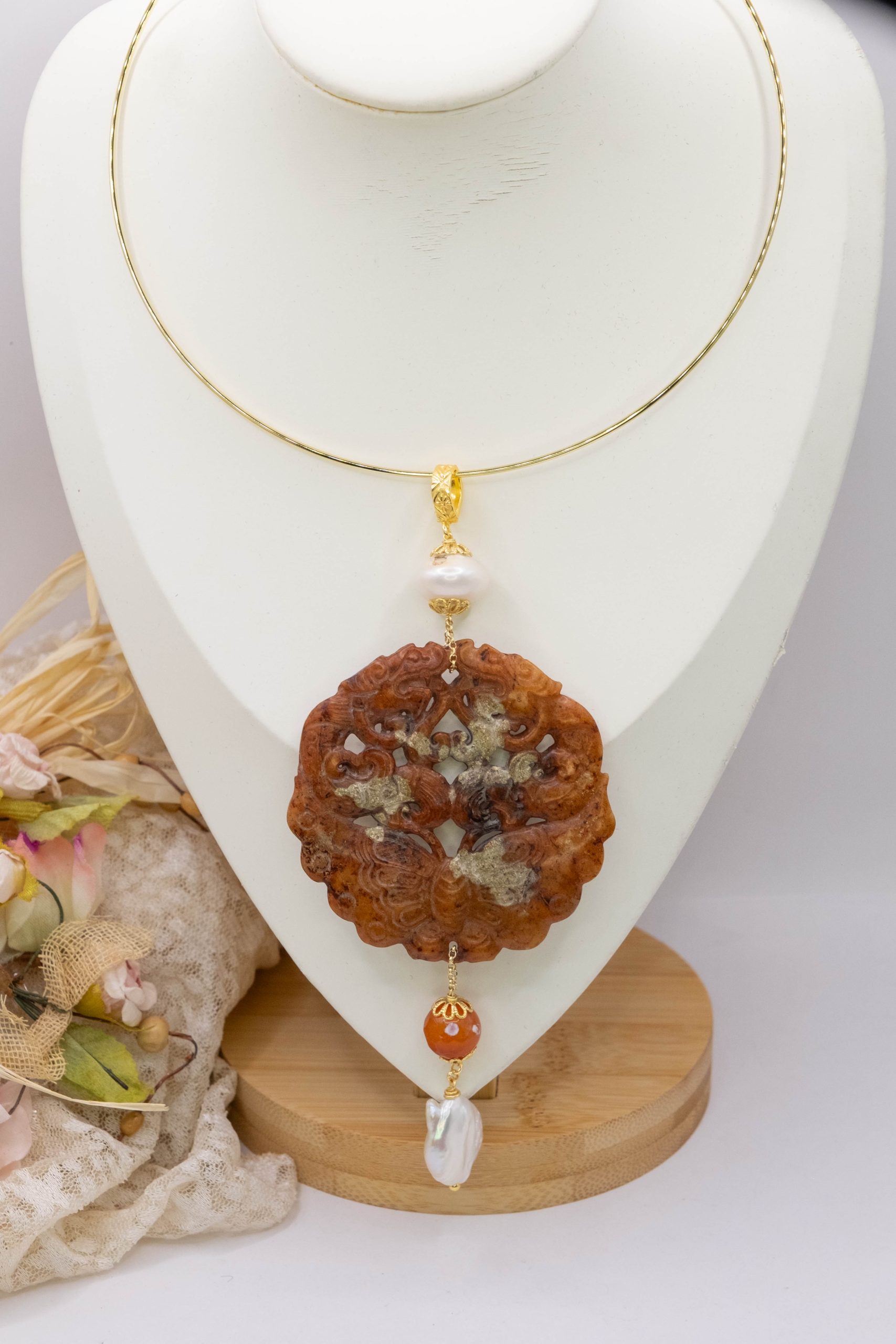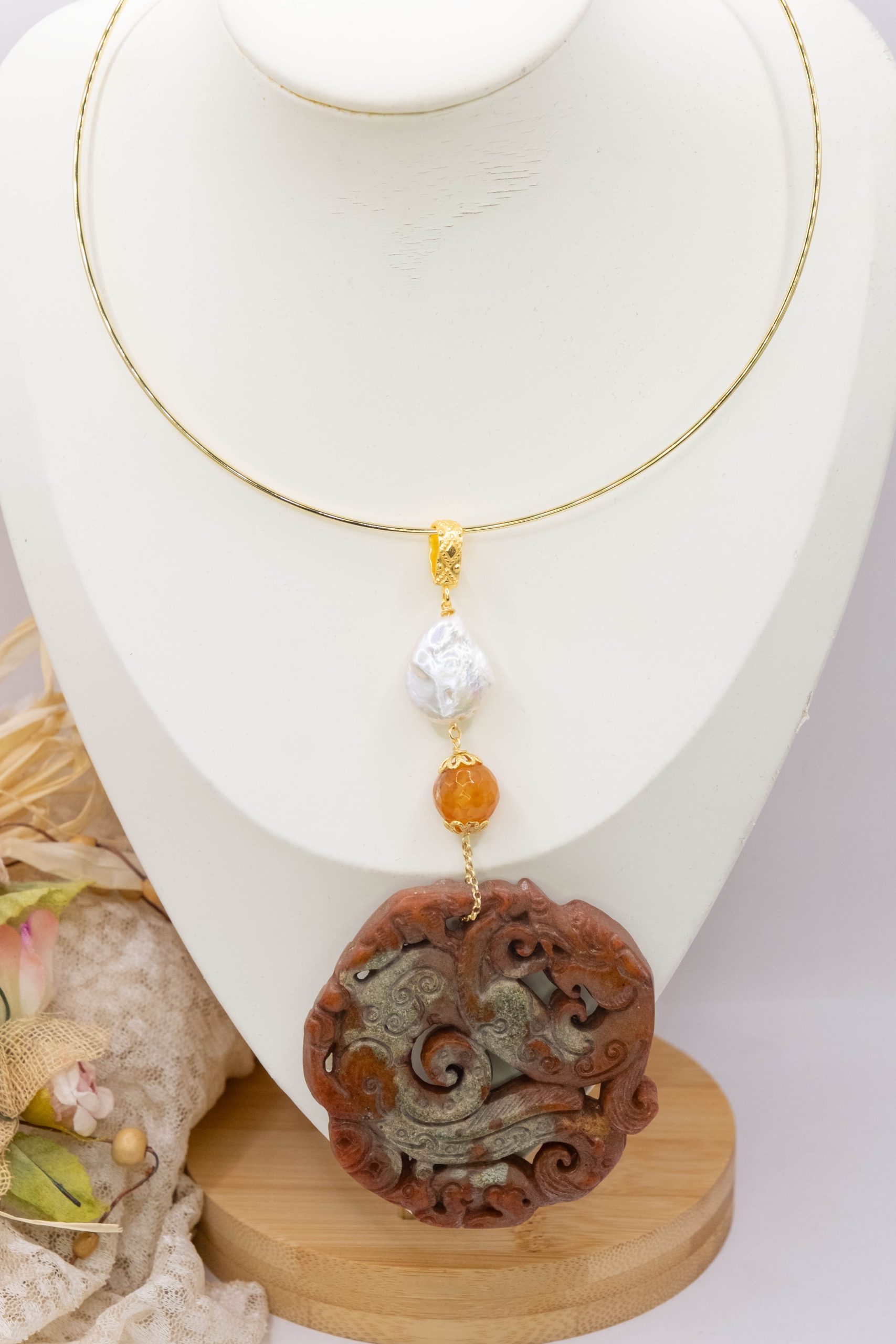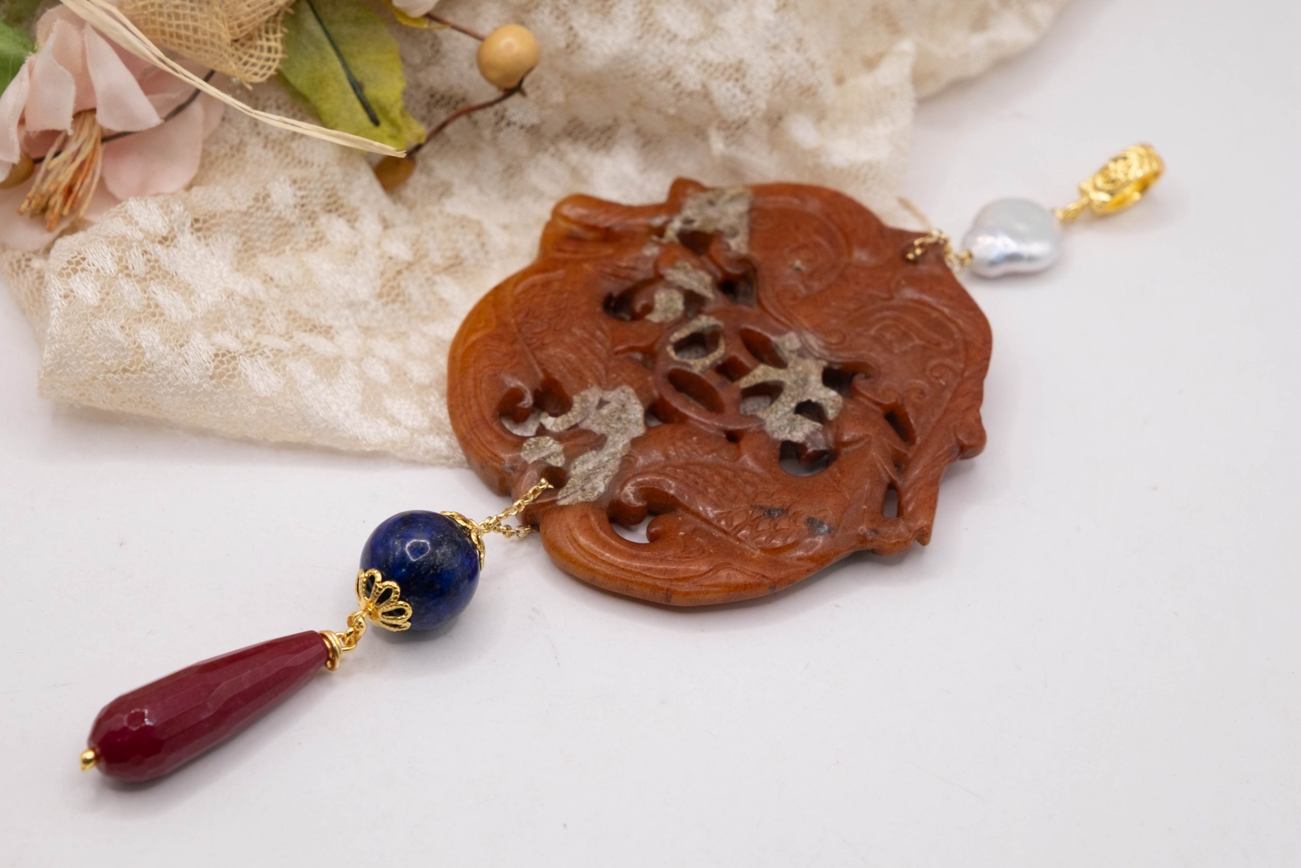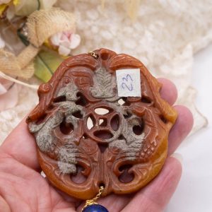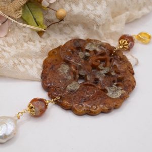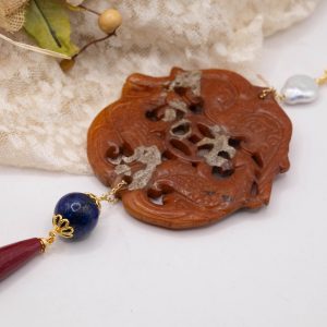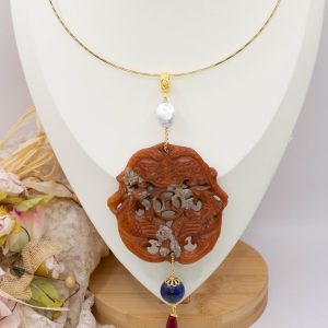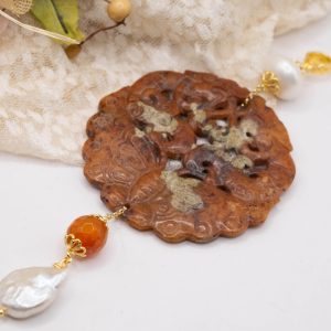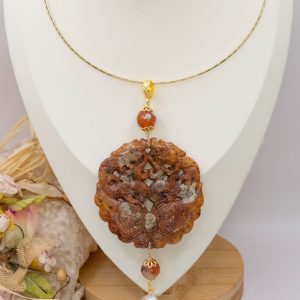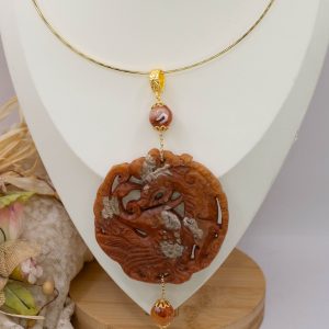 Pendant with genuine hand-inlaid jade and natural hard stones in shades of brown variegated in 5 variations