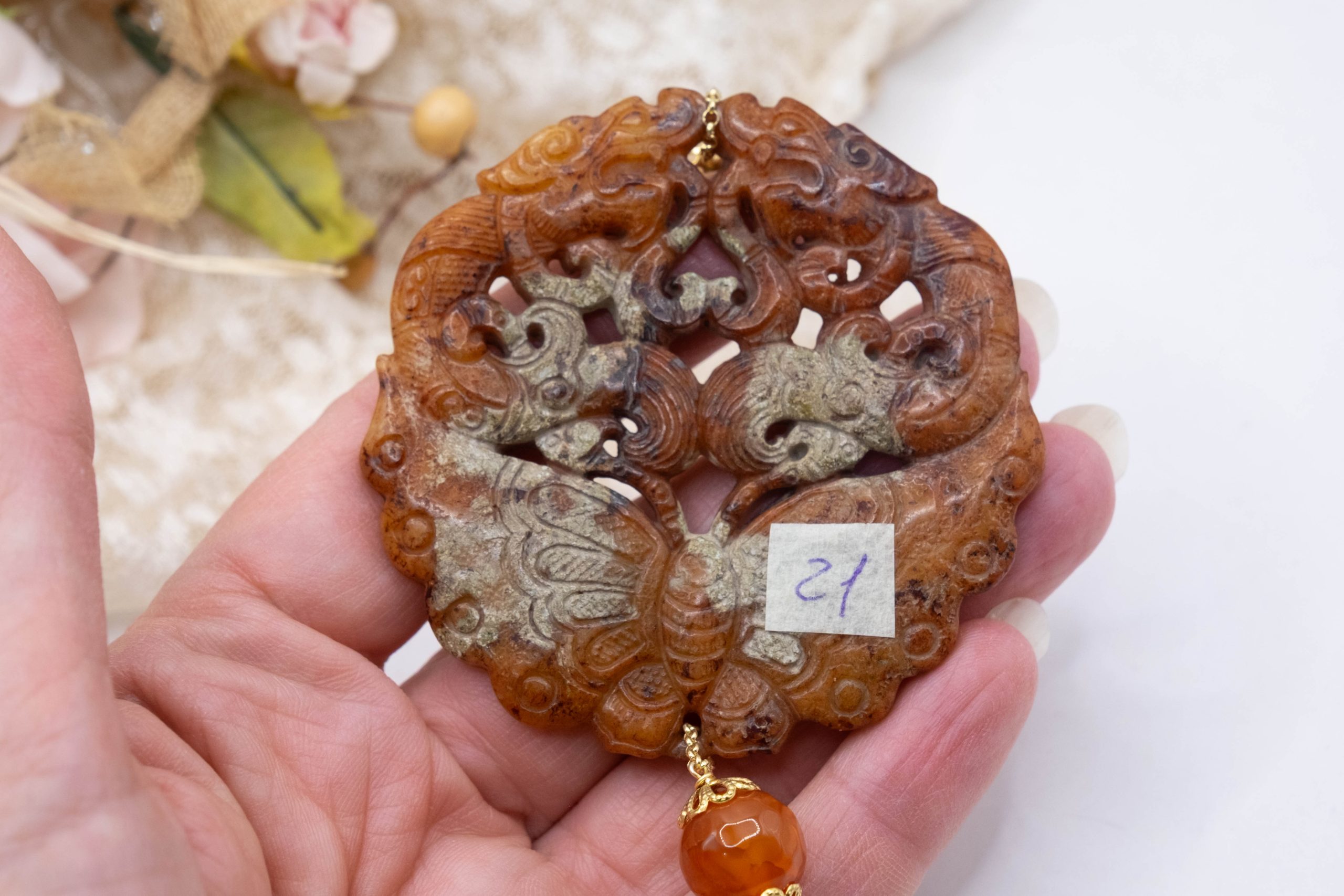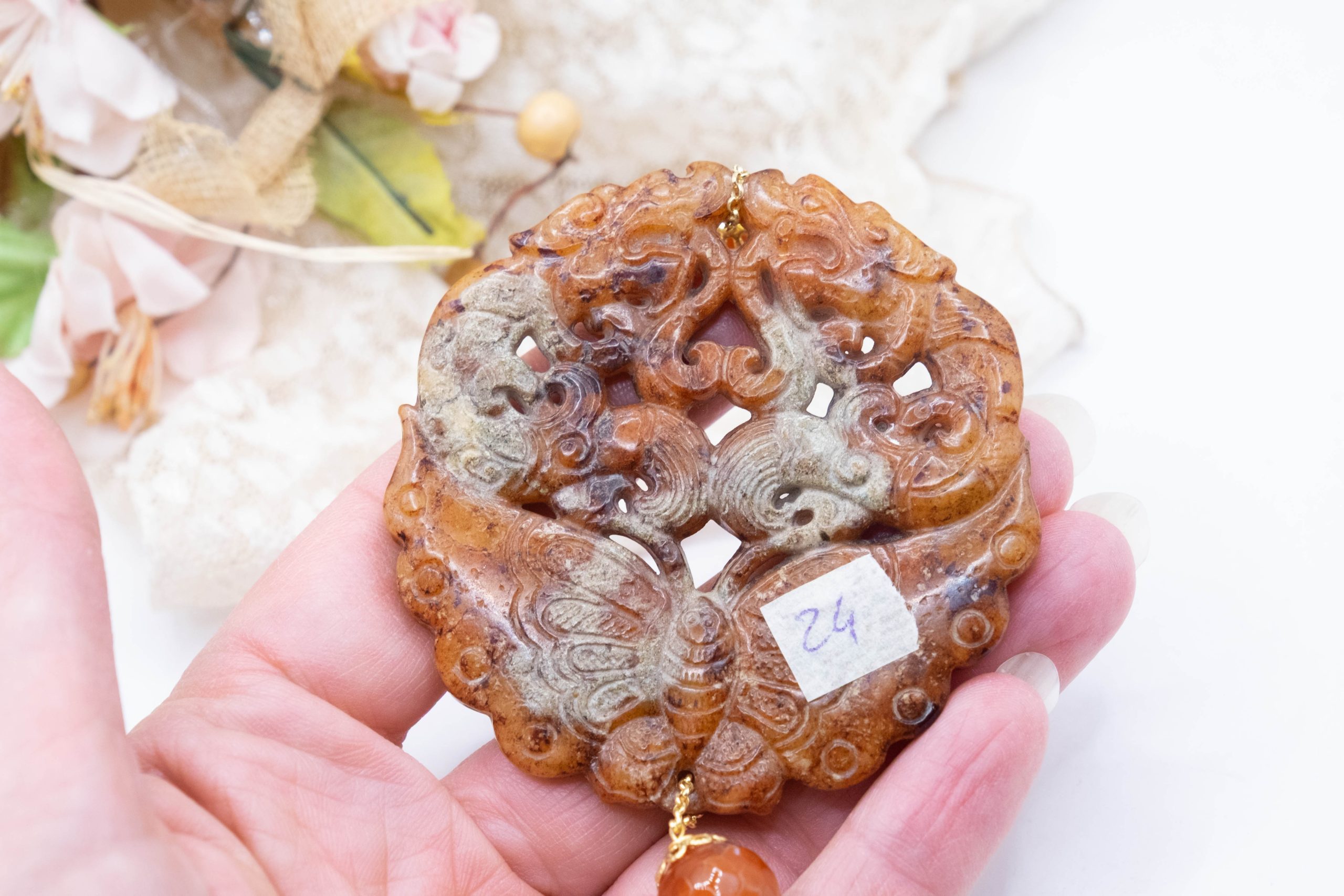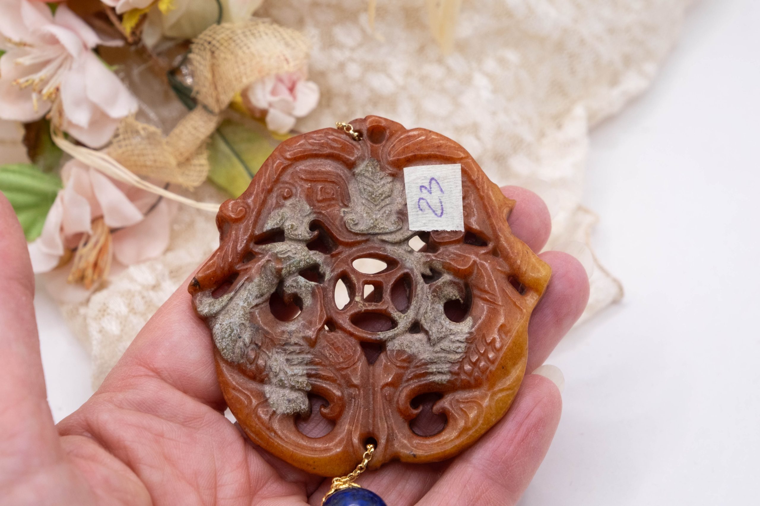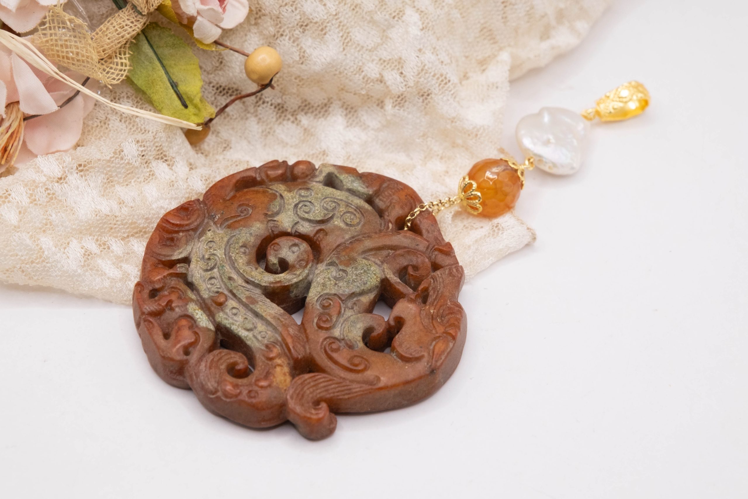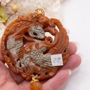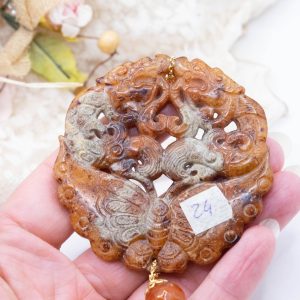 Pendant with genuine hand-inlaid jade and natural hard stones in shades of brown variegated in 5 variations