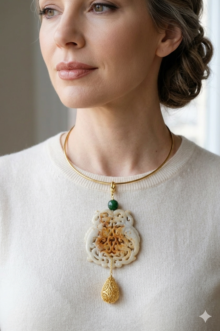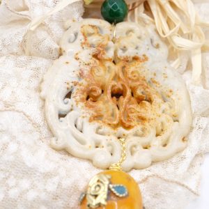 Made with giada scolpita a mano nei toni crema con delicate screziature color ambra, impreziosito da green jade e da un elegante elemento nepalese che richiama le lavorazioni tradizionali orientali.