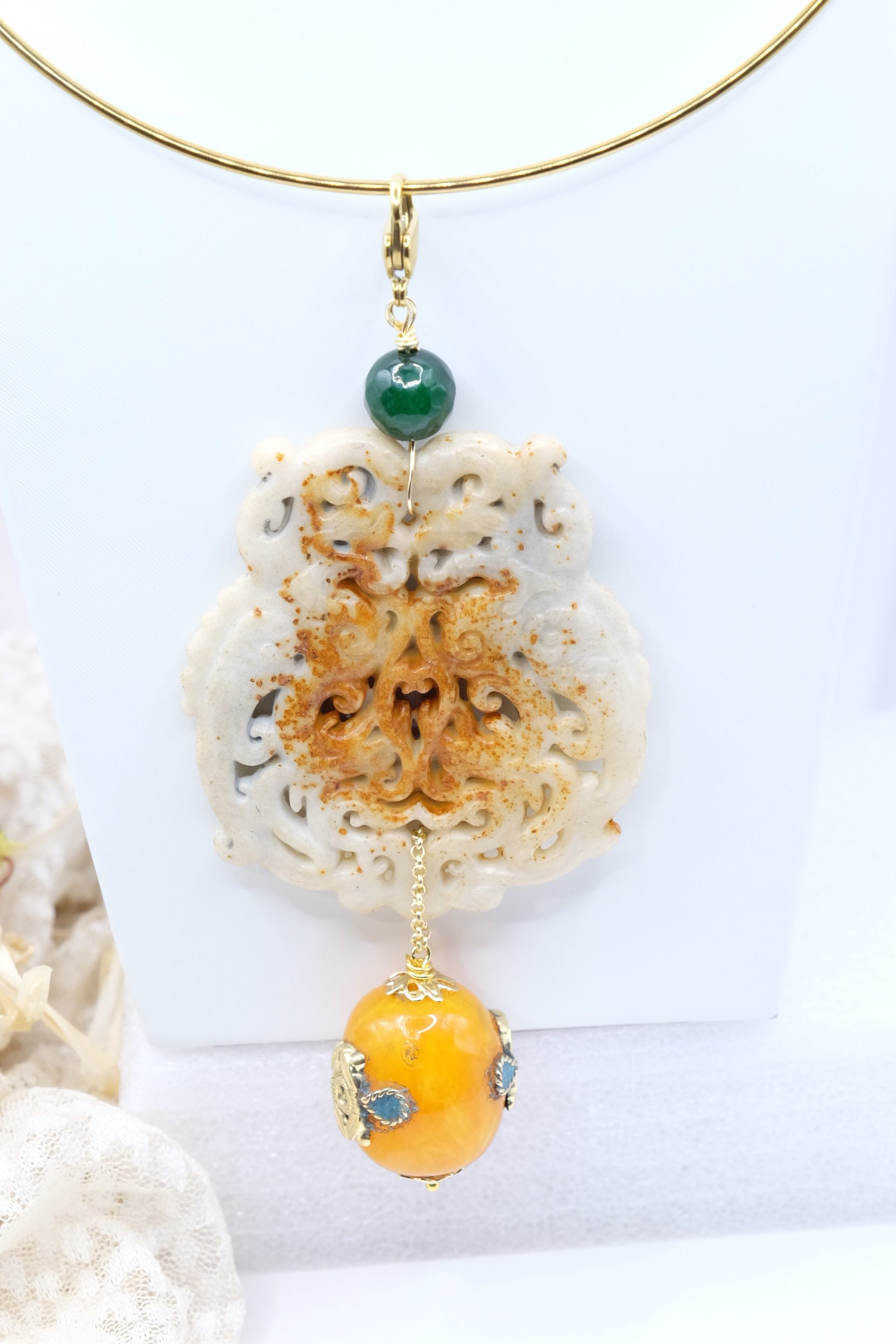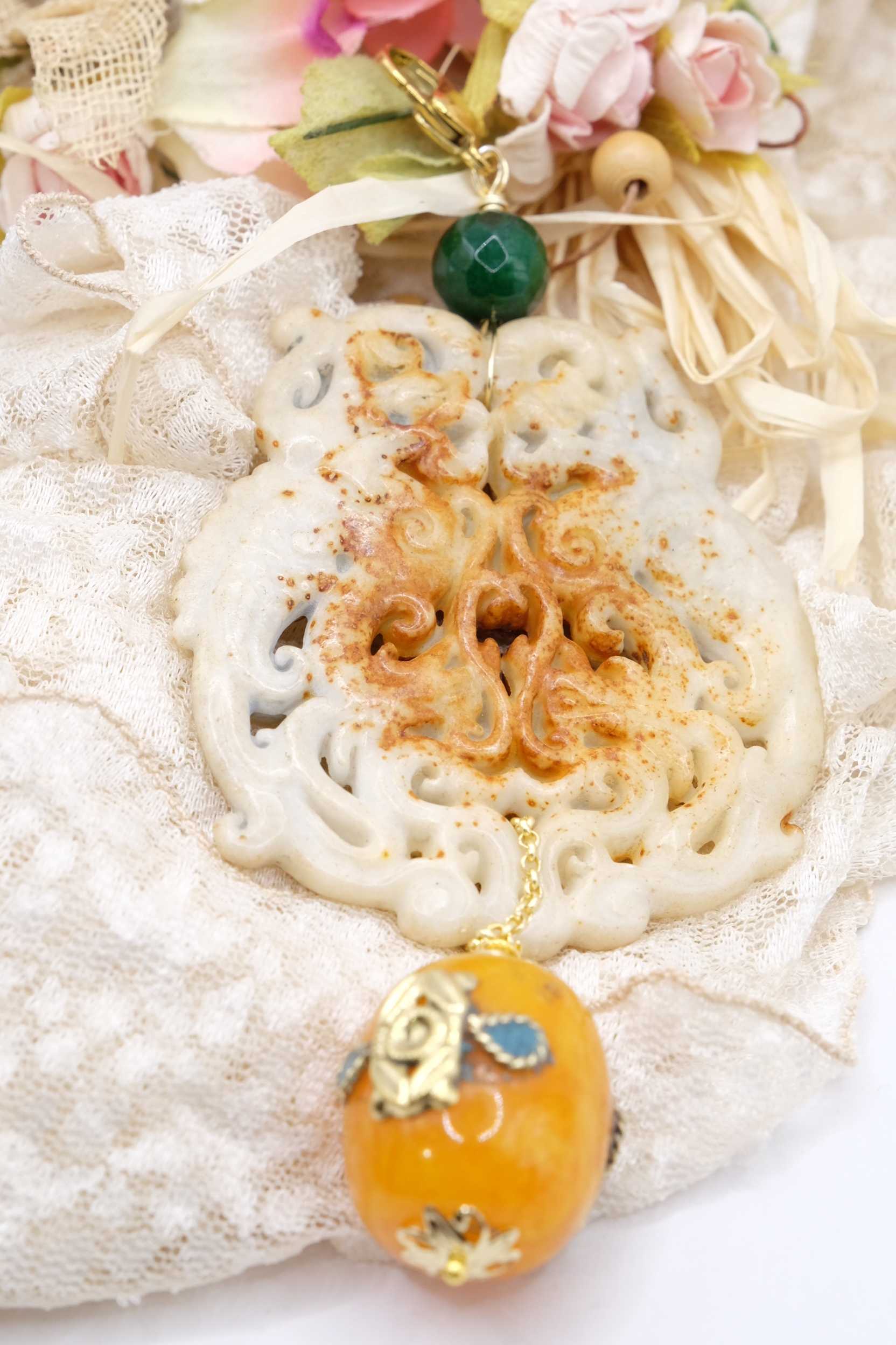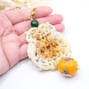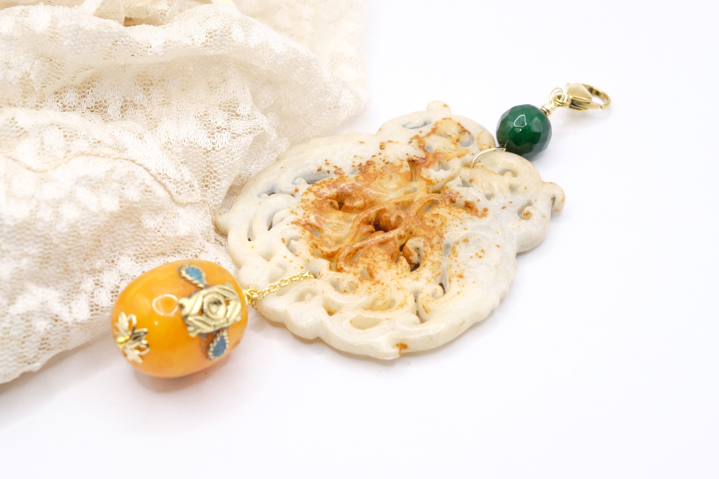 Ciondolo con giada scolpita a mano crema screziata in color ambra, giada verde e elemento nepalese. Finita con moschettone che vi permetterà di usarlo su qualsisi collana