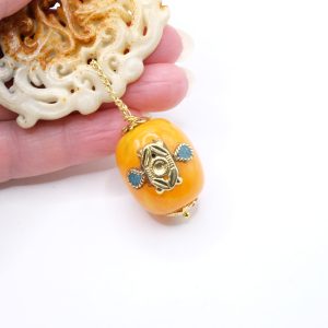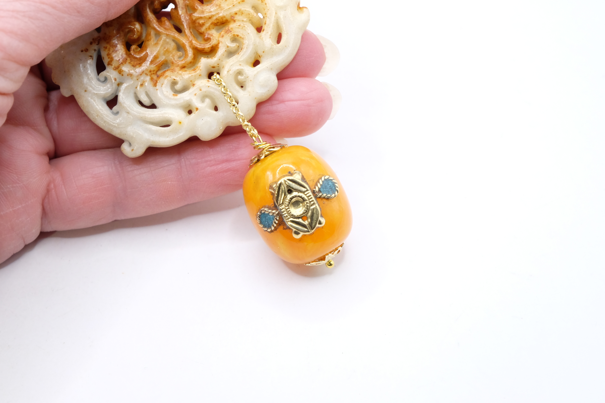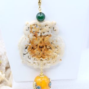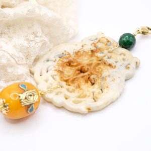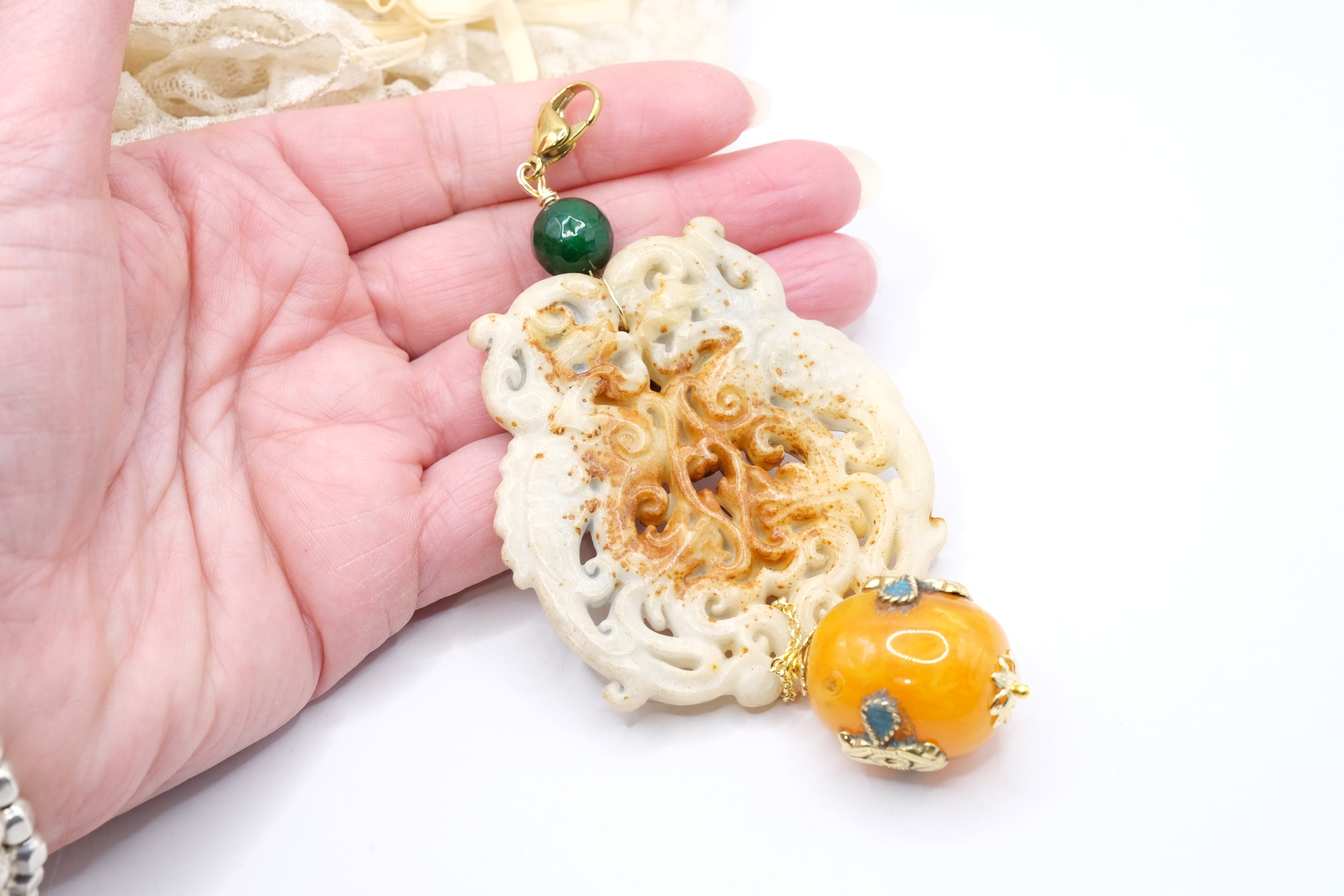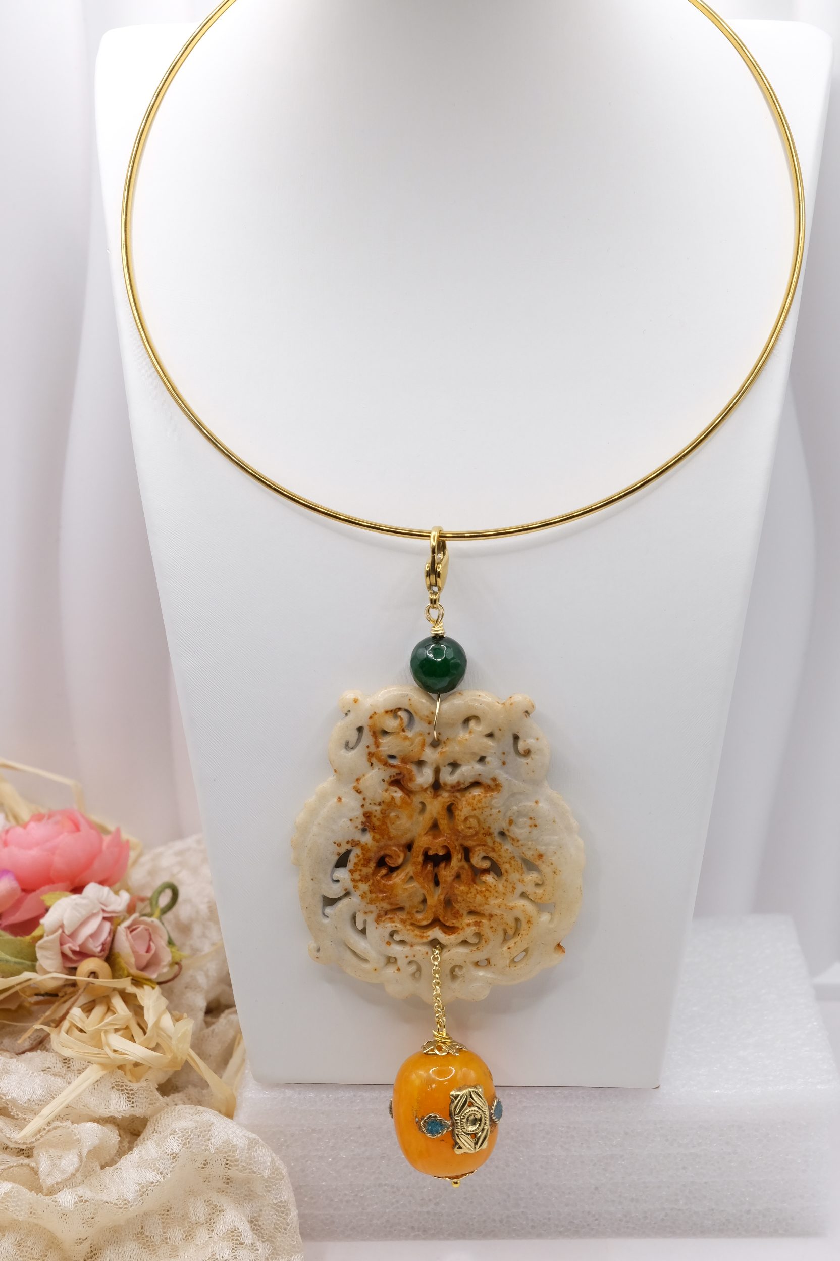 Ciondolo con giada scolpita a mano crema screziata in color ambra, giada verde e elemento nepalese. Finita con moschettone che vi permetterà di usarlo su qualsisi collana
