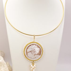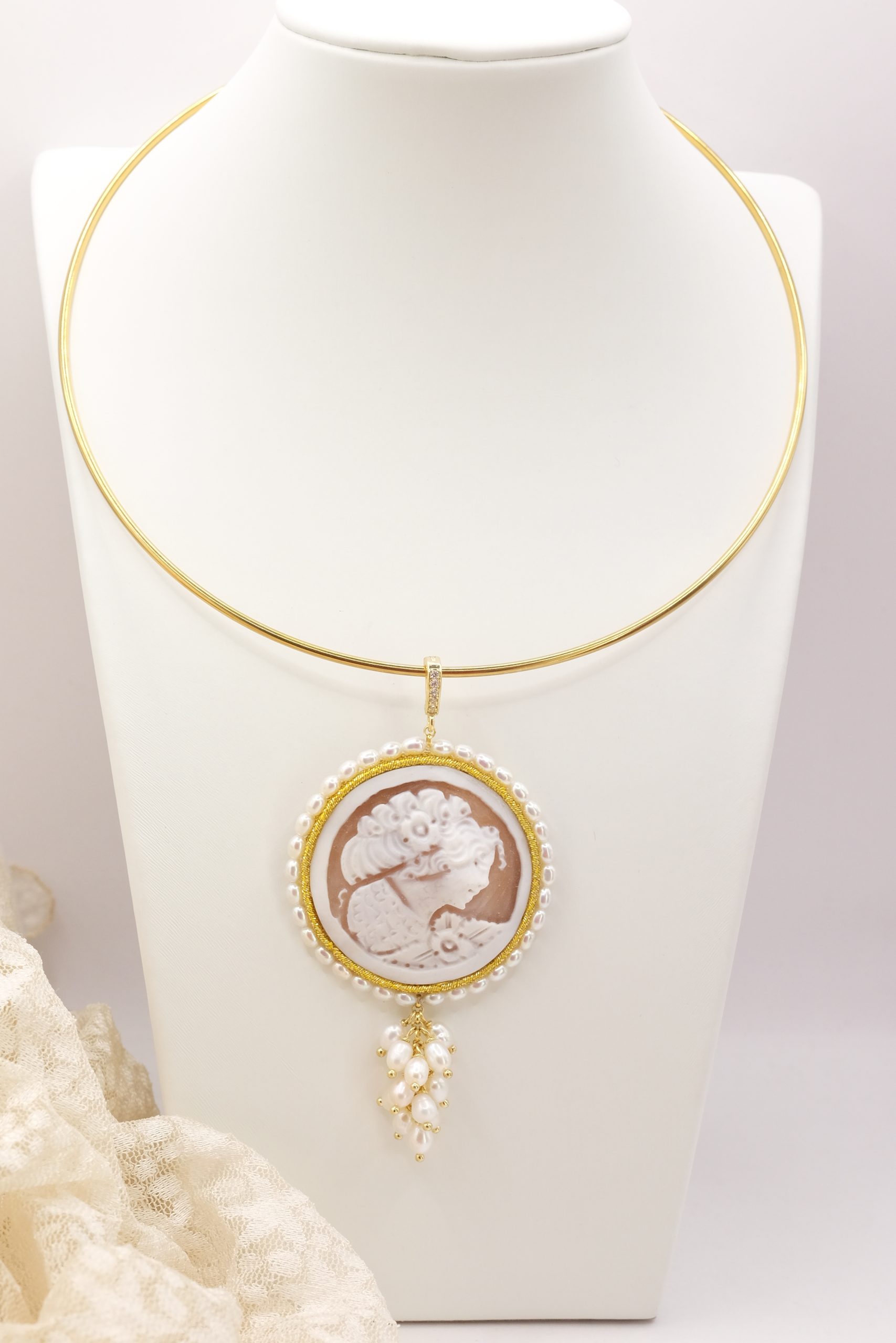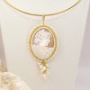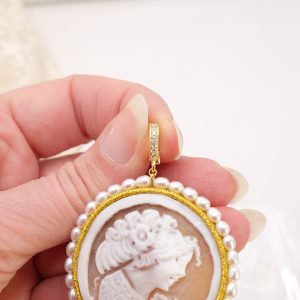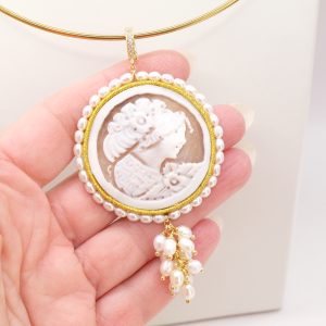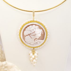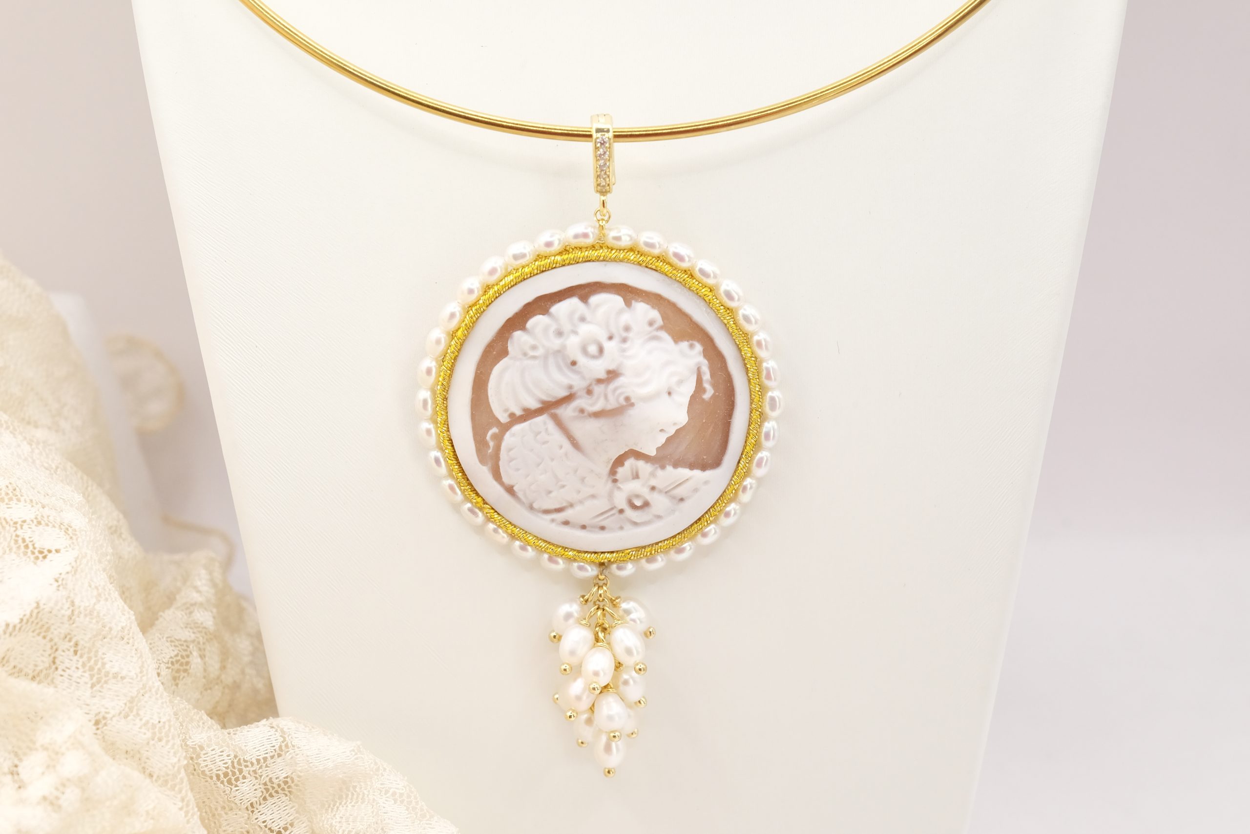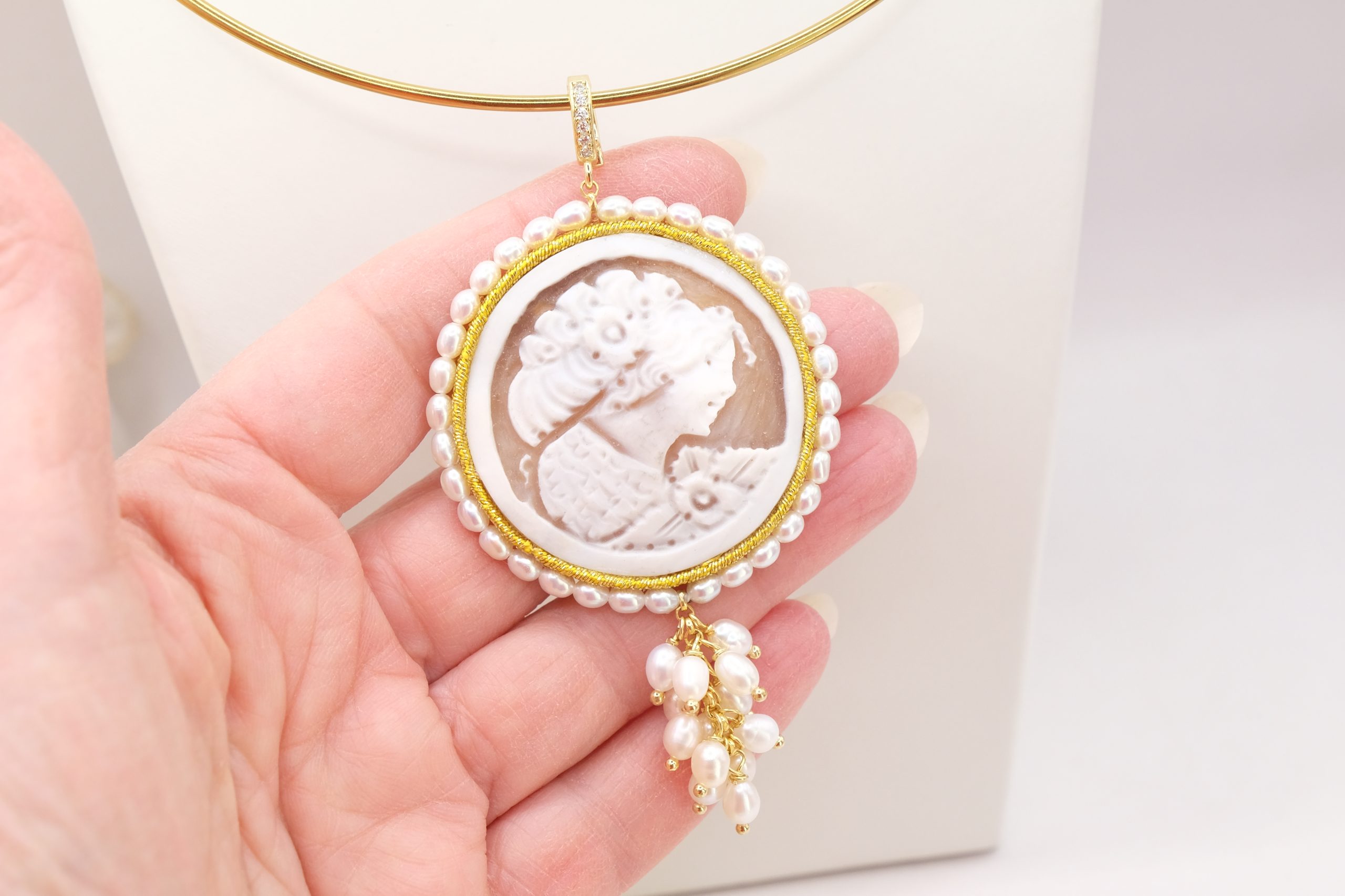 Pendant with cameo hand-engraved by the master engravers of Torre del Greco, with sauté workmanship, natural pearls and trimmings, with a lady's face, 5 cm