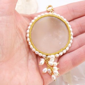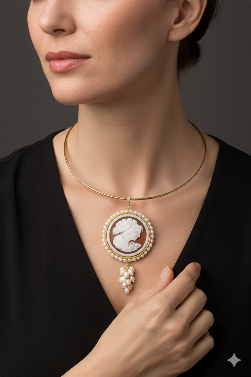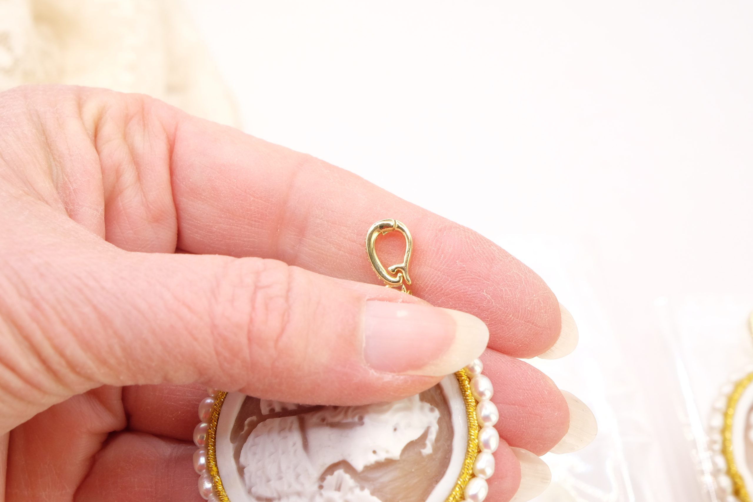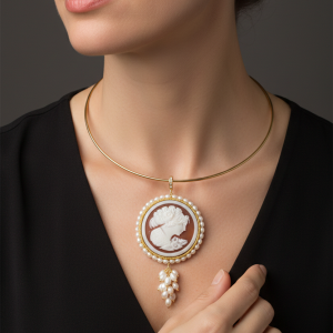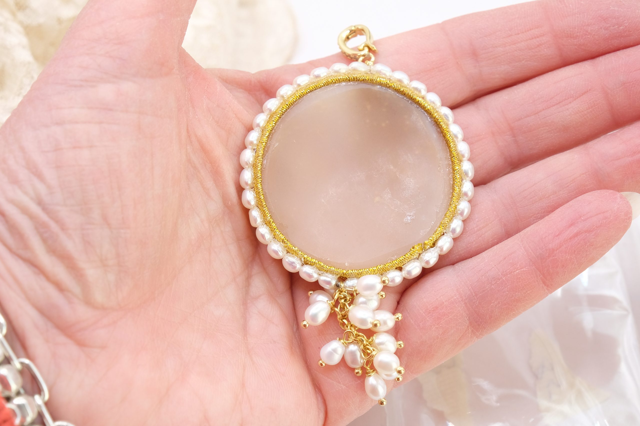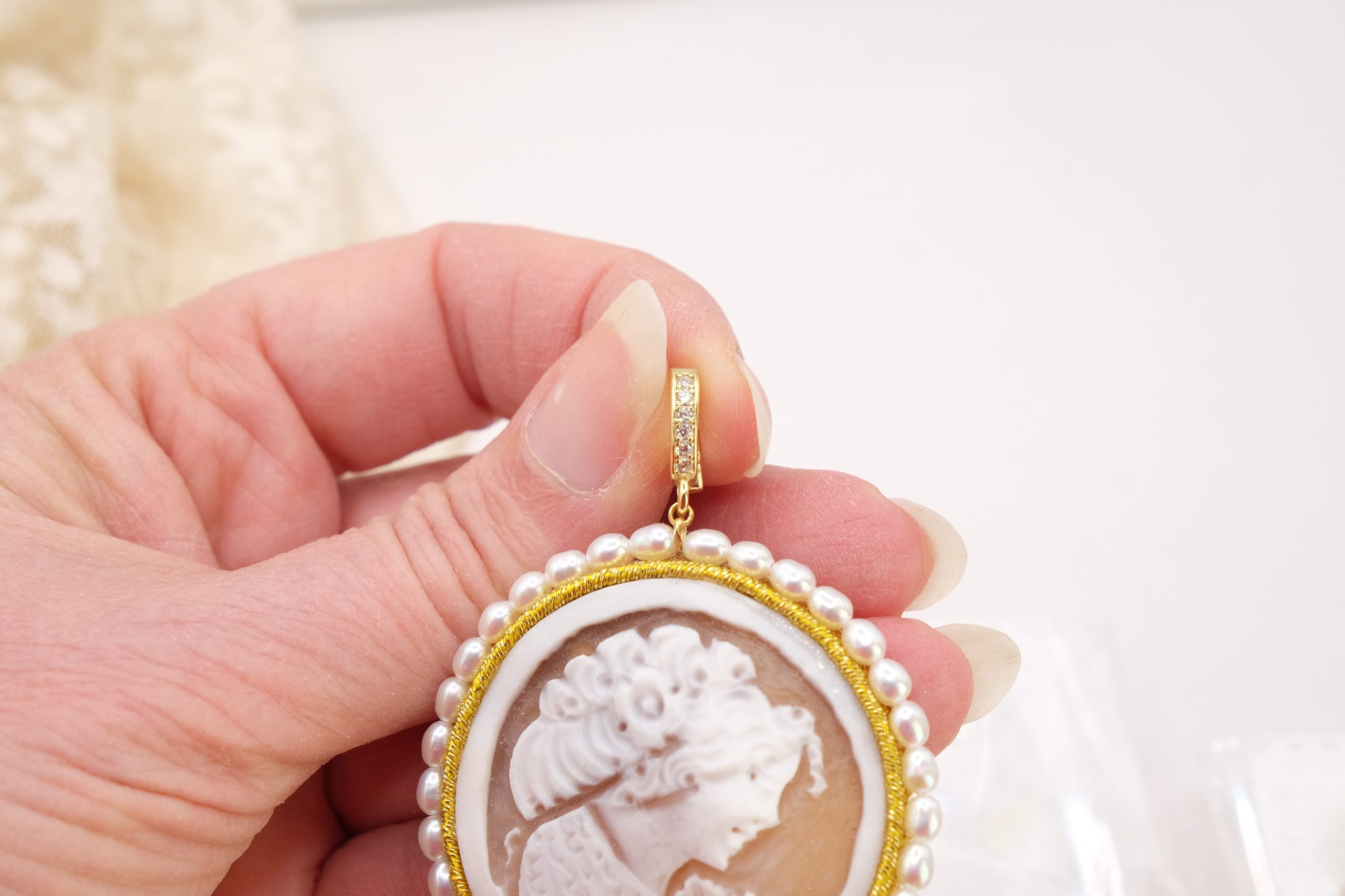 Pendant with cameo hand-engraved by the master engravers of Torre del Greco, with sauté workmanship, natural pearls and trimmings, with a lady's face, 5 cm