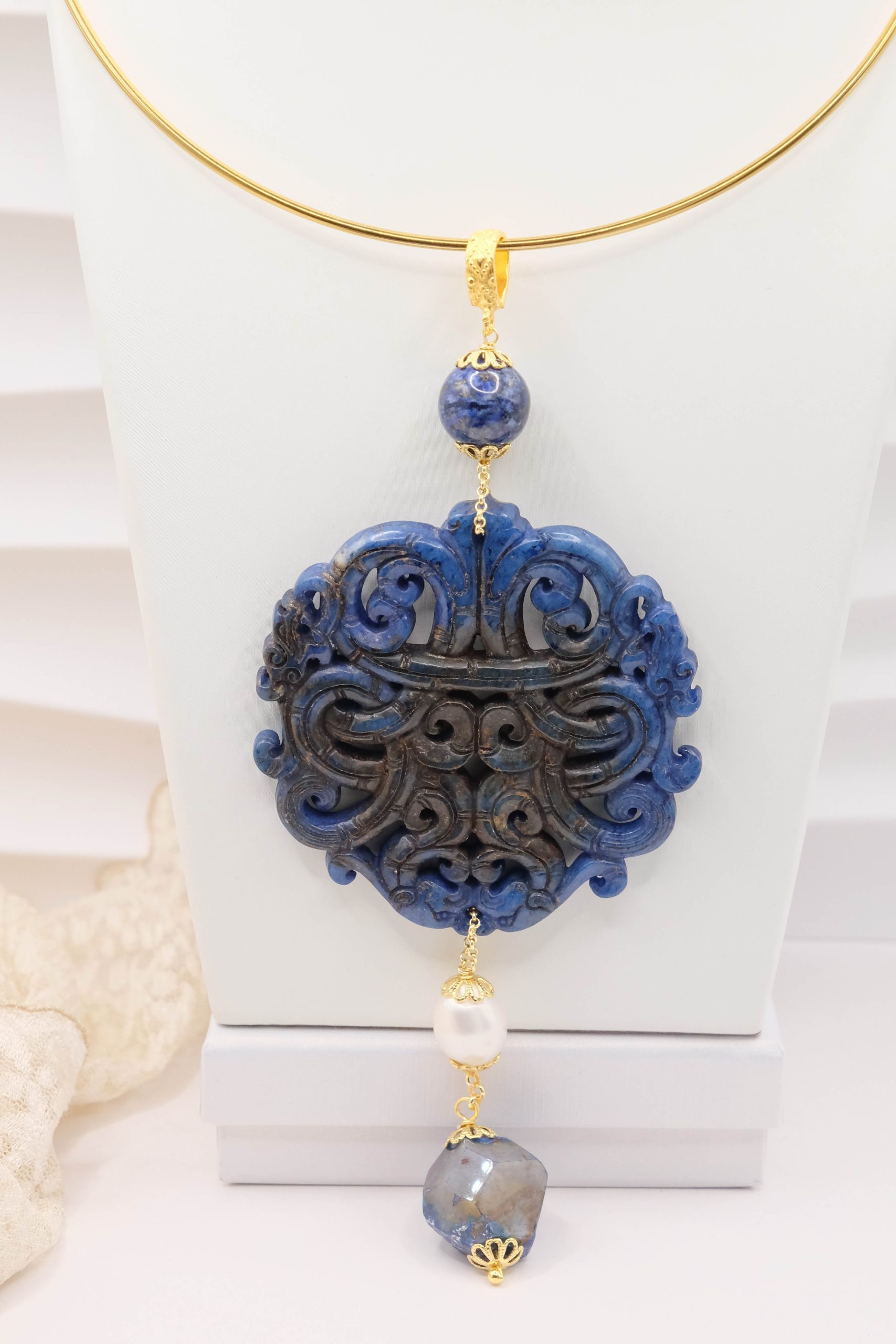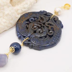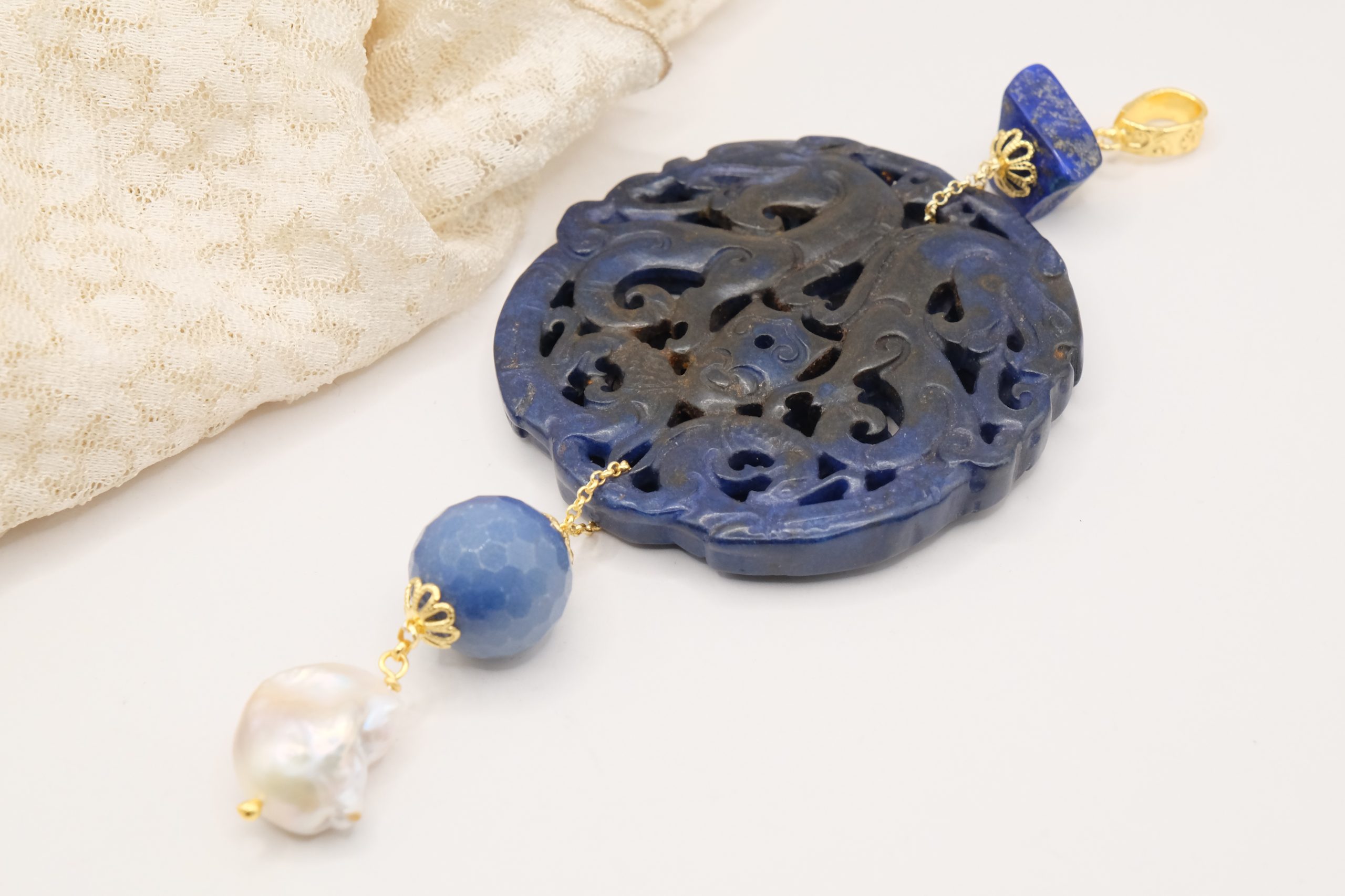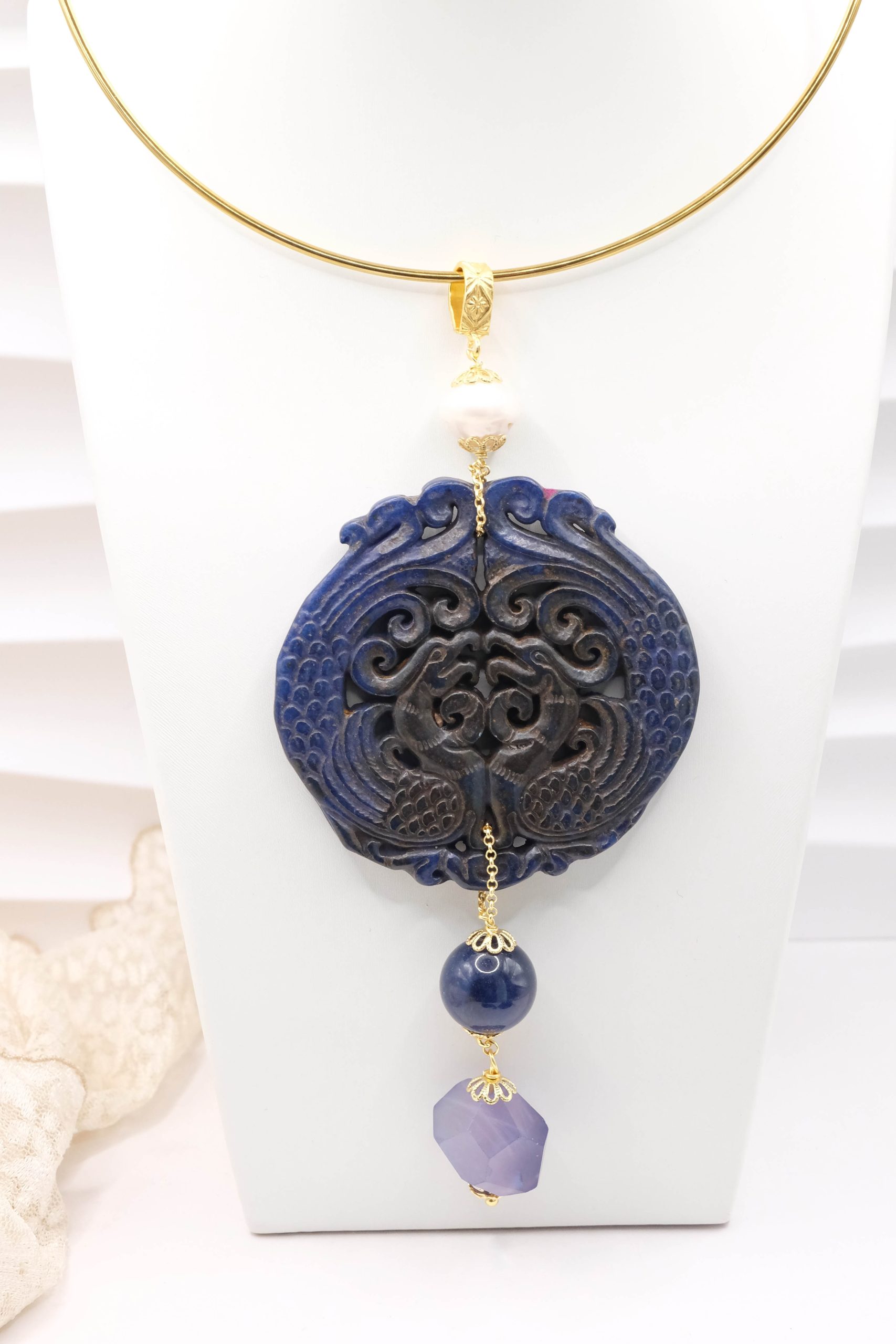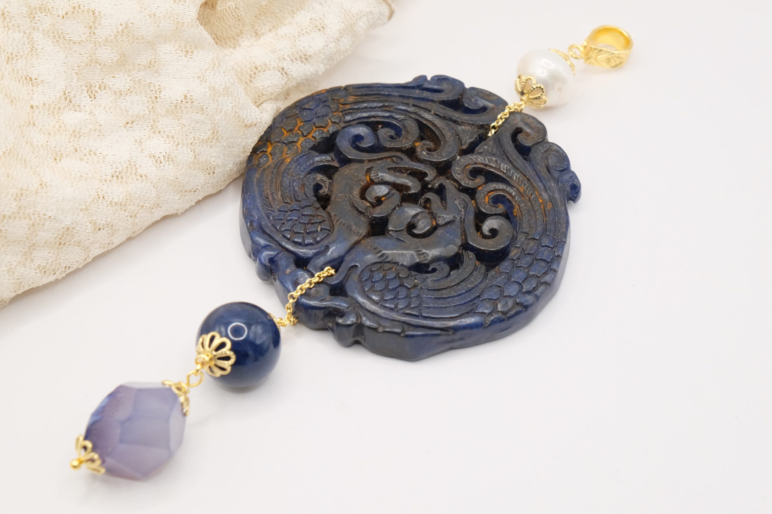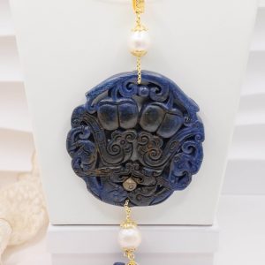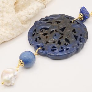Pendant featuring a Good Luck Mandala in refined and rare shades of black and blue, crafted from genuine, high-quality hand-inlaid jade and carefully selected natural stones. Each variant combines lapis lazuli, pearls, and other gemstones to create a piece rich in personality and meaning, perfect for enhancing everyday looks or special occasions.