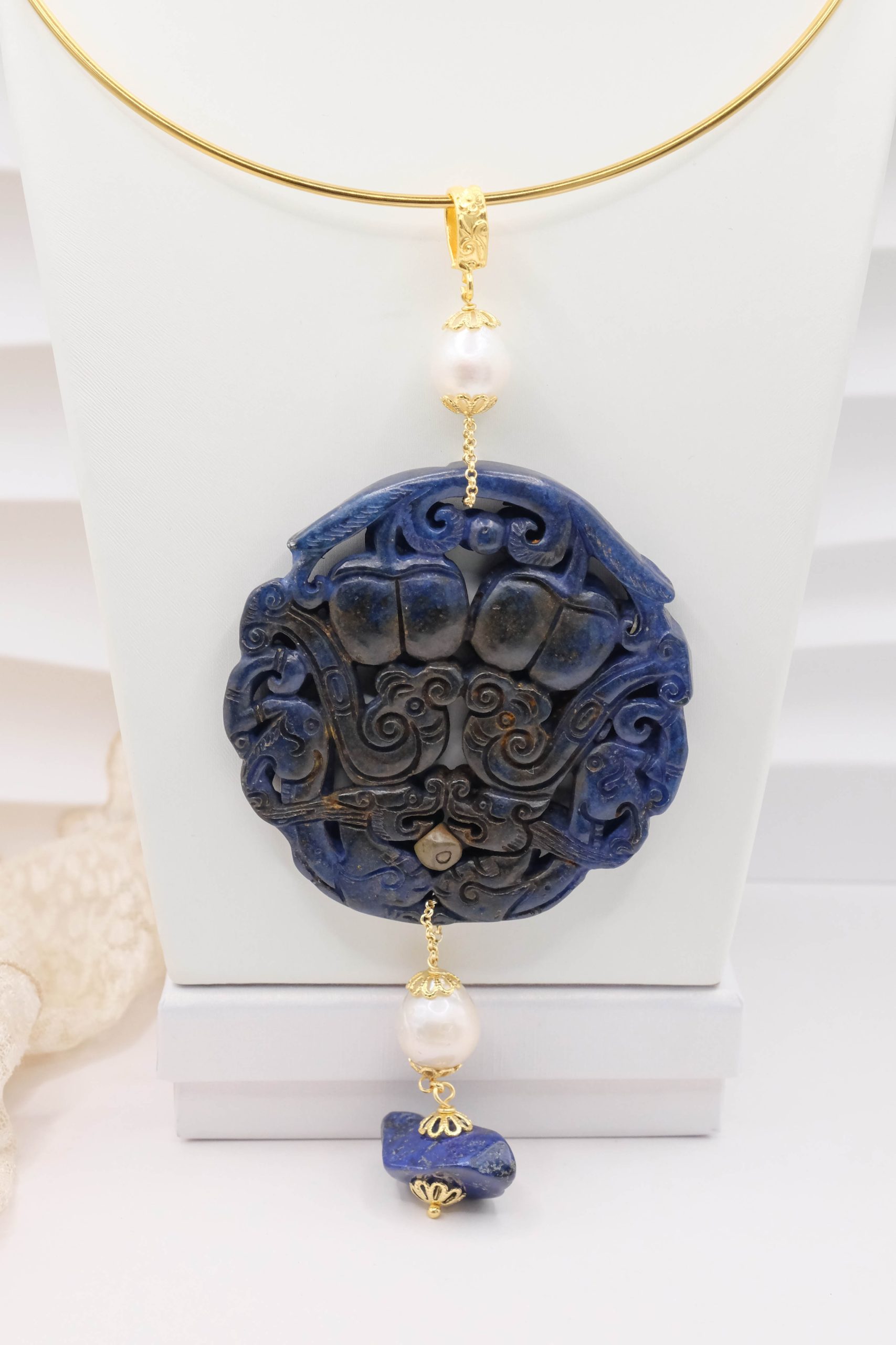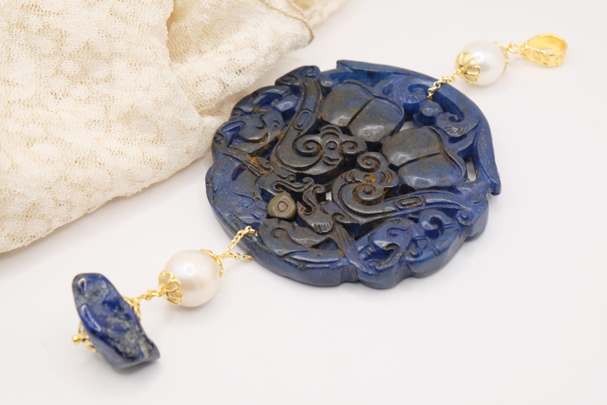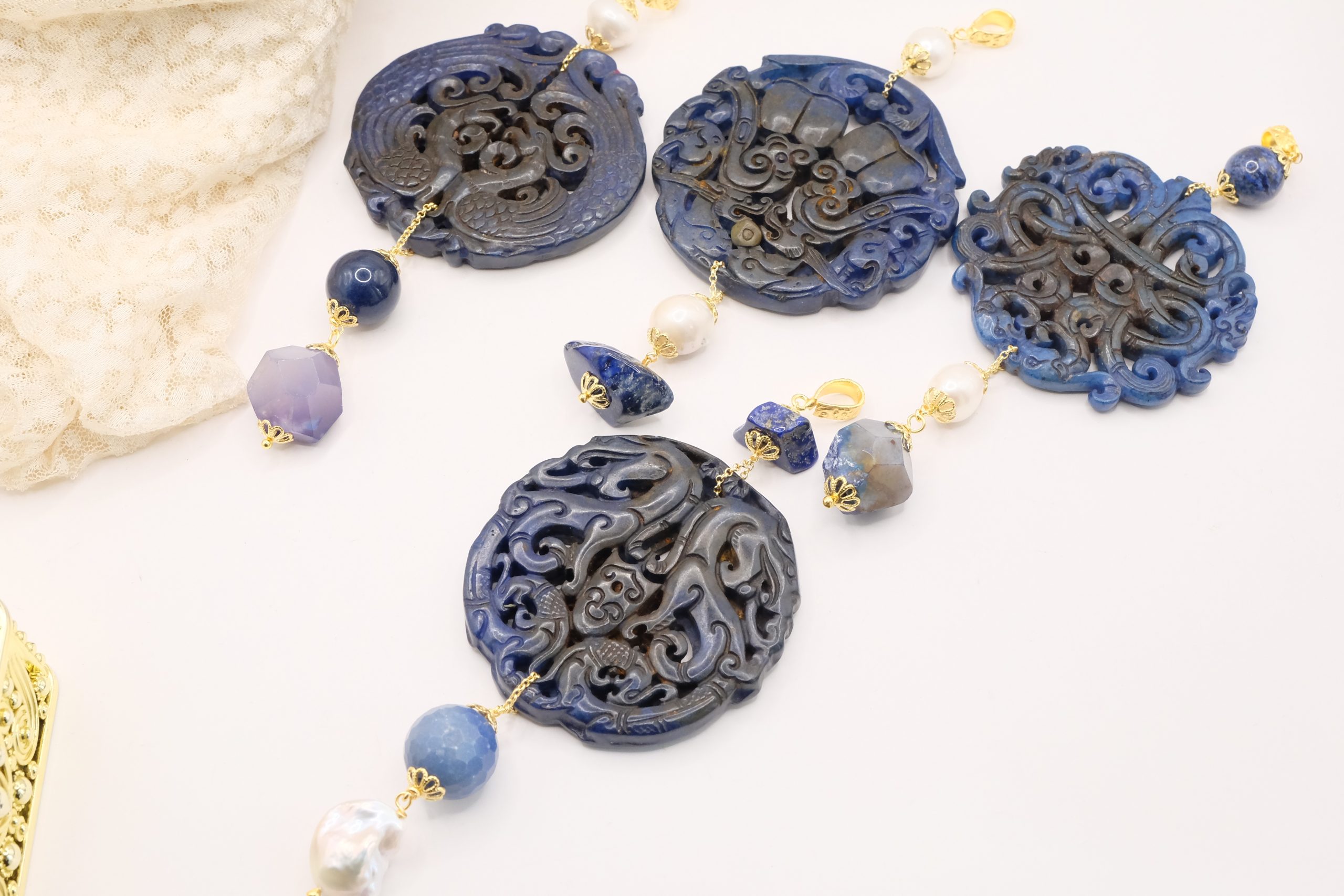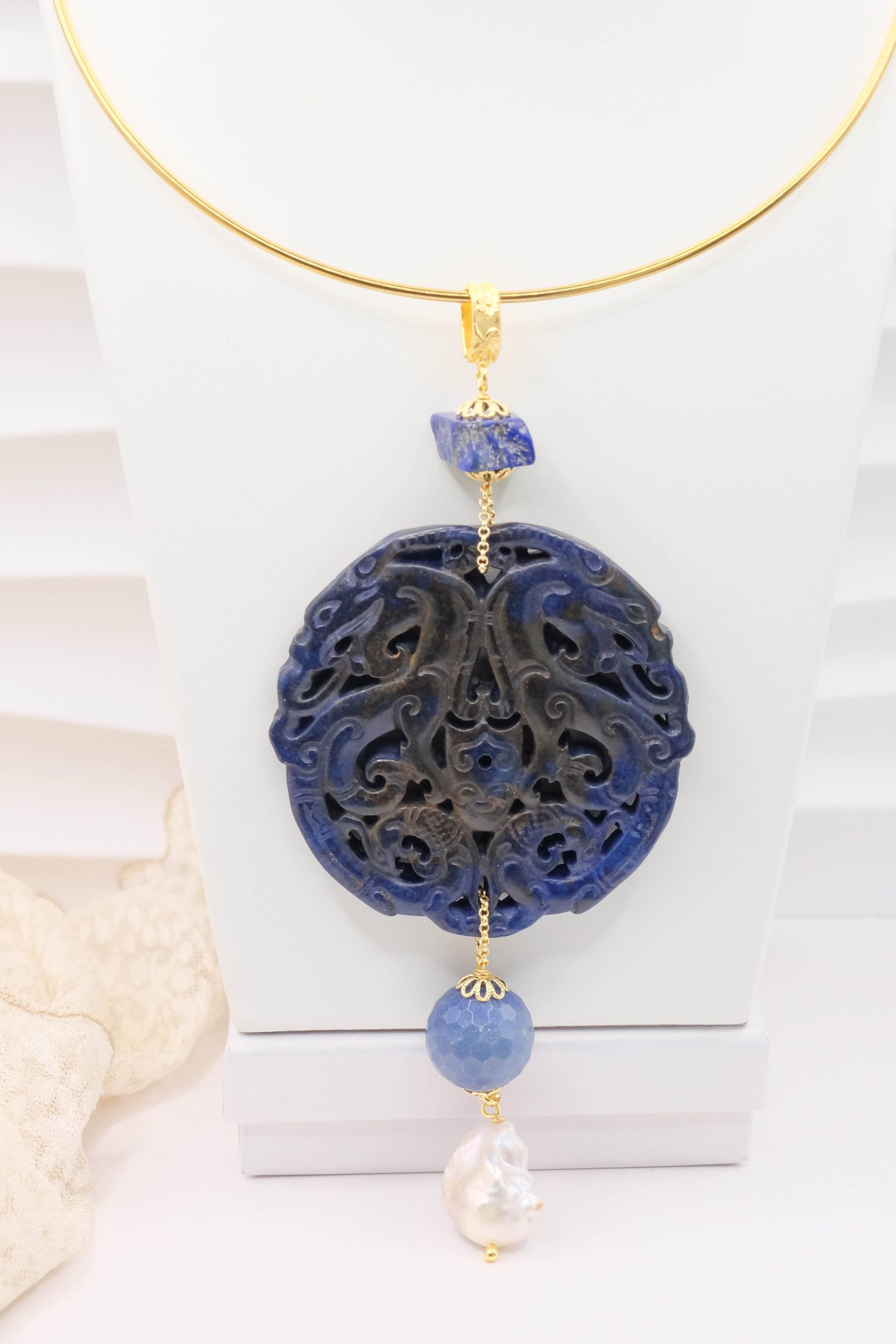 Pendant featuring a Good Luck Mandala in refined and rare shades of black and blue, crafted from genuine, high-quality hand-inlaid jade and carefully selected natural stones. Each variant combines lapis lazuli, pearls, and other gemstones to create a piece rich in personality and meaning, perfect for enhancing everyday looks or special occasions.