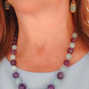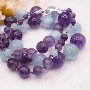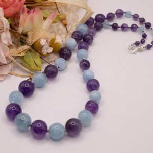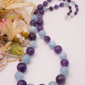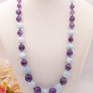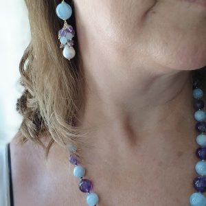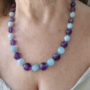Elegant and precious necklace of natural aquamarine and top quality amethyst. The necklace has silver hematite light points, for a delicate and refined sparkle.