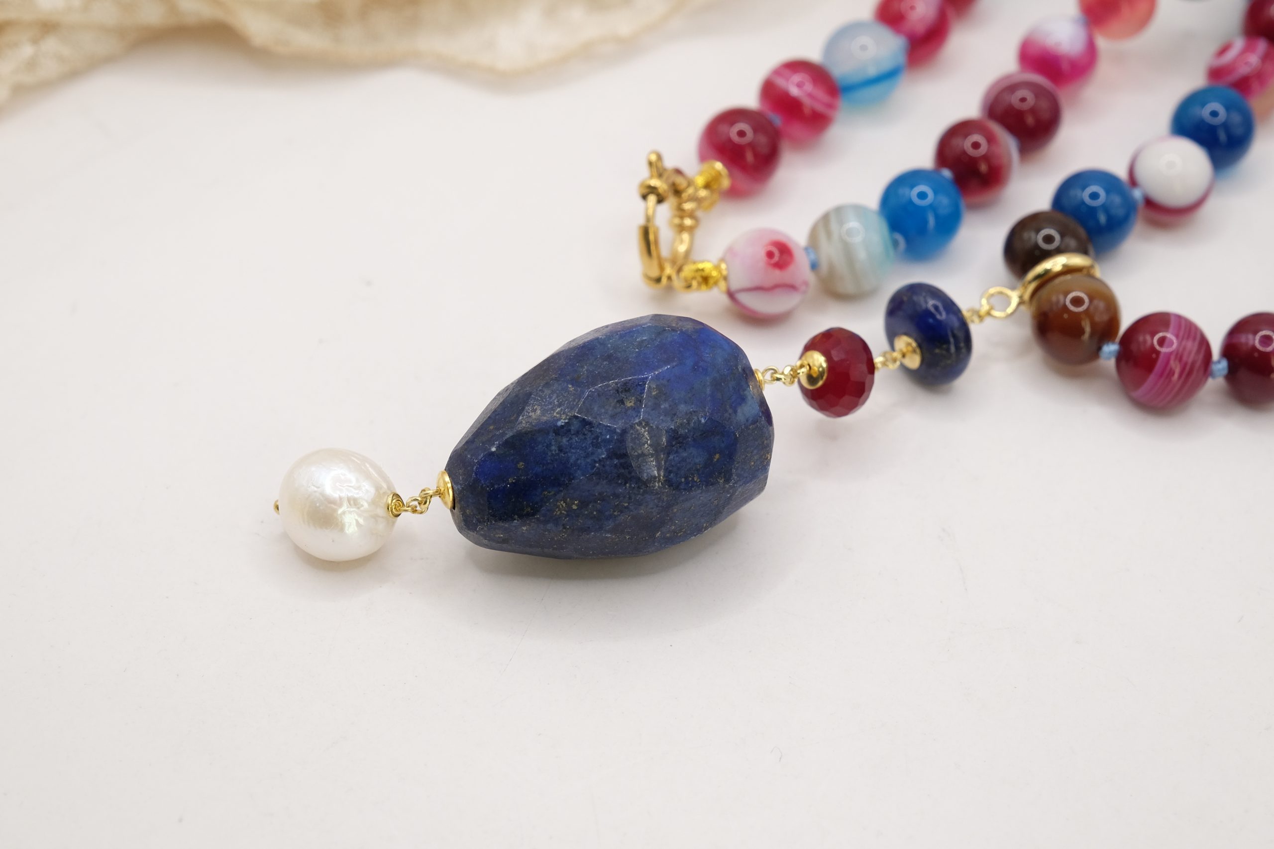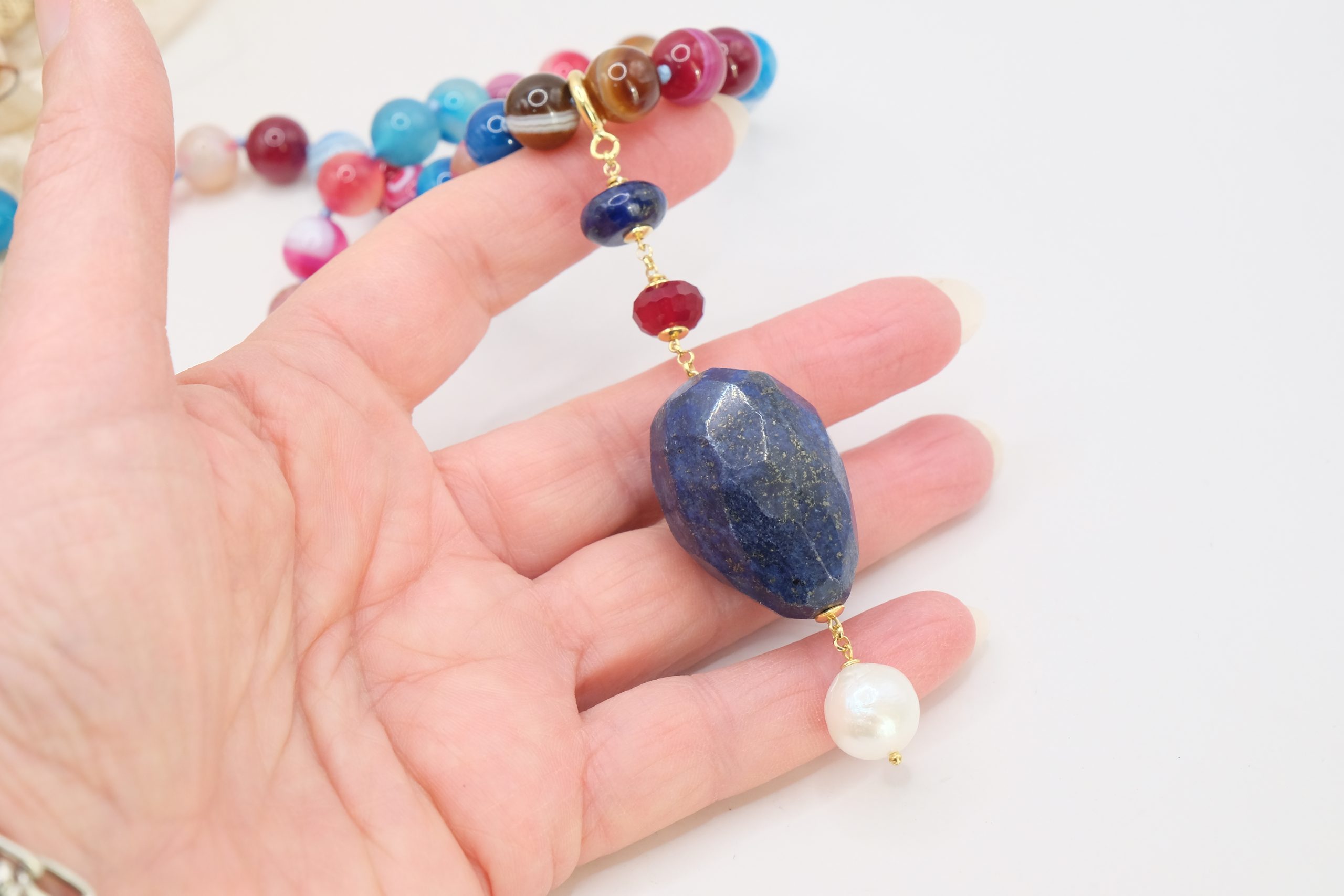 Luxurious yet sporty 10mm faceted multicolor agate necklace with a detachable pendant featuring a large faceted lapis lazuli stone, natural pearl, and burgundy jade.