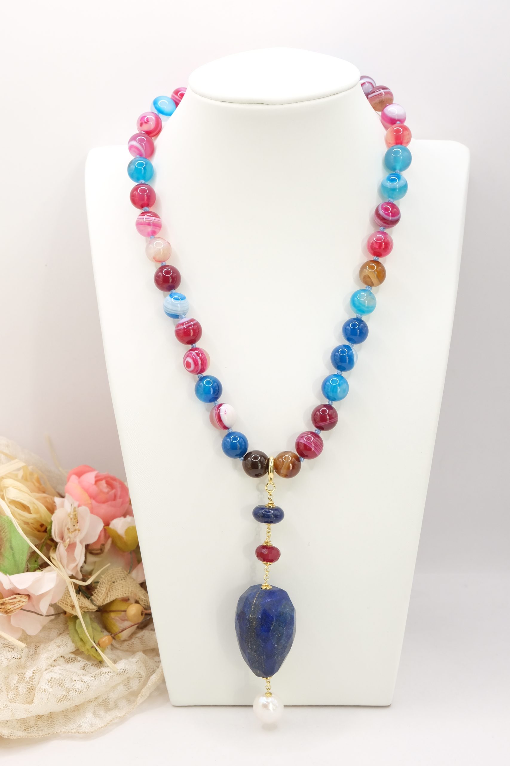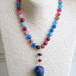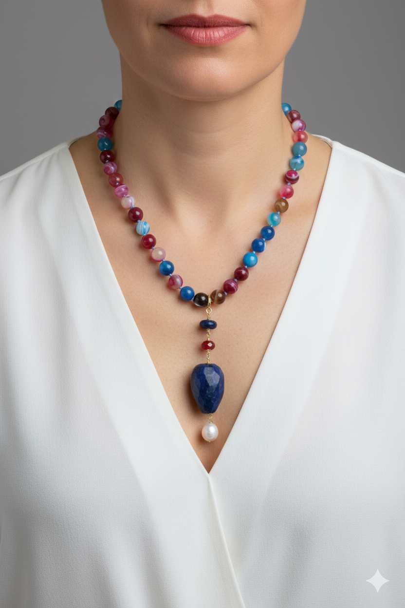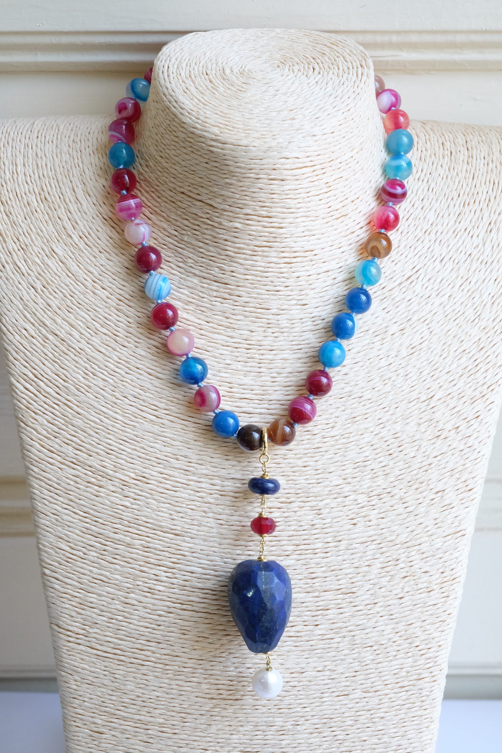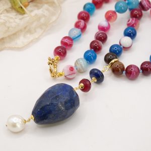 Multicolored Agate Necklace Lapis Pendant Natural Pearl Burgundy Silver