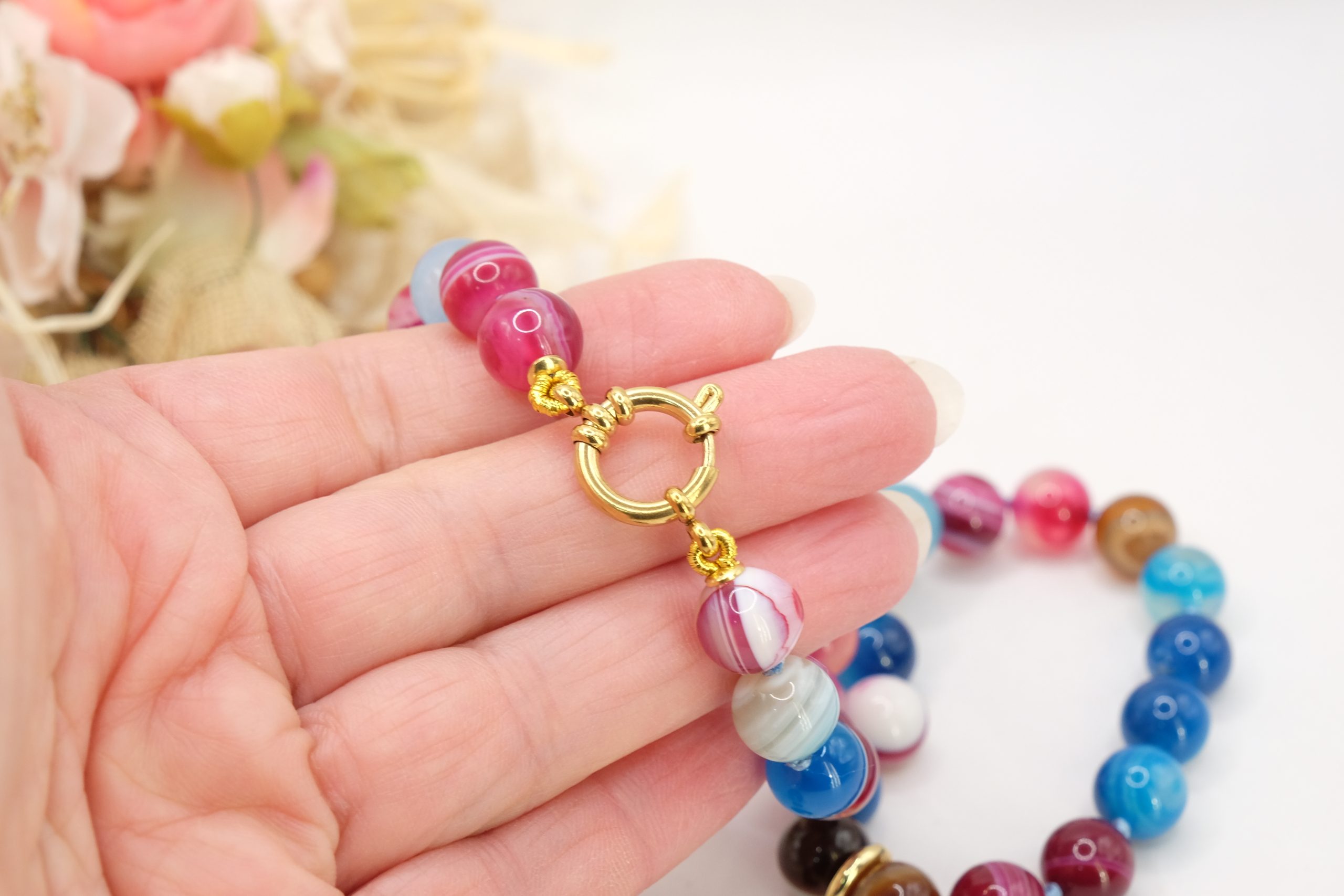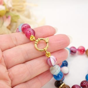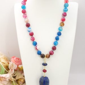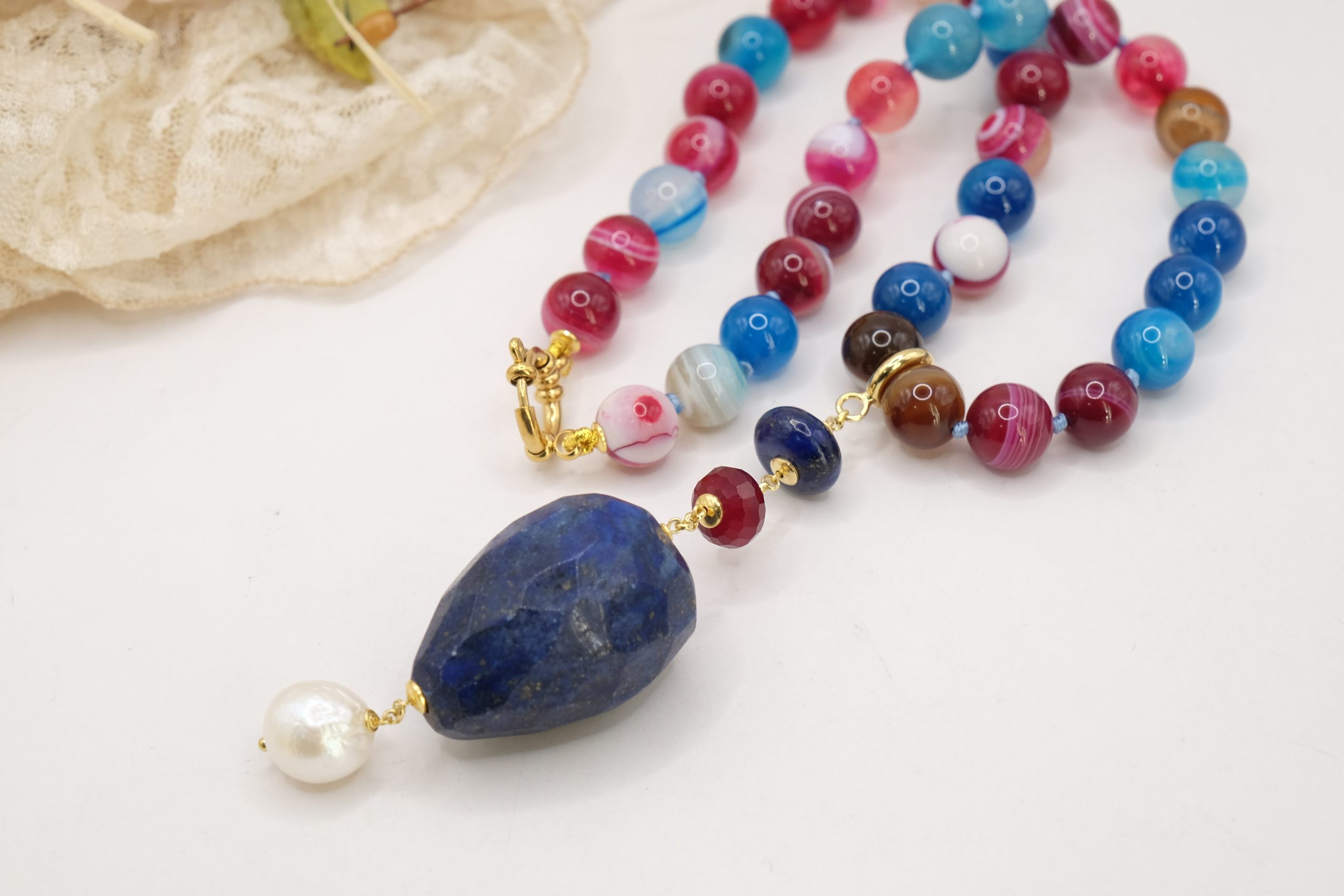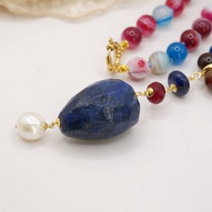 Material: Multicolored variegated agate, Lapis, Burgundy jade, pearl, 925 gold-plated silver, steel