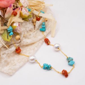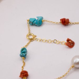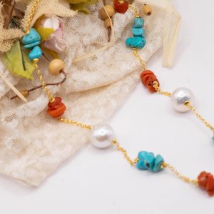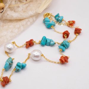 Elegant, refined and luminous necklace in yellow gold-plated 925 silver with natural raw coral and turquoise pearls