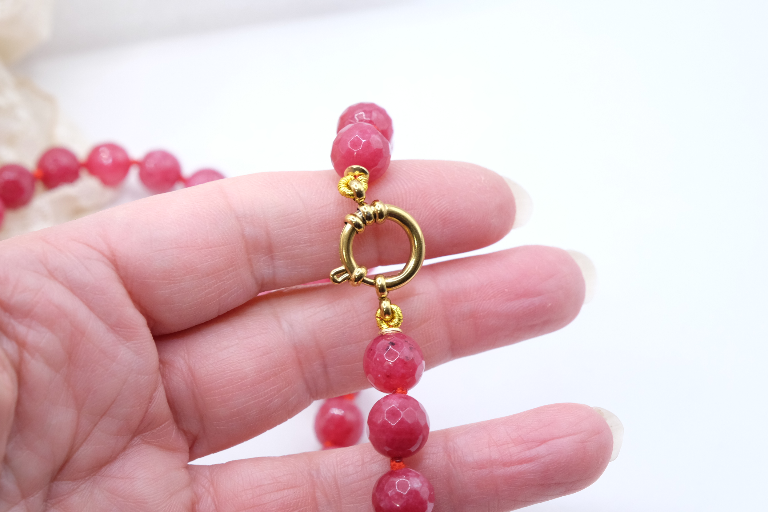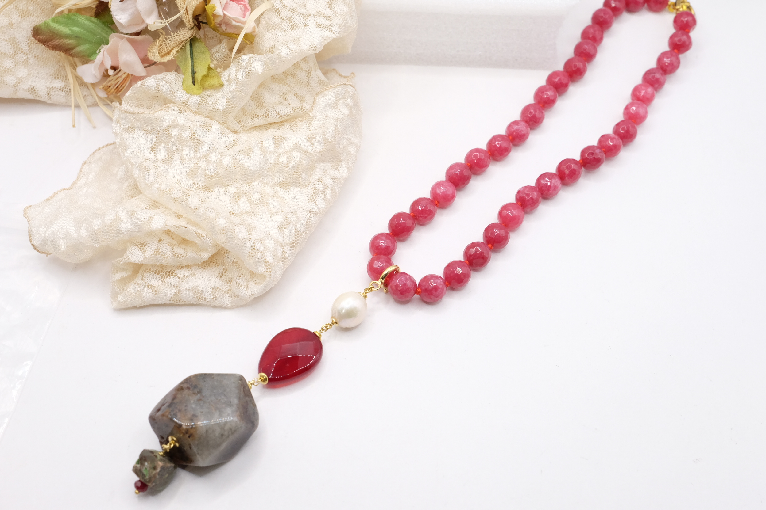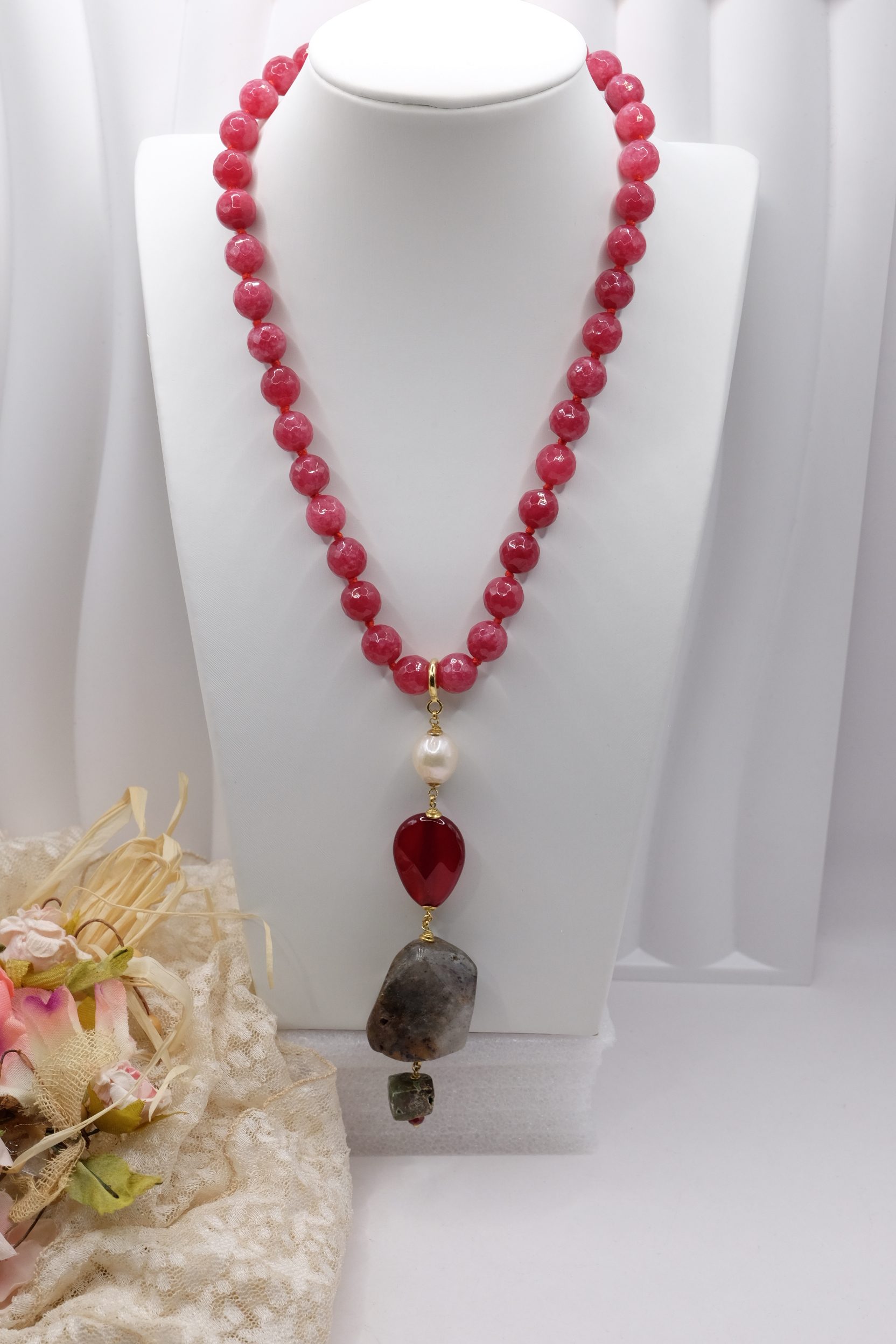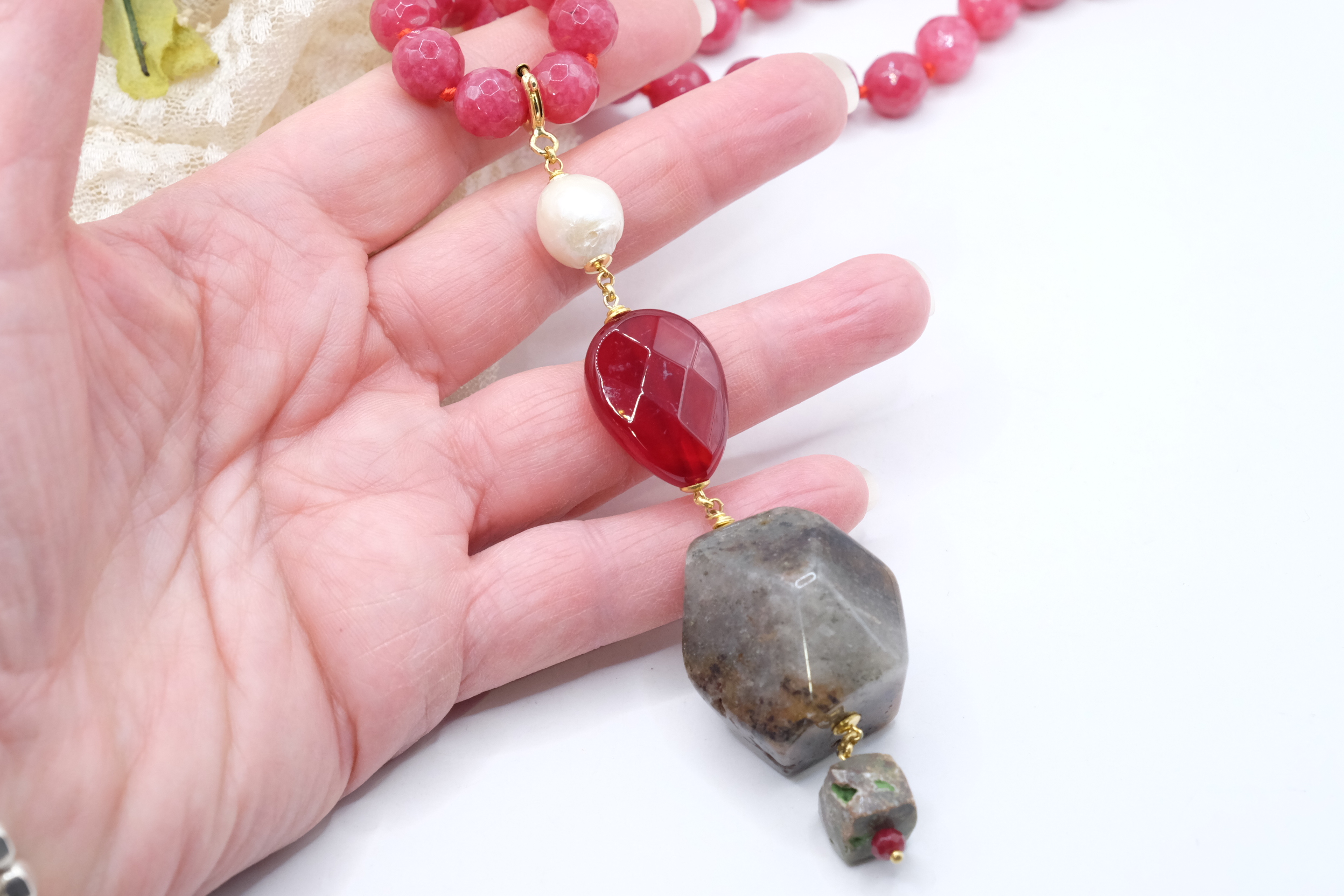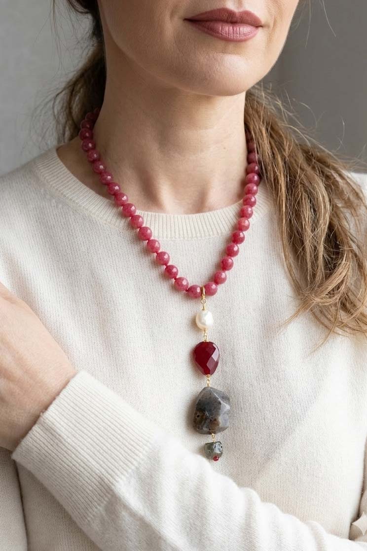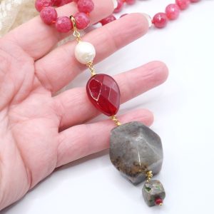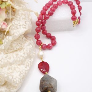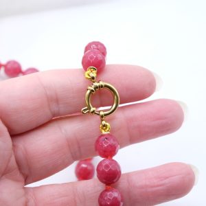 Collana versatile in Giada borgogna sfaccettata da 10 mm con pendente staccabile in avventurina, giada borgogna e perla naturale con moschettone in argento 925 placcato oro
