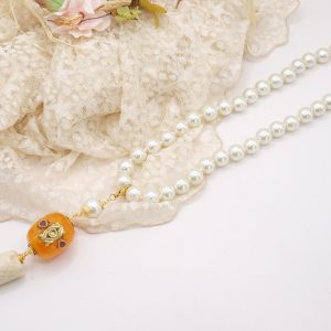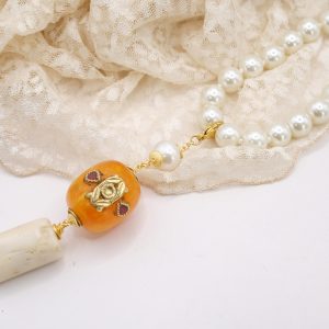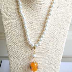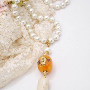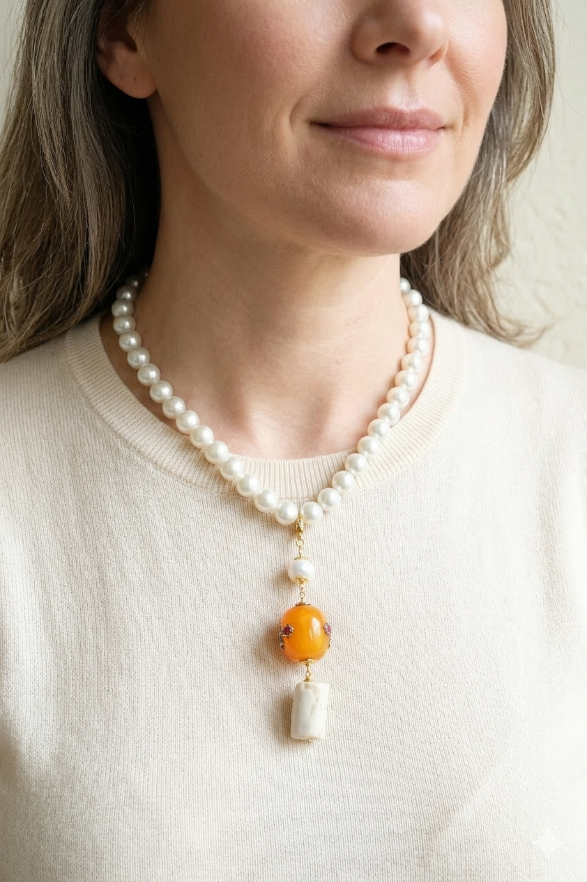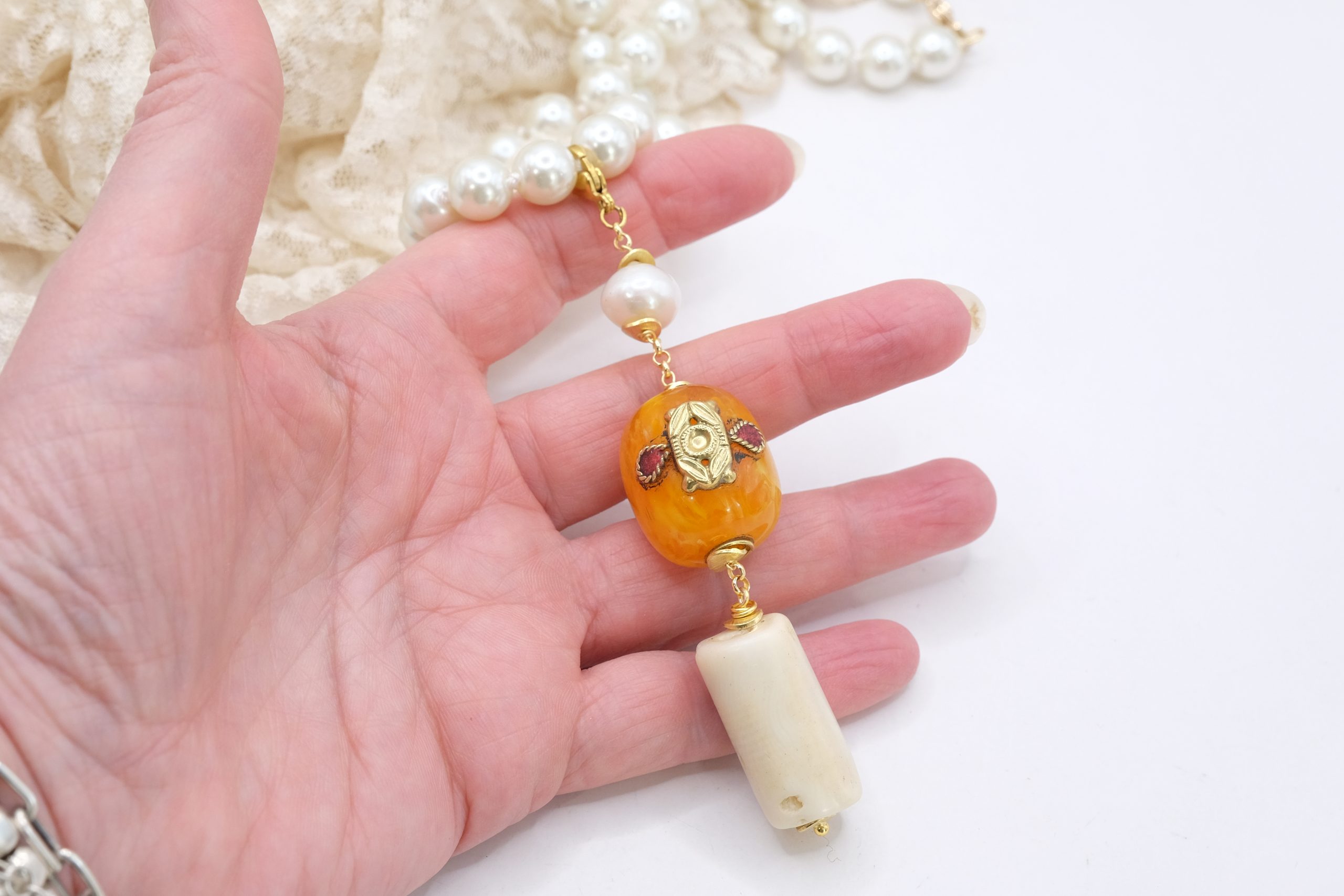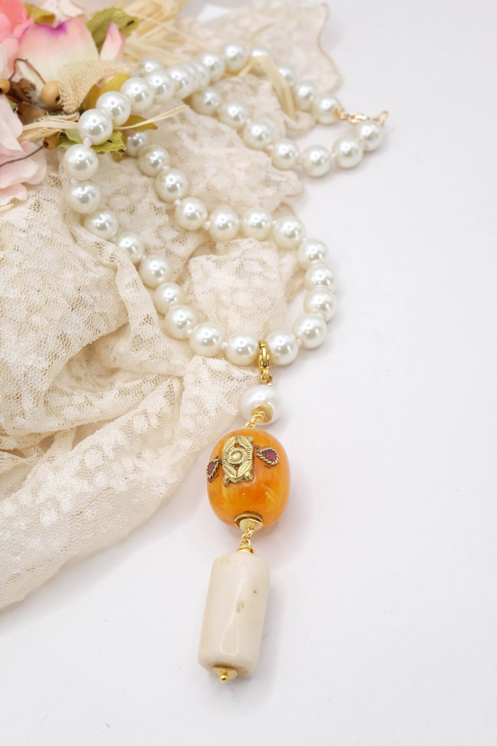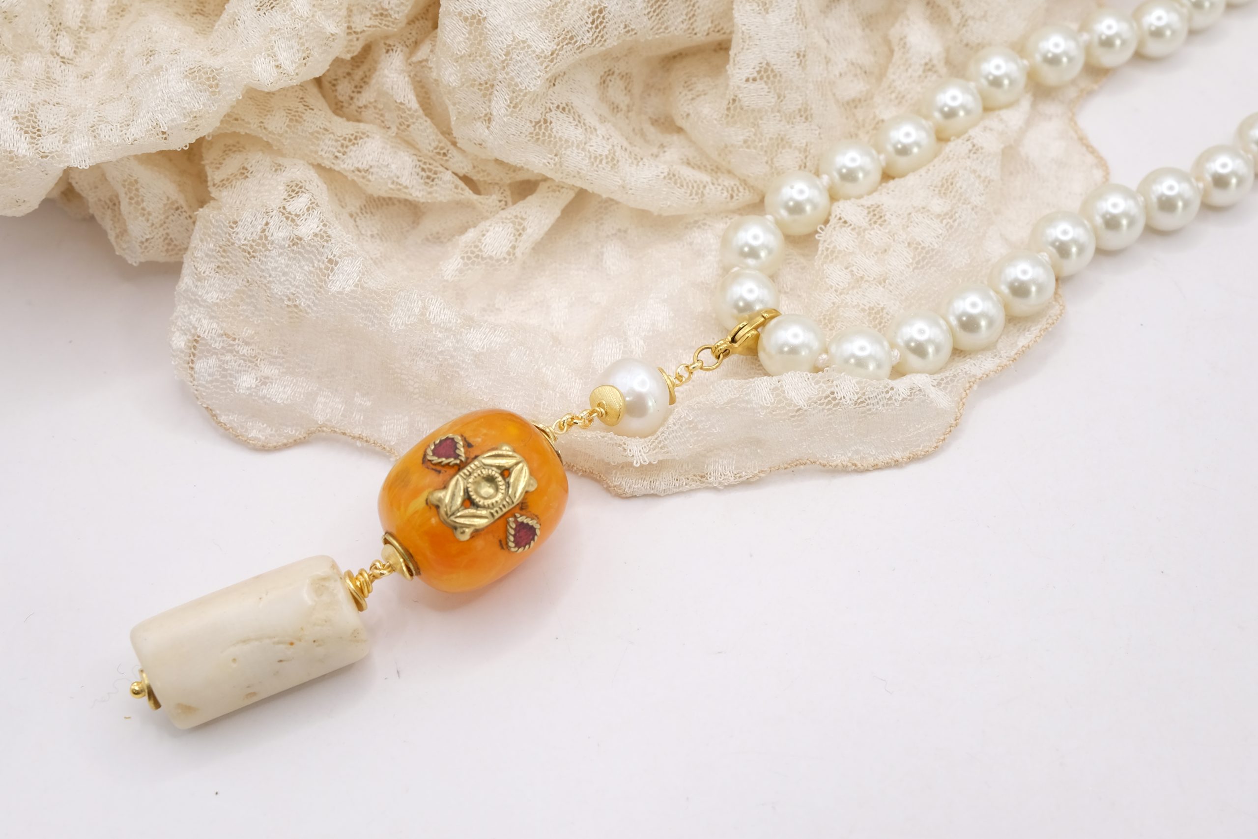 Versatile 10mm Majorcan pearl necklace with detachable Nepalese resin pendant with natural pearl and white bamboo coral.