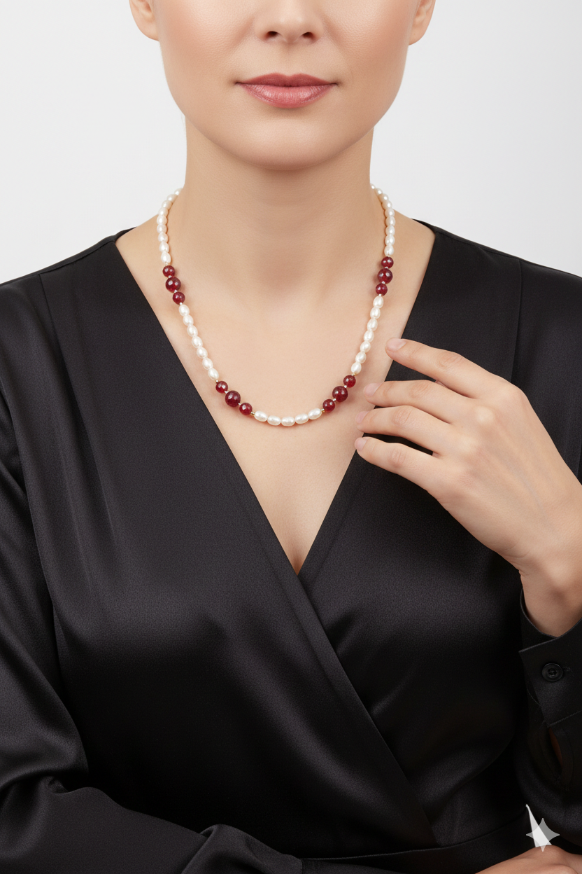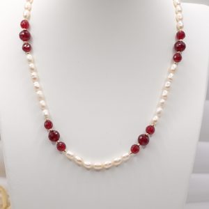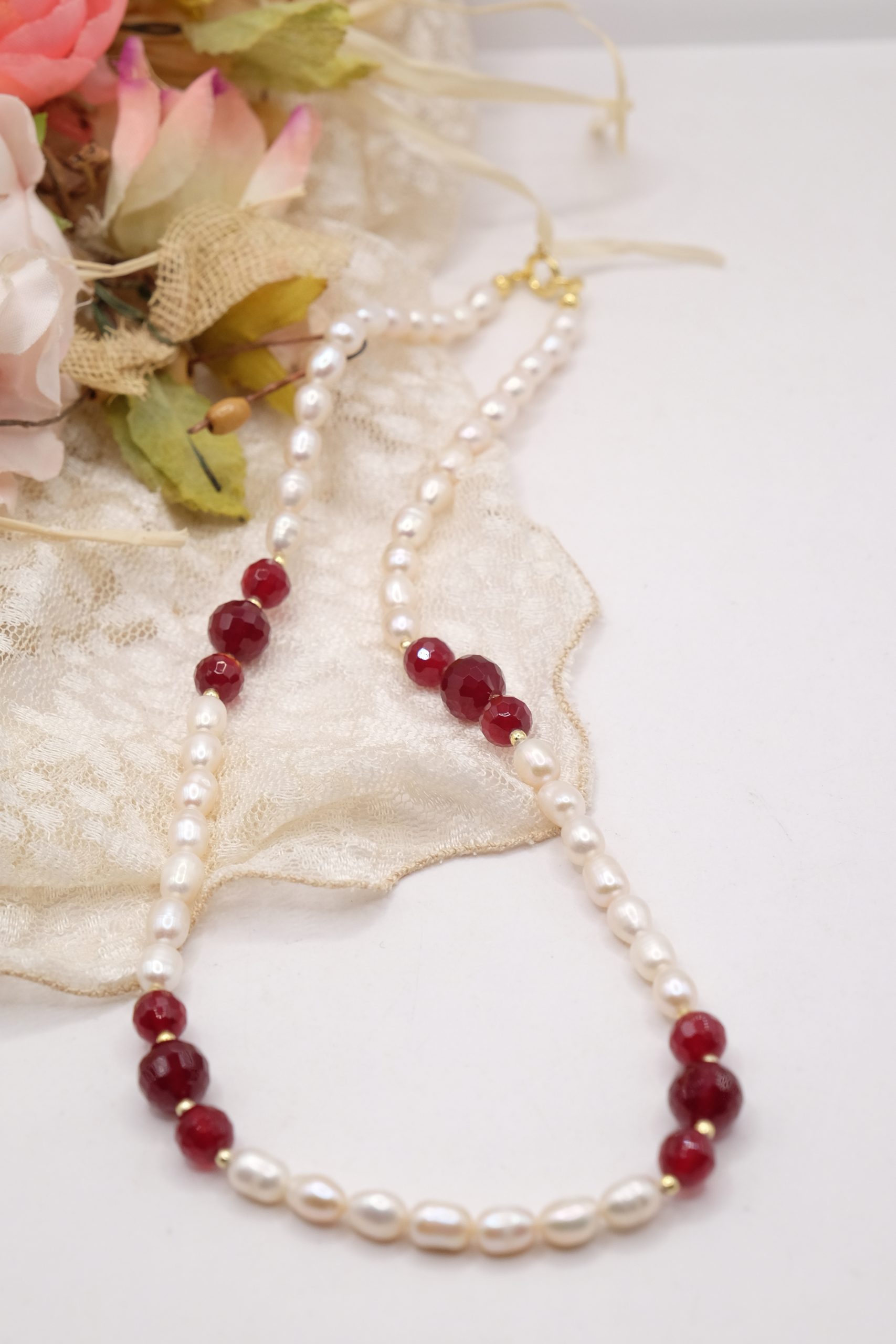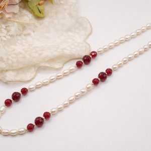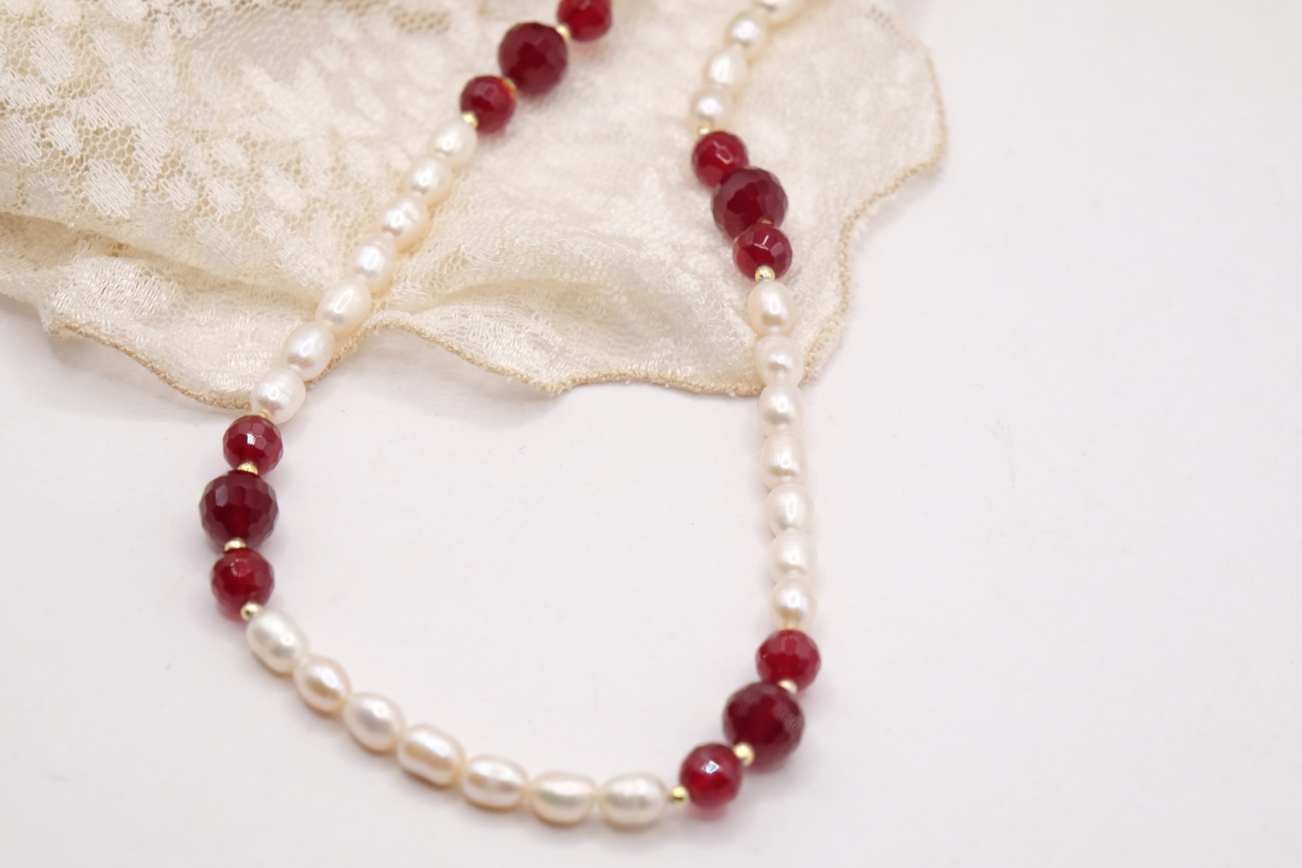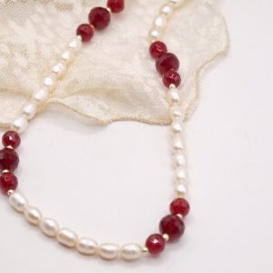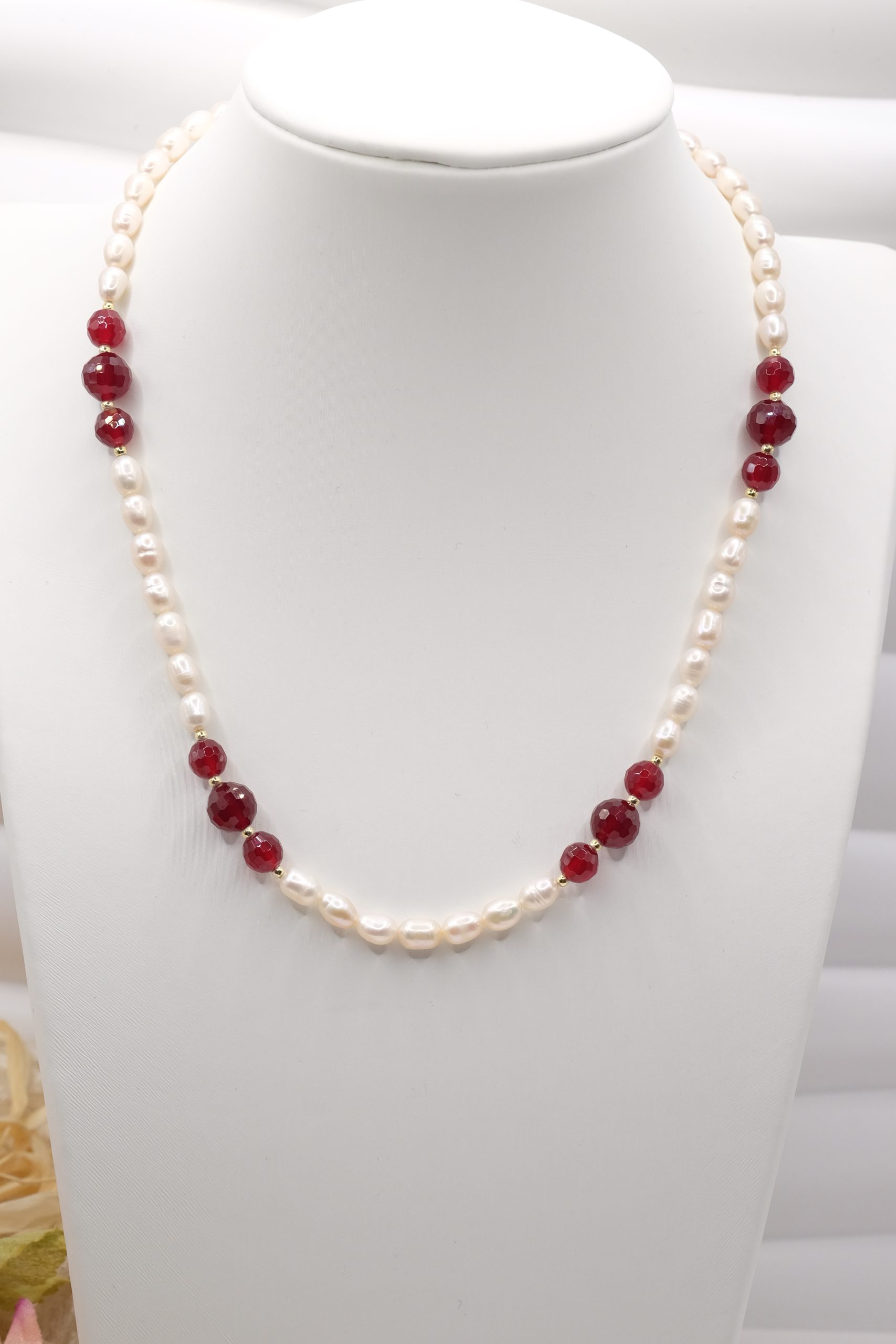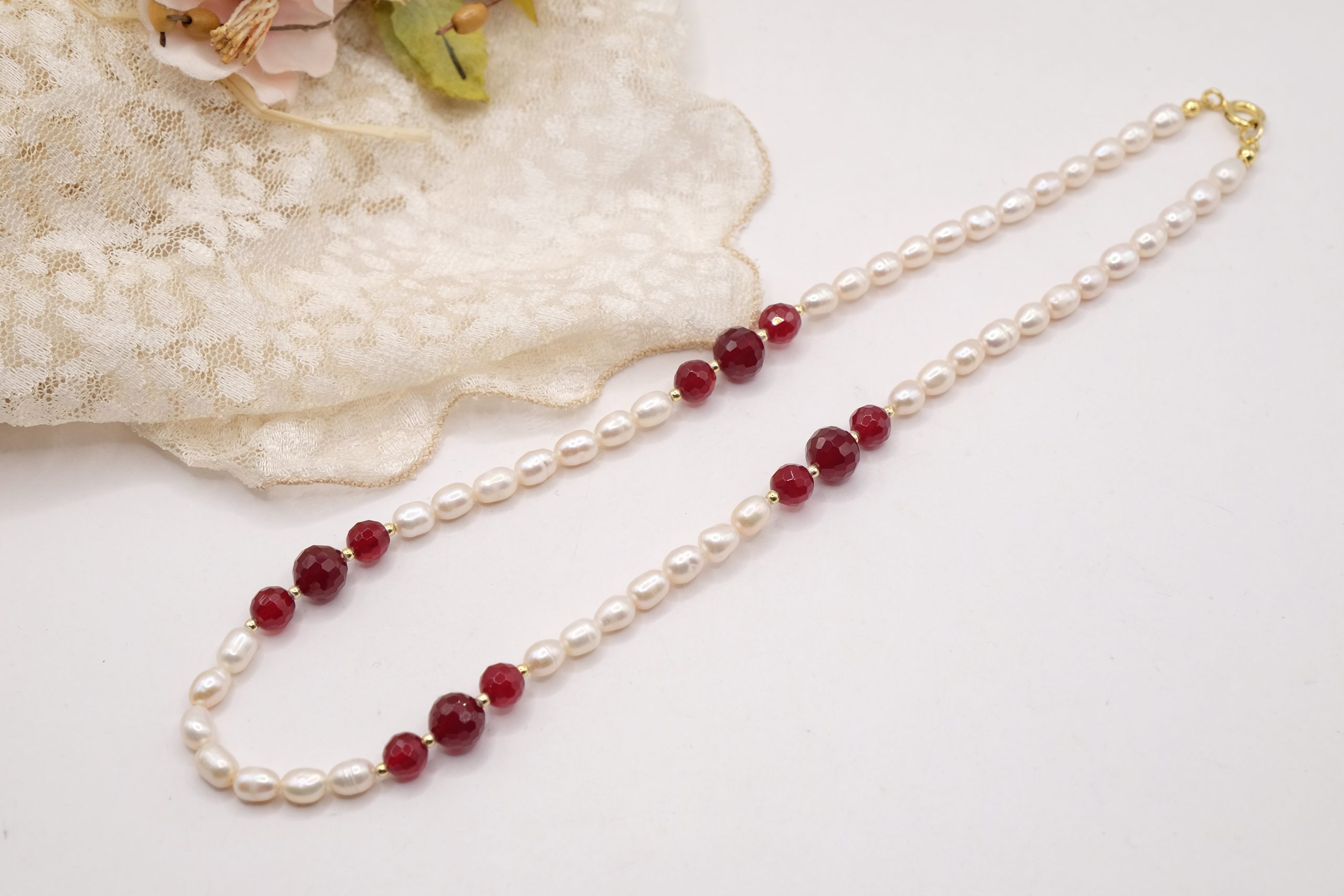 Handmade Necklace Rice Pearls Jade Burgundy Silver Gold