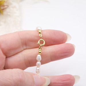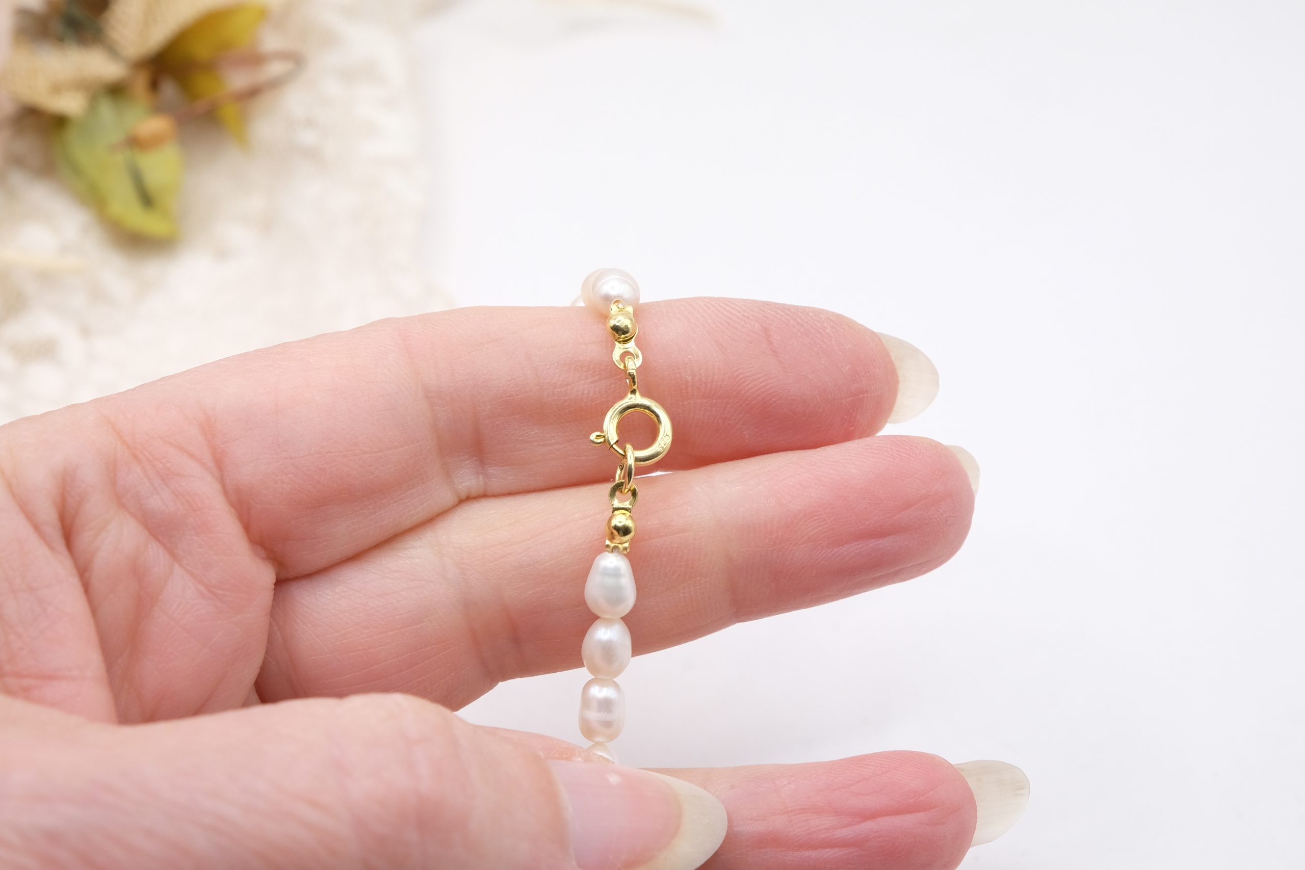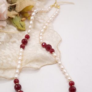 Refined and luminous minimal necklace, in 5 x 6 mm natural rice grain pearls, 8 and 6 mm burgundy jade and yellow gold plated 925 silver