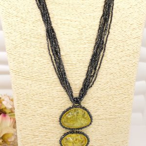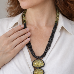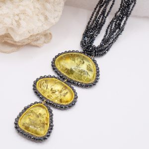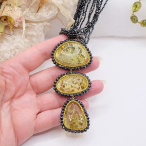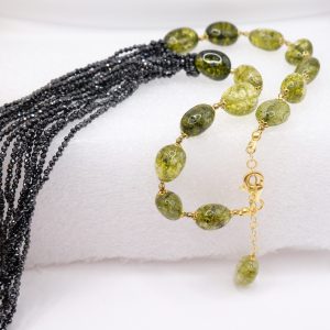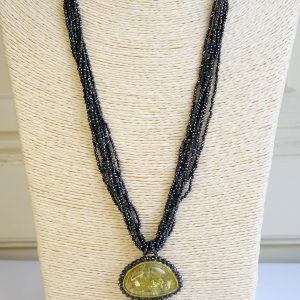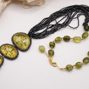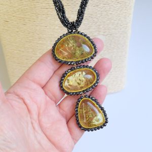 Sautache Handmade Necklace with Black Zircons, Green Amber, 925 Silver