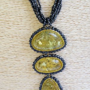 Multi-strand queen necklace (8 strands) with natural black zirconia as bright as black diamonds, stones and 3 large cabochons in Green Baltic amber worked with gold trimmings and black zirconia, with sautache workmanship, very refined