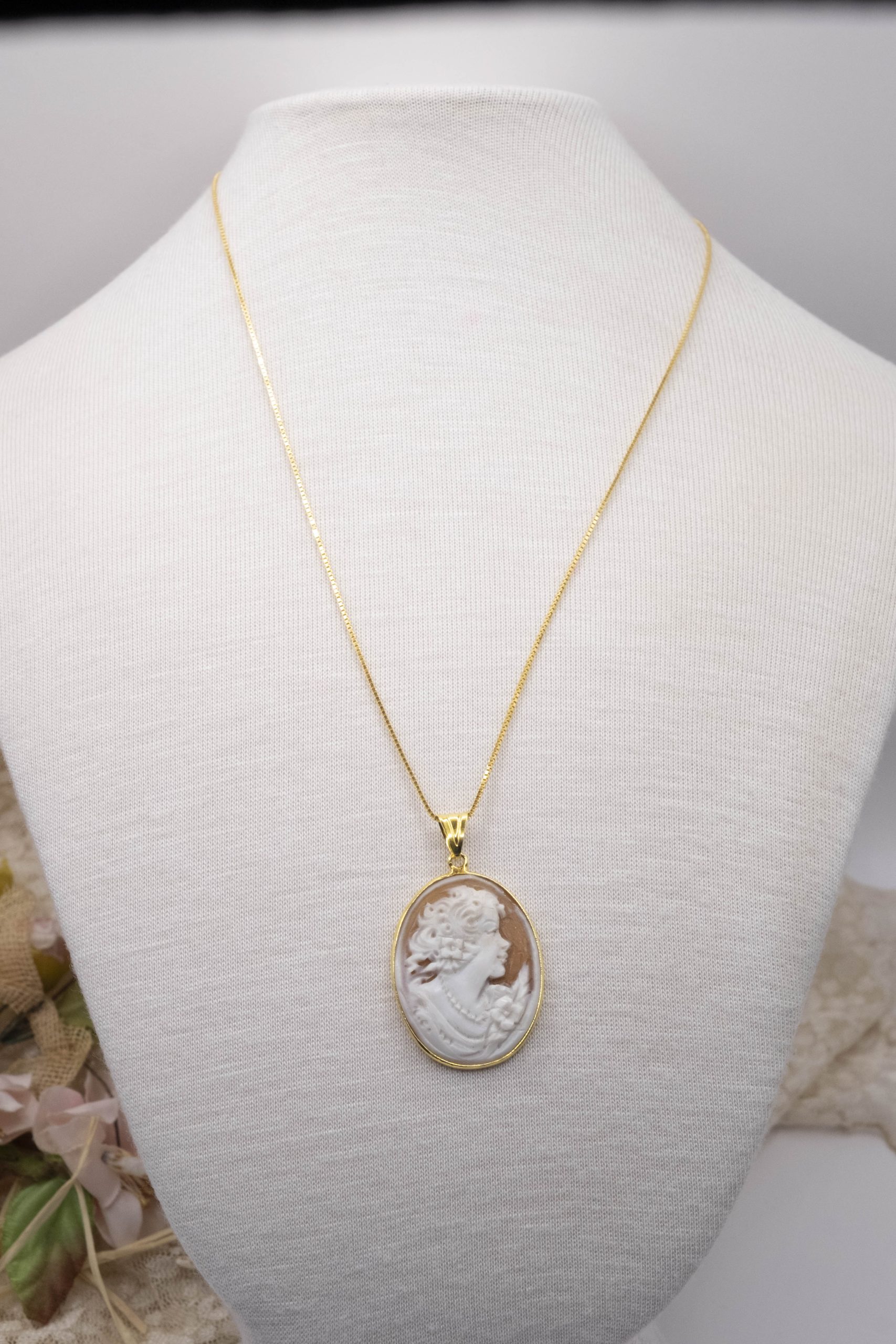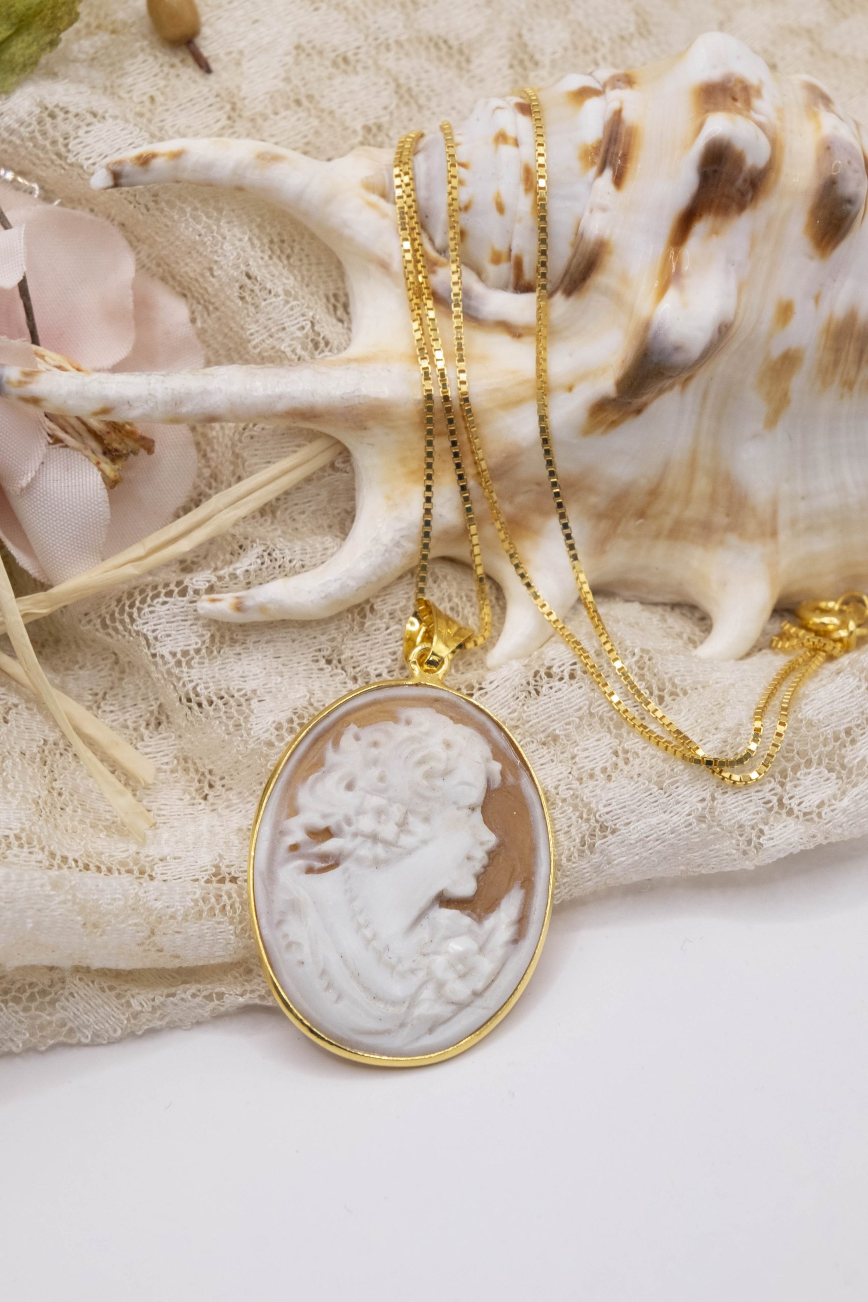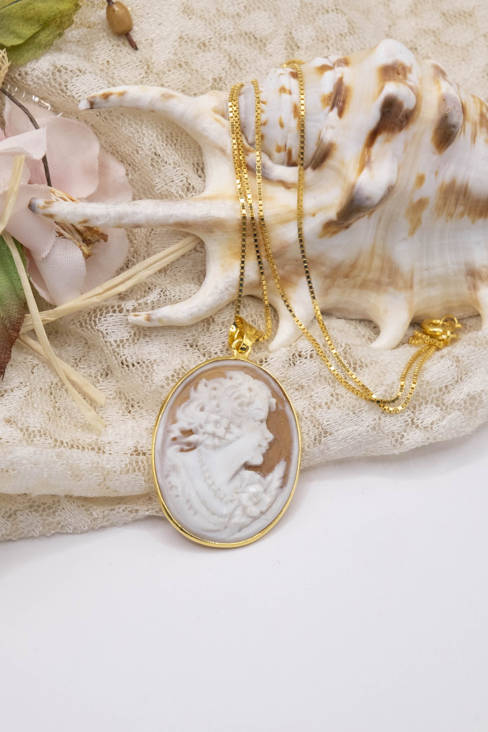 Necklace with genuine Top Quality cameo. The refined cameo (size 3.2 x 2.6 cm) is handmade in Torre del Greco and depicts a lady's face.