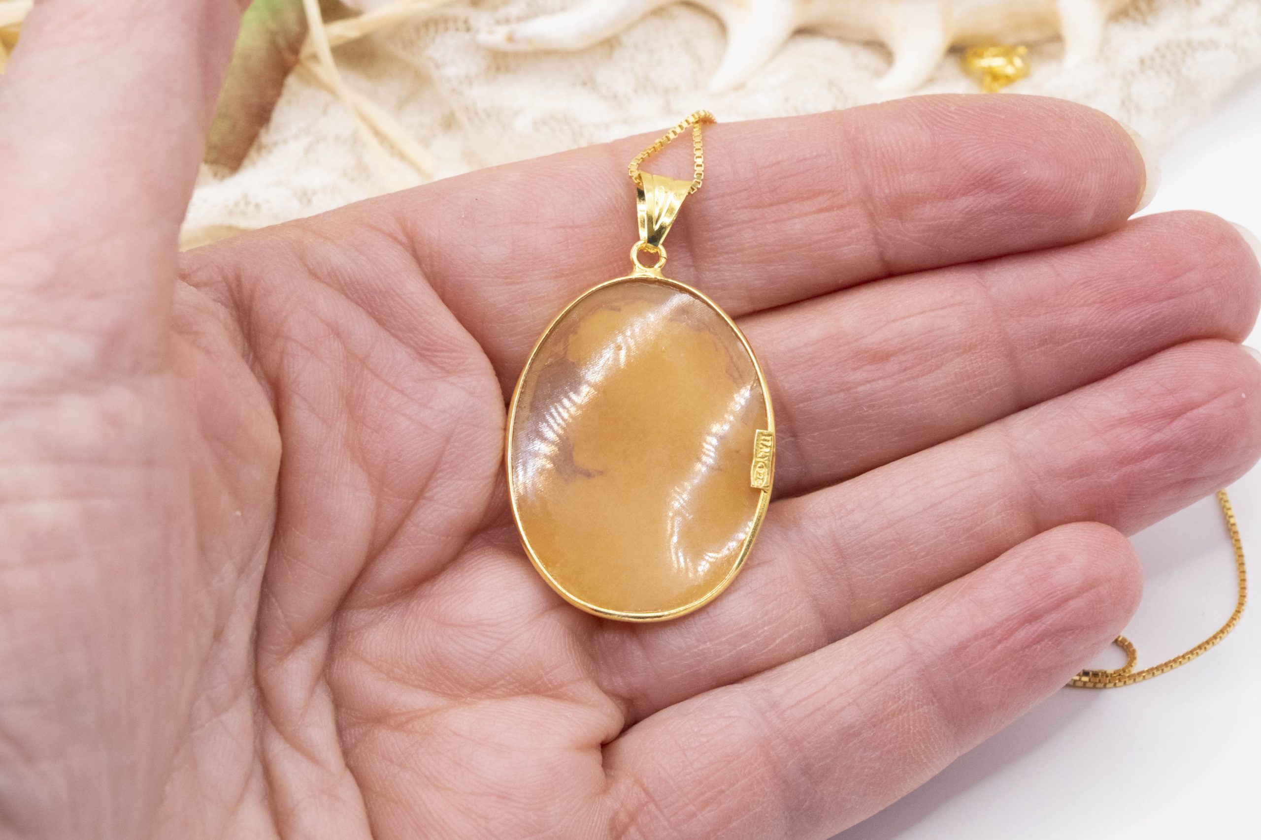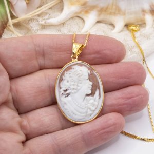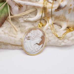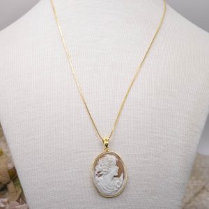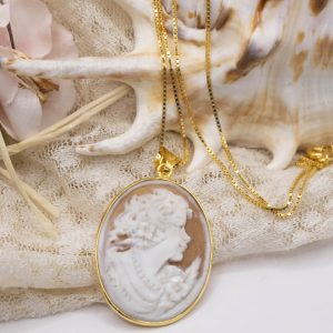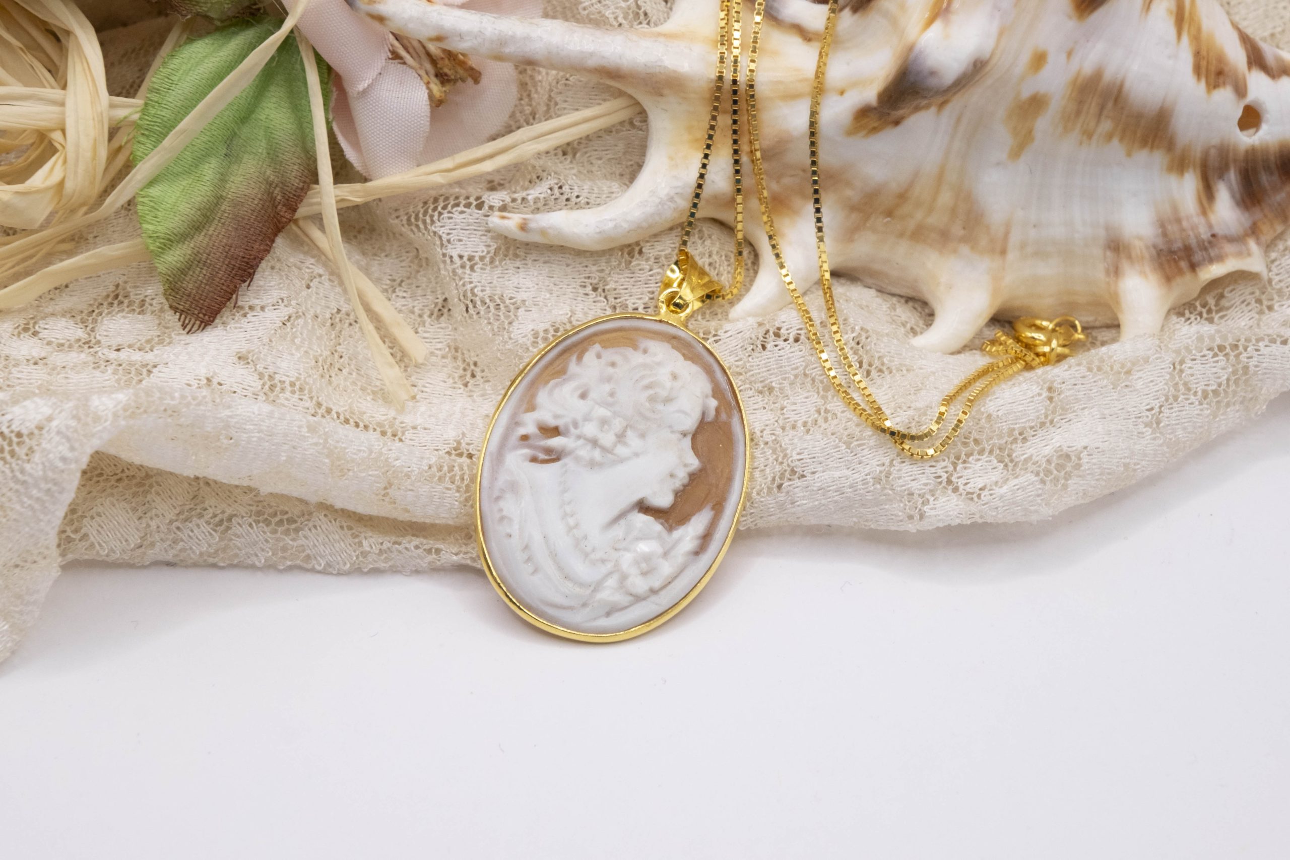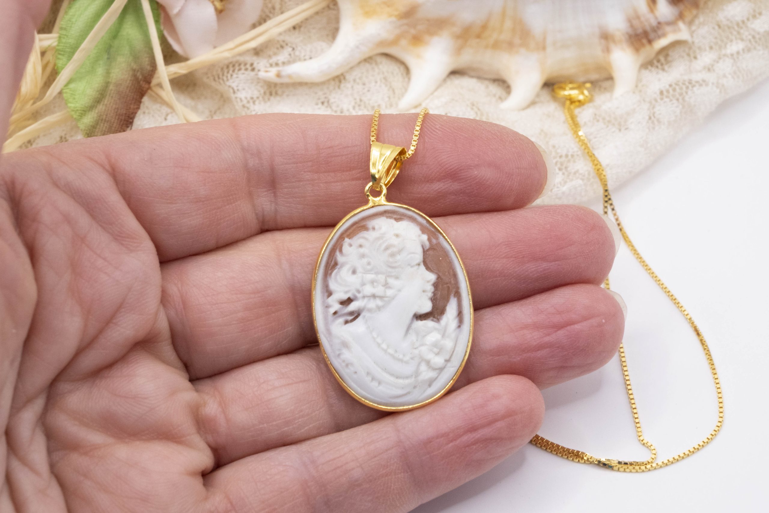 Necklace with genuine Top Quality cameo. The refined cameo (size 3.2 x 2.6 cm) is handmade in Torre del Greco and depicts a lady's face.