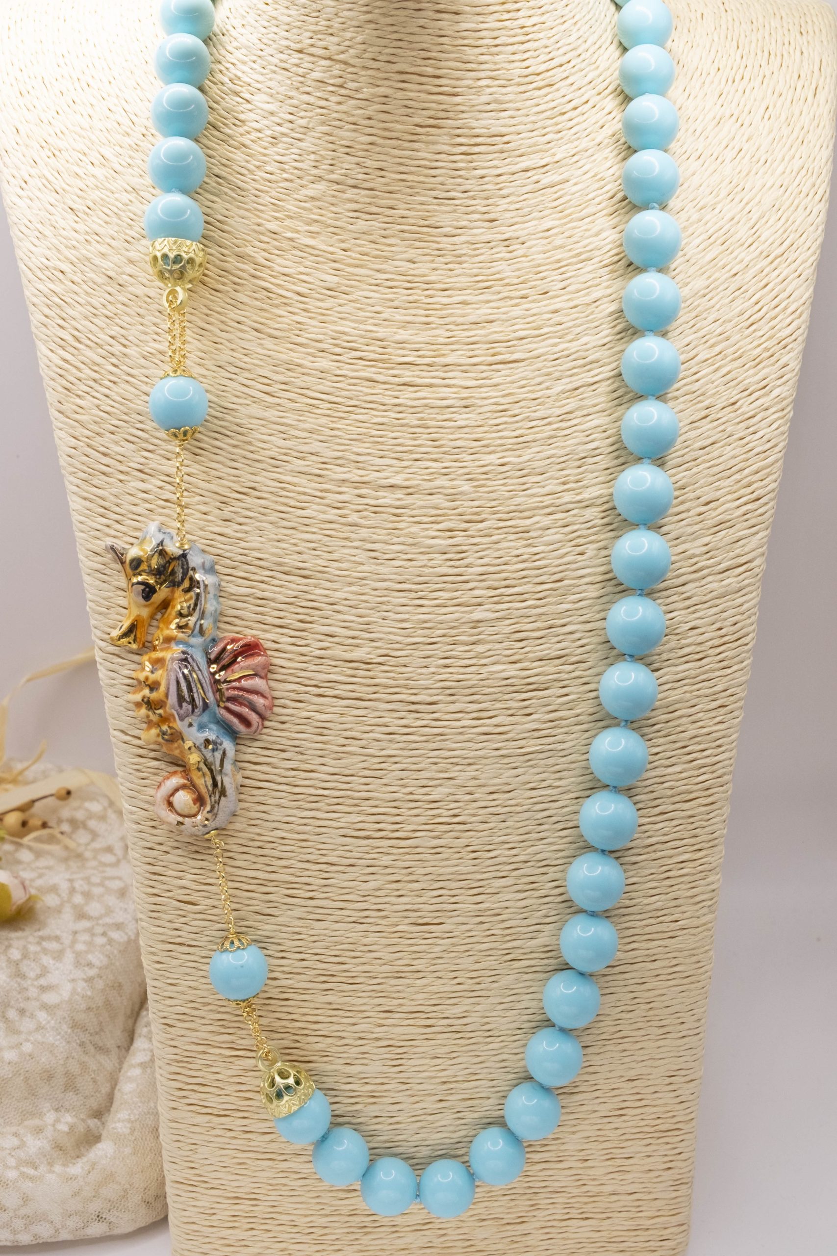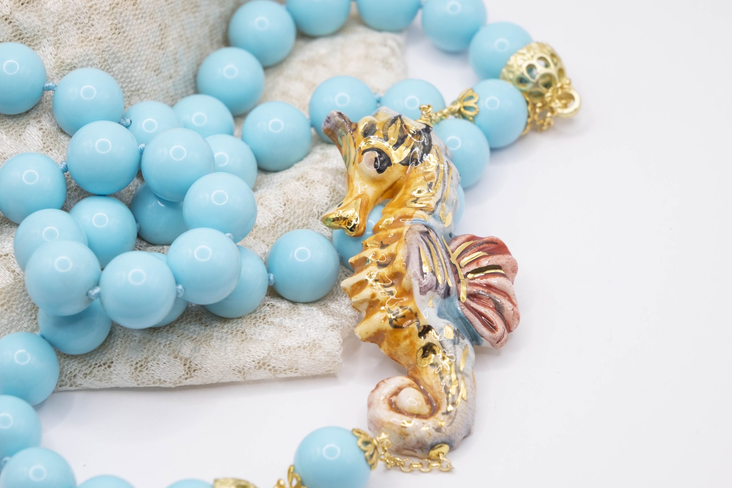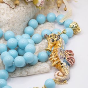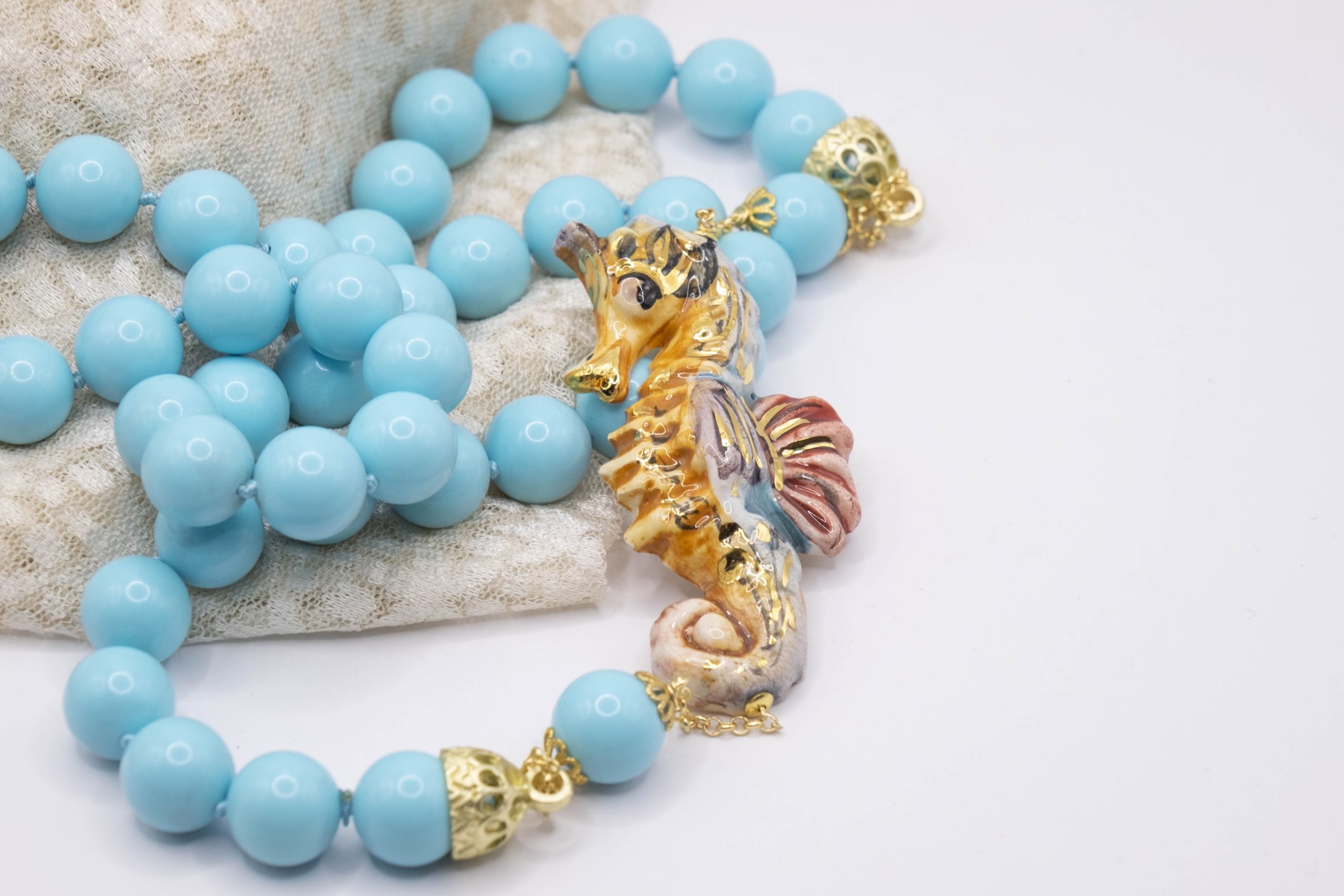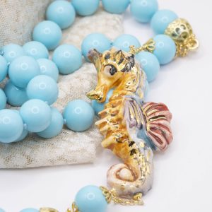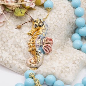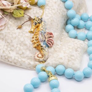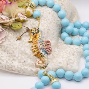 Magnificent necklace, in 14mm turquoise paste, 7.6 x 3.5 cm Caltagirone ceramic seahorse, hand-made and decorated with pure gold.
