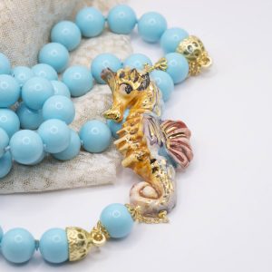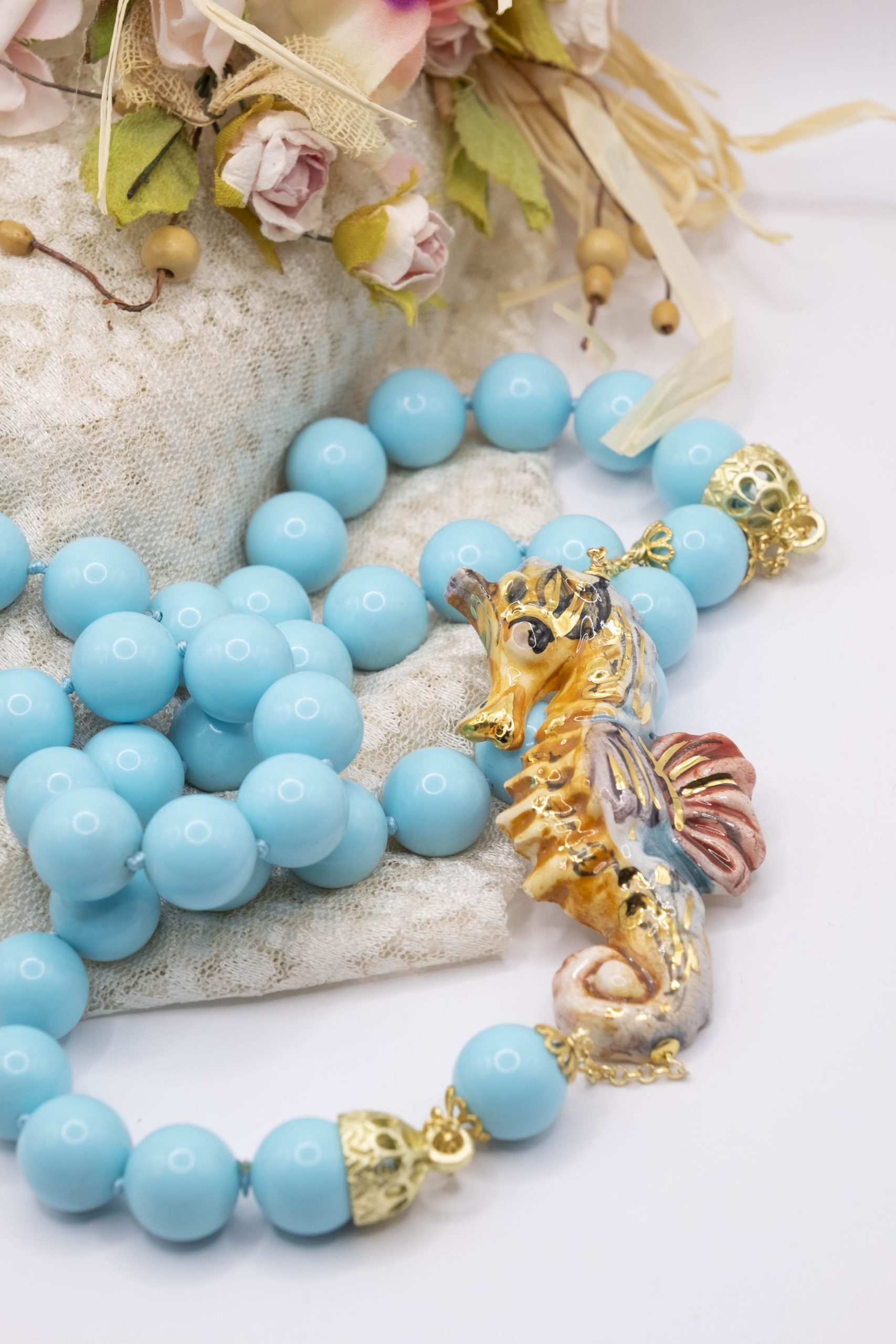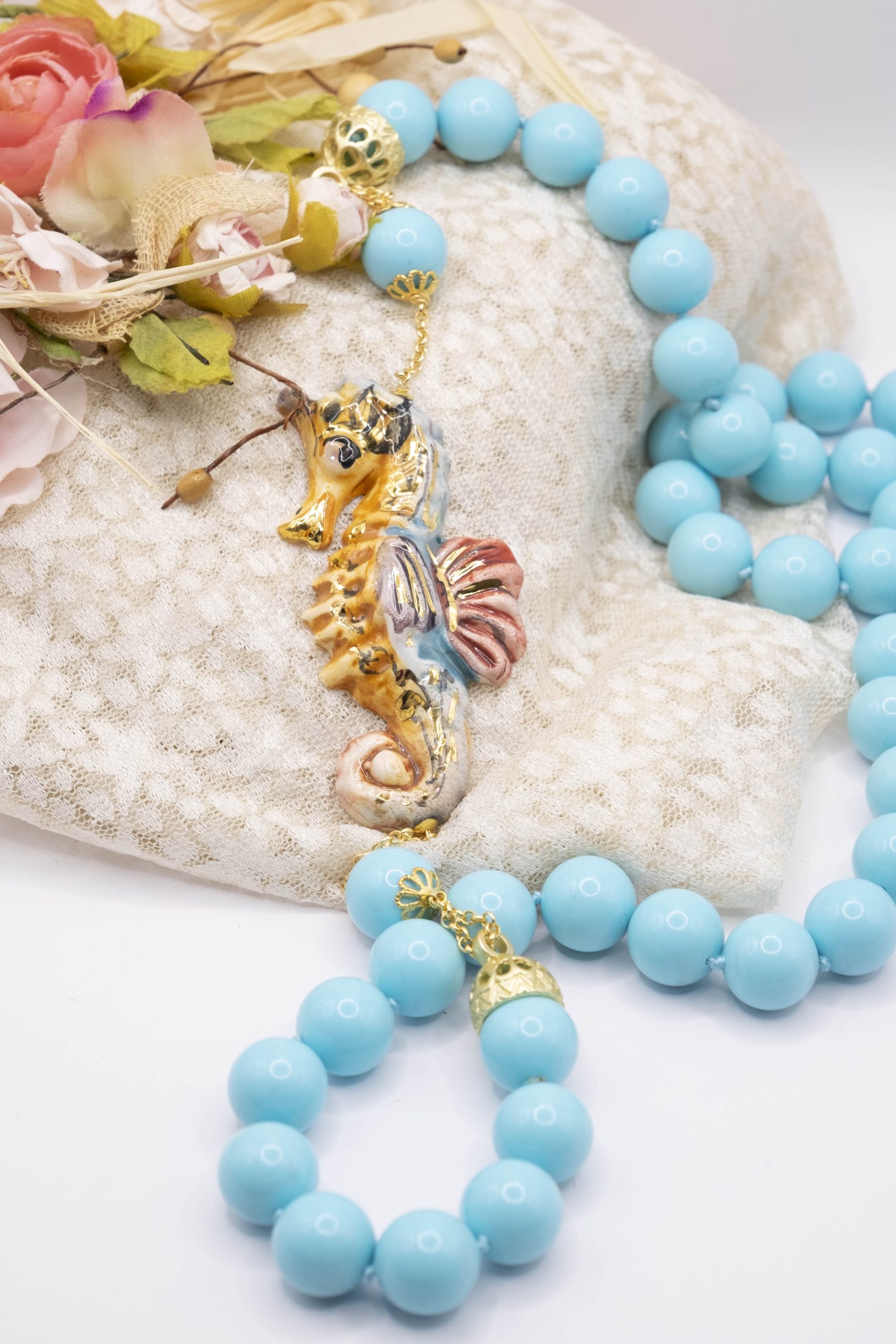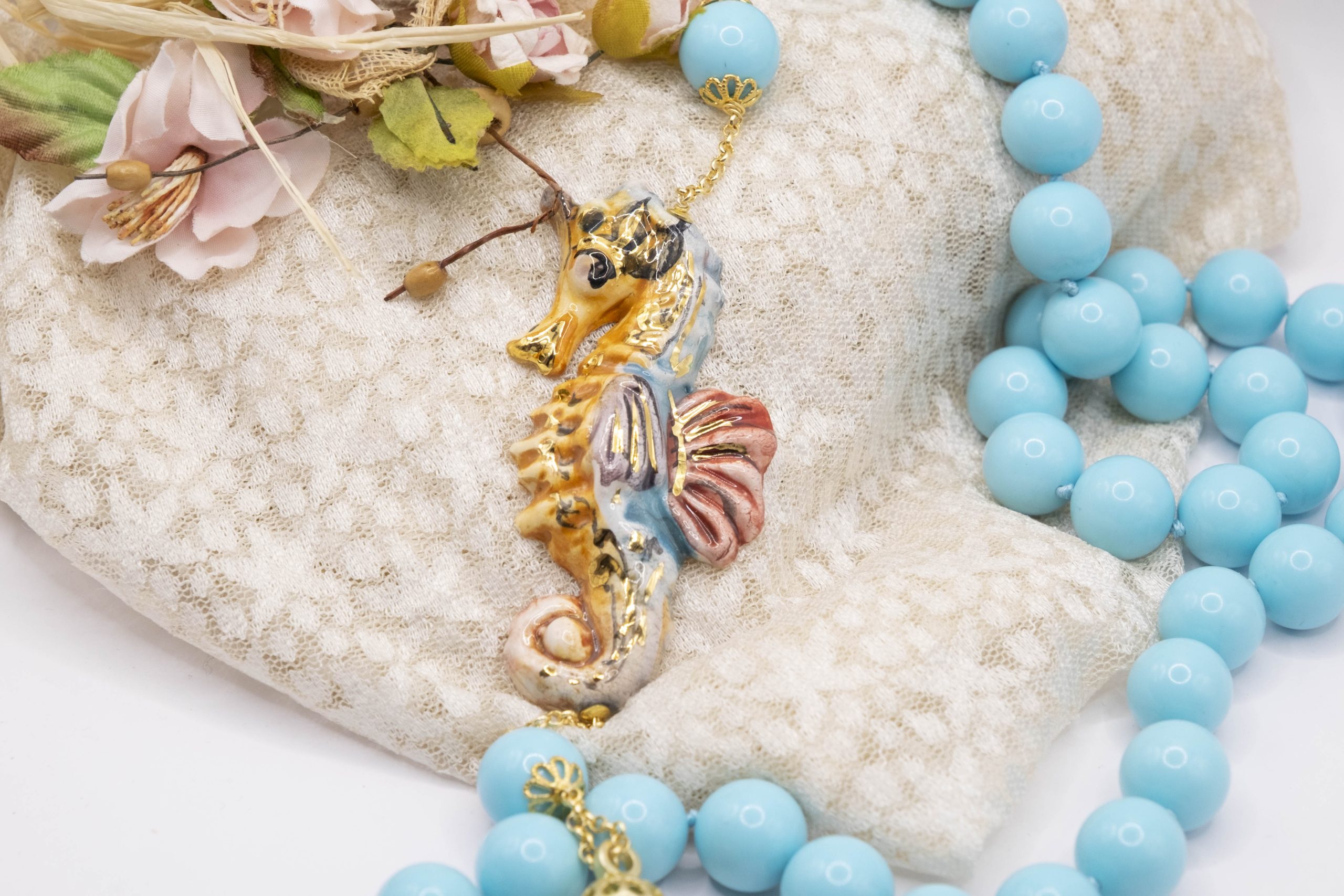 Magnificent necklace, in 14mm turquoise paste, 7.6 x 3.5 cm Caltagirone ceramic seahorse, hand-made and decorated with pure gold.